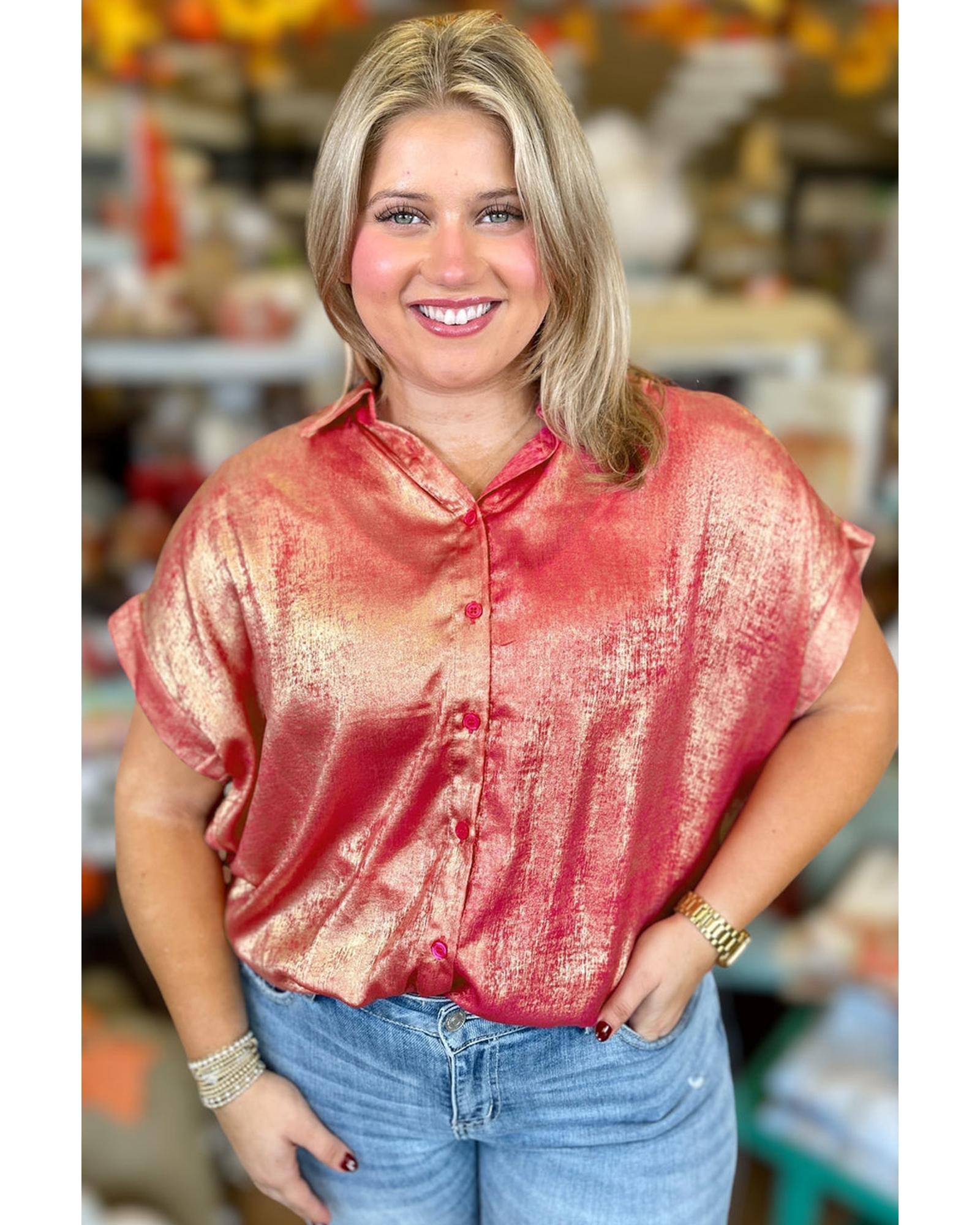 Rose Red Plus Size Metallic Sheen Short Sleeve Button Up Shirt – 3X
