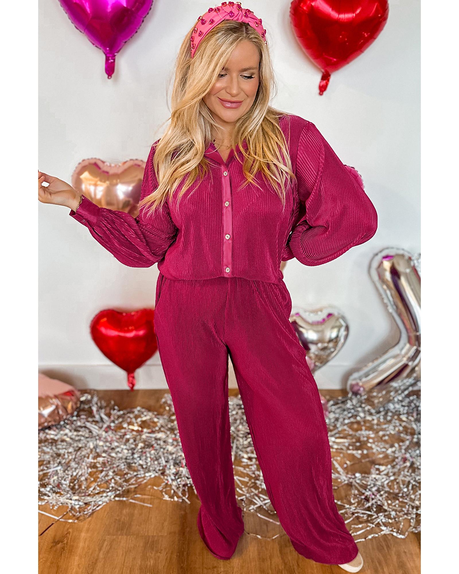 Rose Red Plus Size Ribbed Long Sleeve Shirt and Pants Pajama Set – 1X
