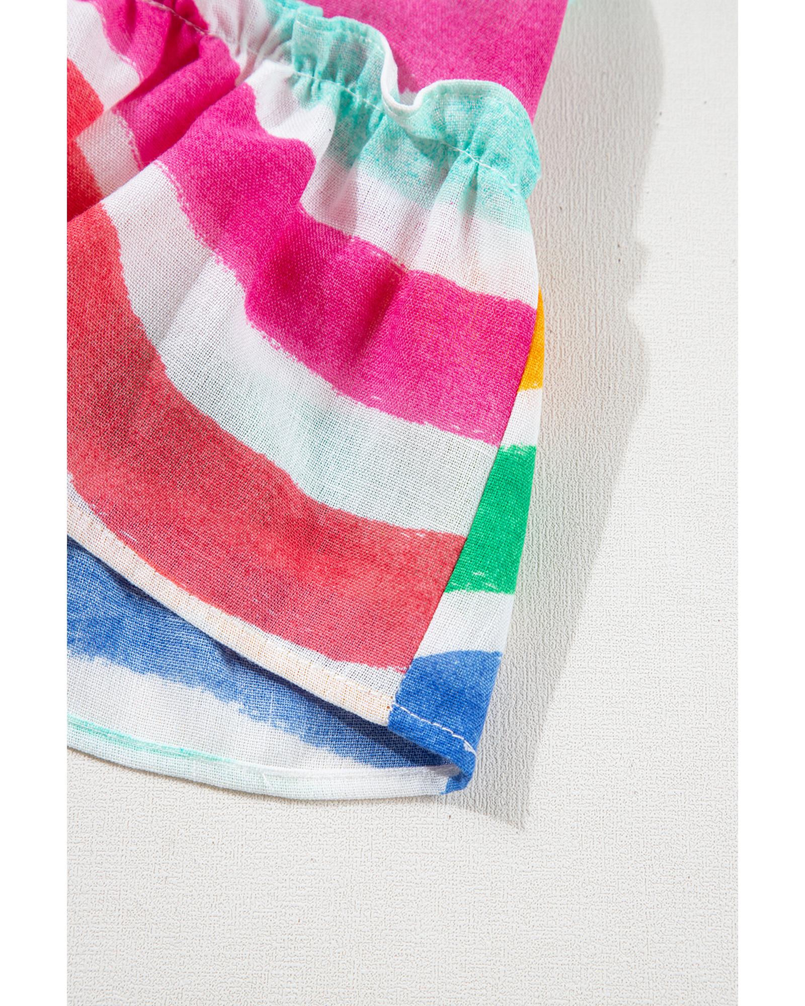 - Rose Red Rainbow Stripes Ruffled Hem Drawstring V Neck Tank Top
