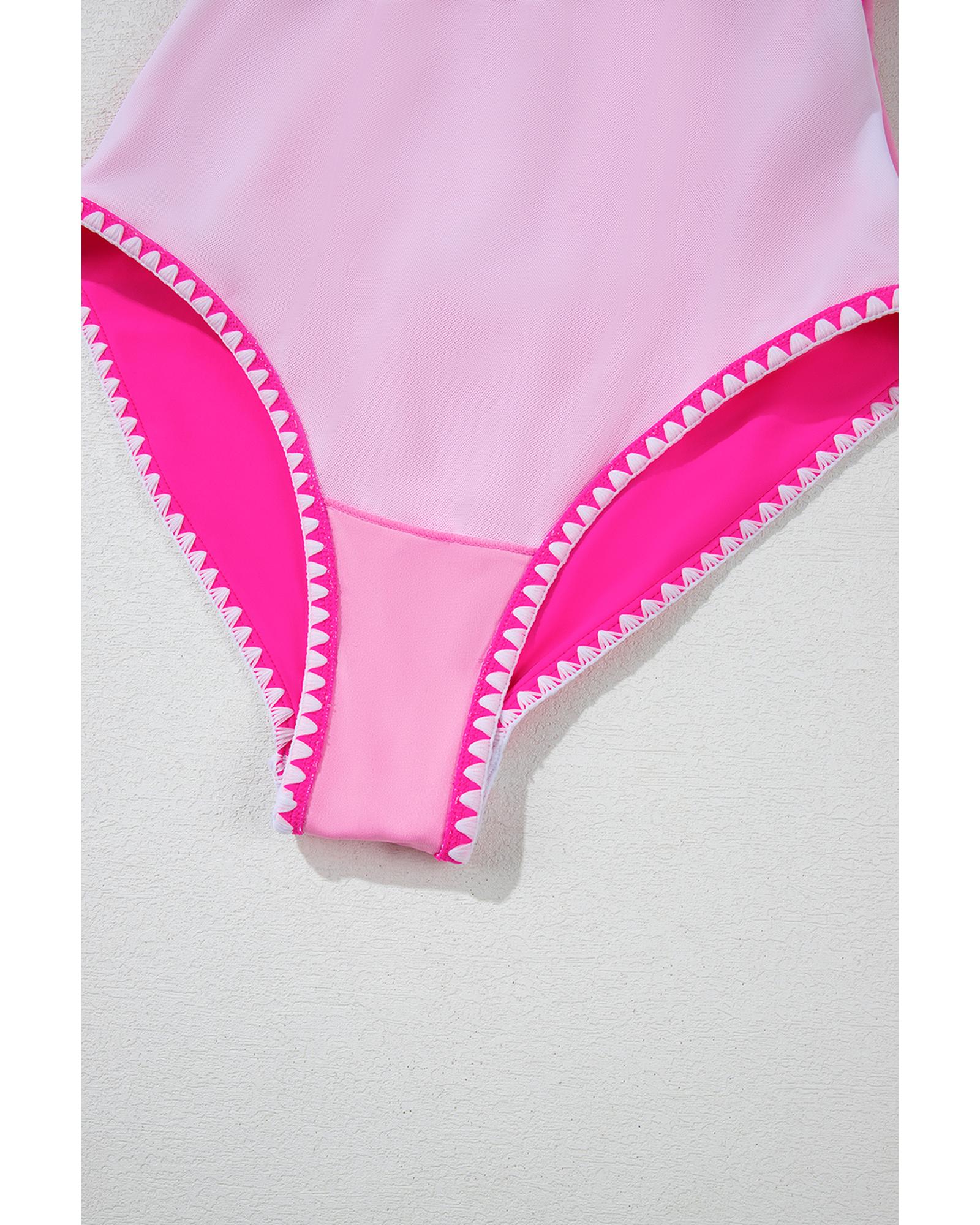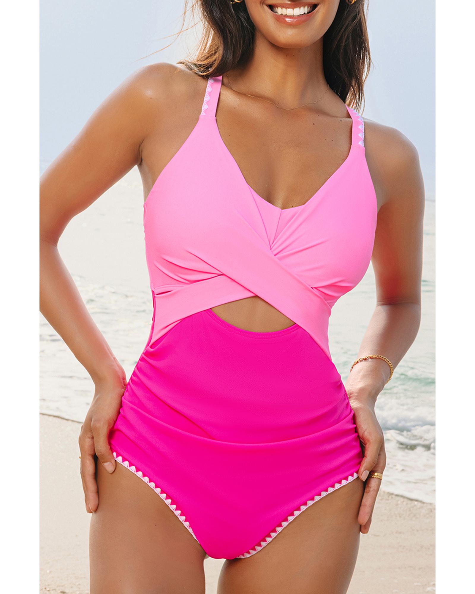 Rose Red Ric Rac Trim Contrasted Patchwork Cutout One Piece Swimsuit – S