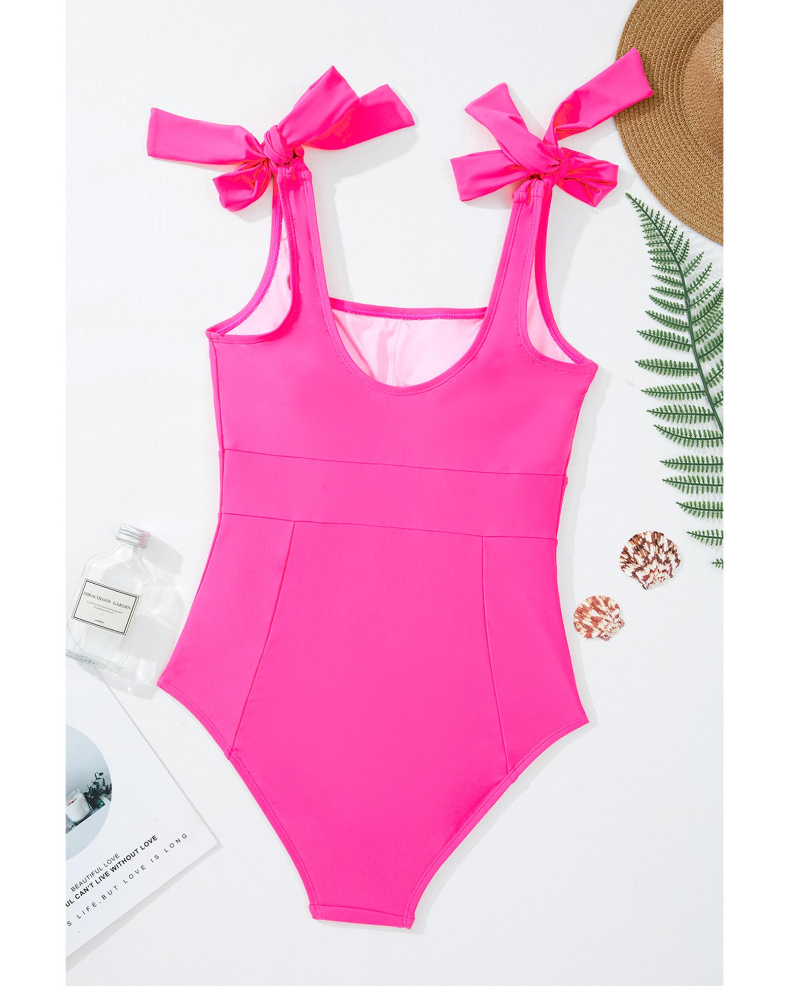 • Rose Red Square Neck Knotted Shoulder Open Back One Piece Swimsuit