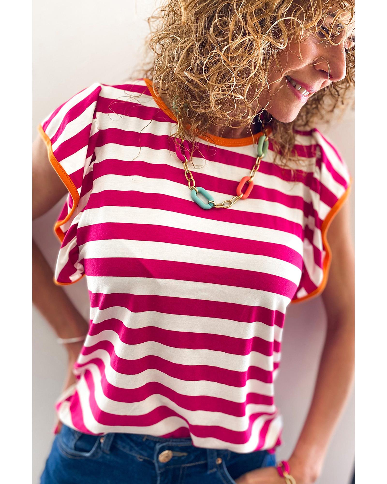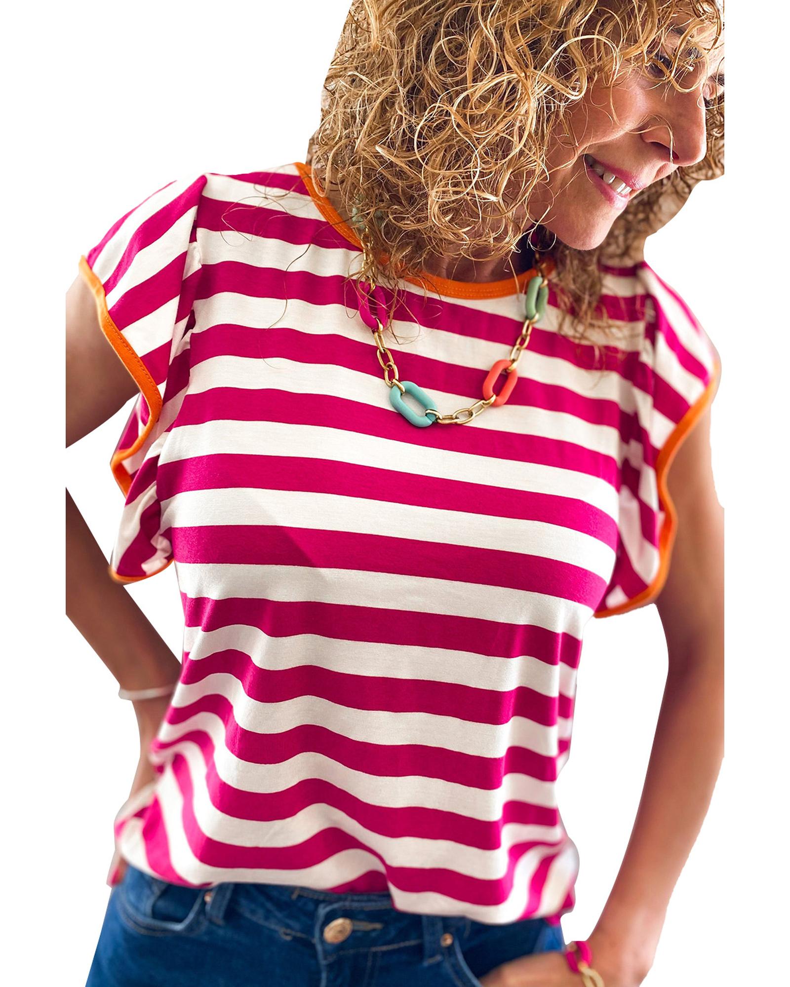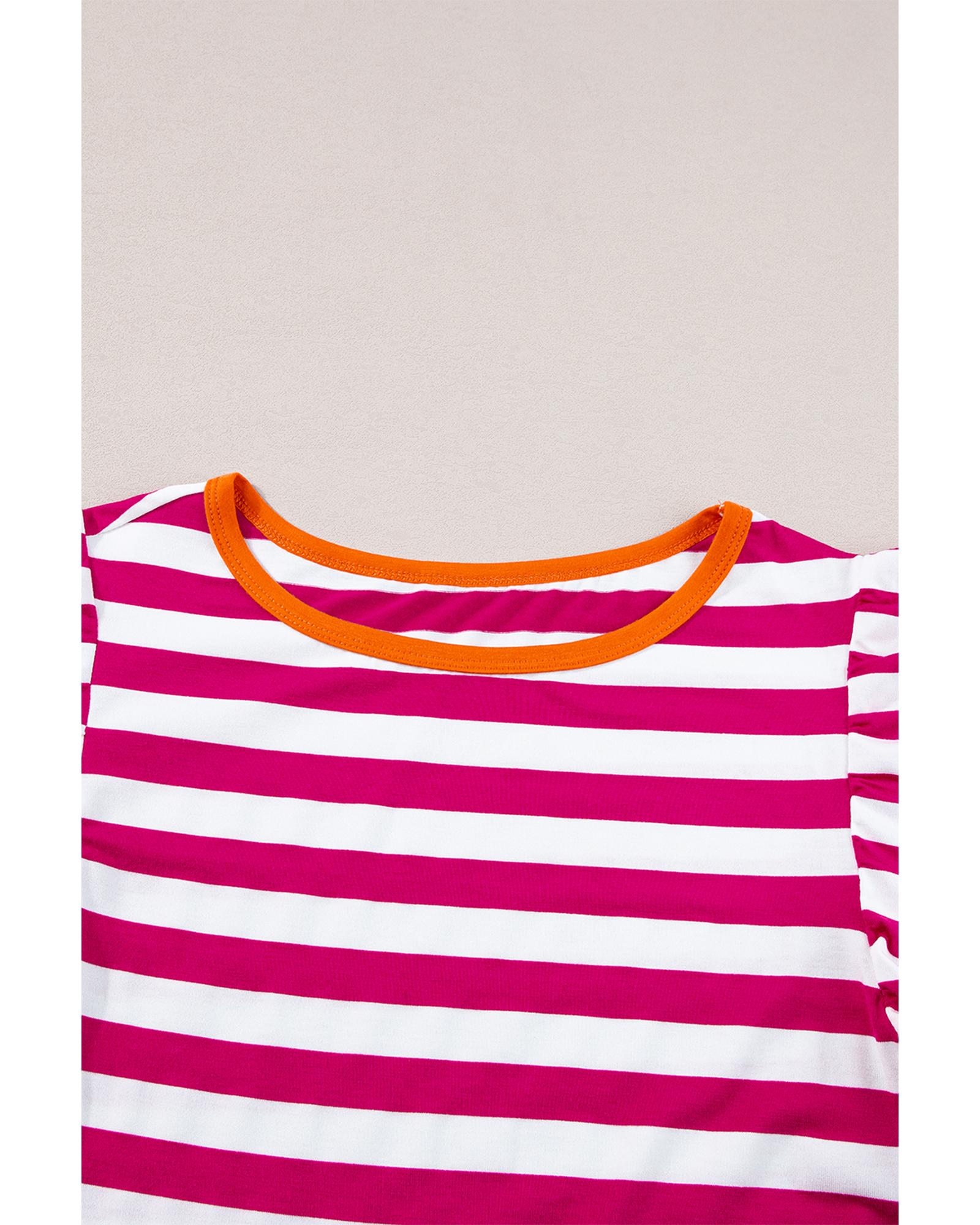 Rose Red Striped Ruffle Sleeve Crew Neck Blouse – L