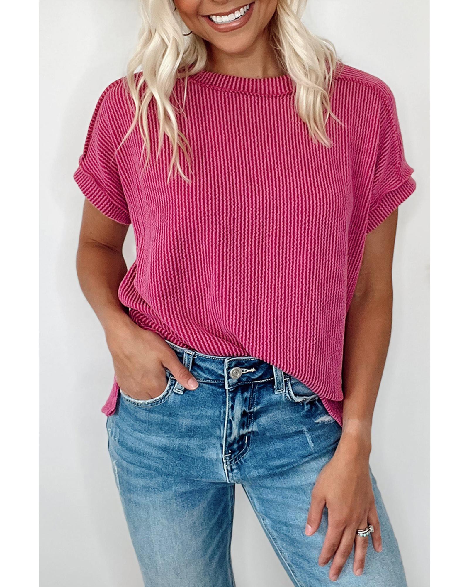 Rose Red Textured Knit Exposed Stitching T-shirt – M