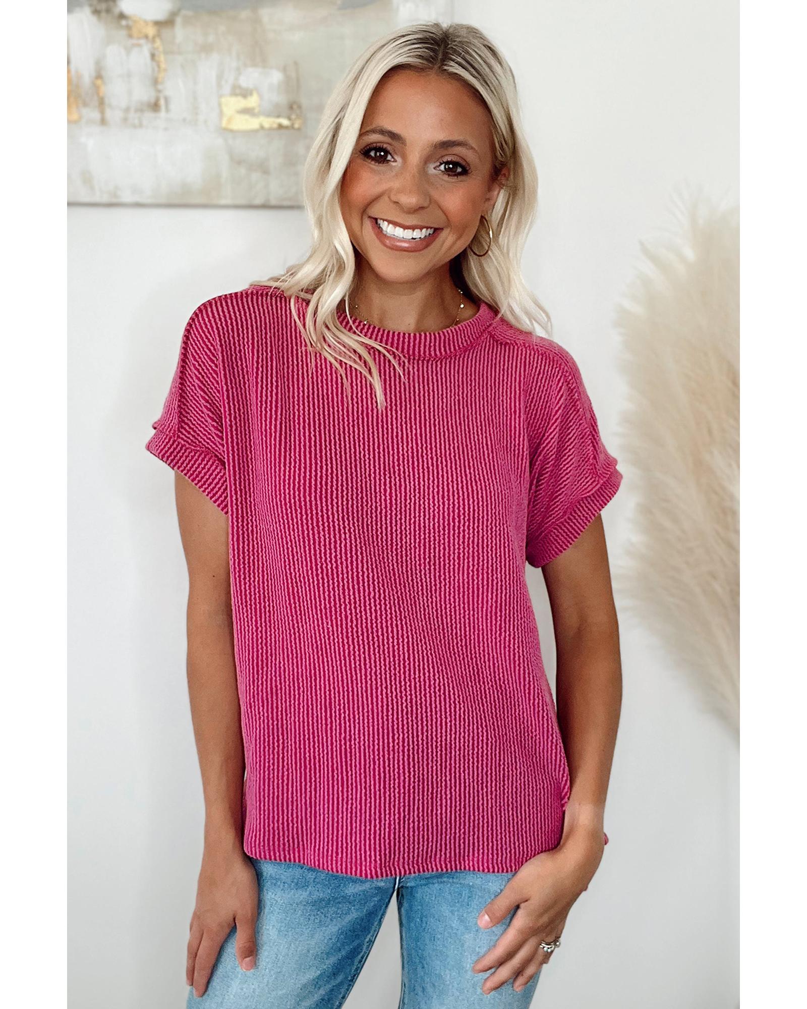 Rose Red Textured Knit Exposed Stitching T-shirt – S
