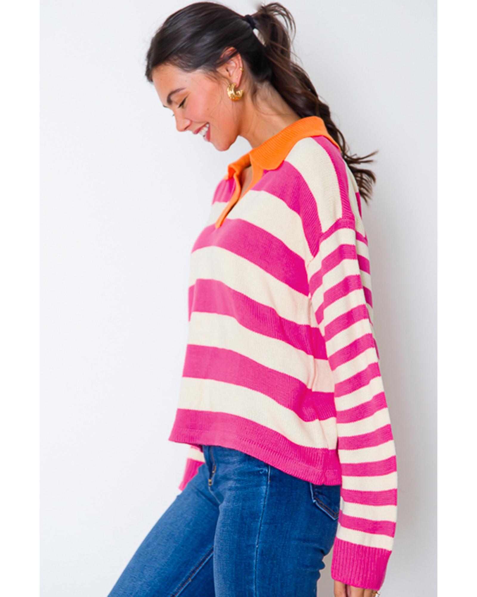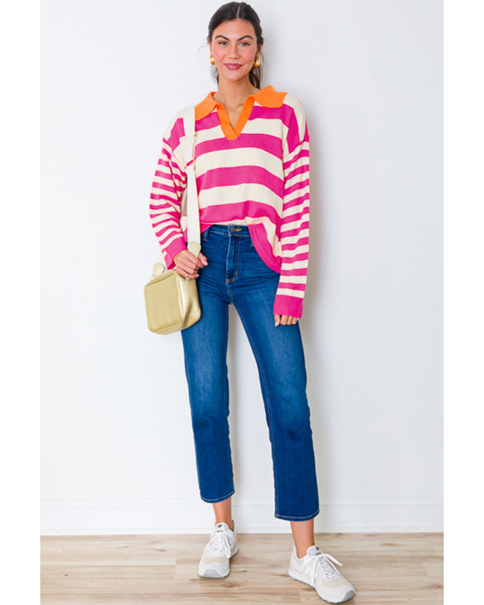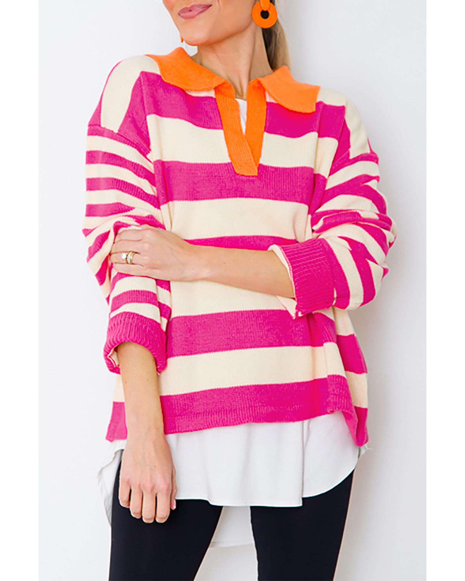 Rose Stripe Color Block Collared V Neck Drop Shoulder Sweater – XL