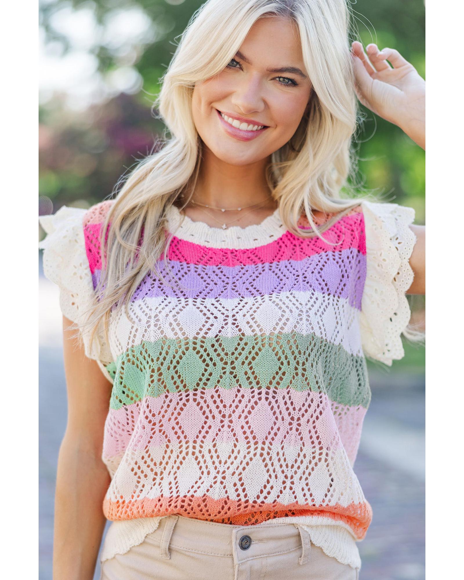 Rose Stripe Colorblock Hollowed Knit Scallop Edge Sweater Vest – M
