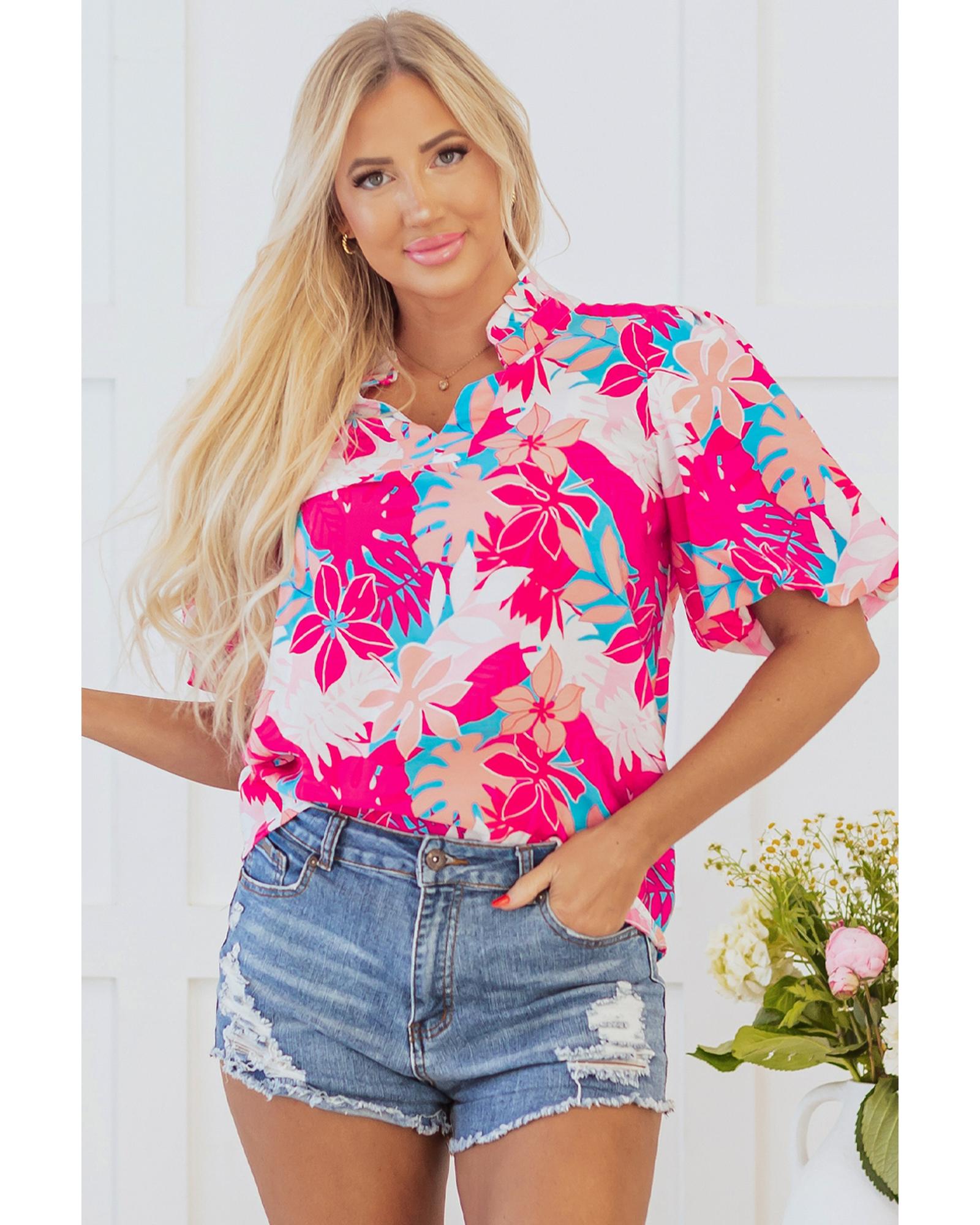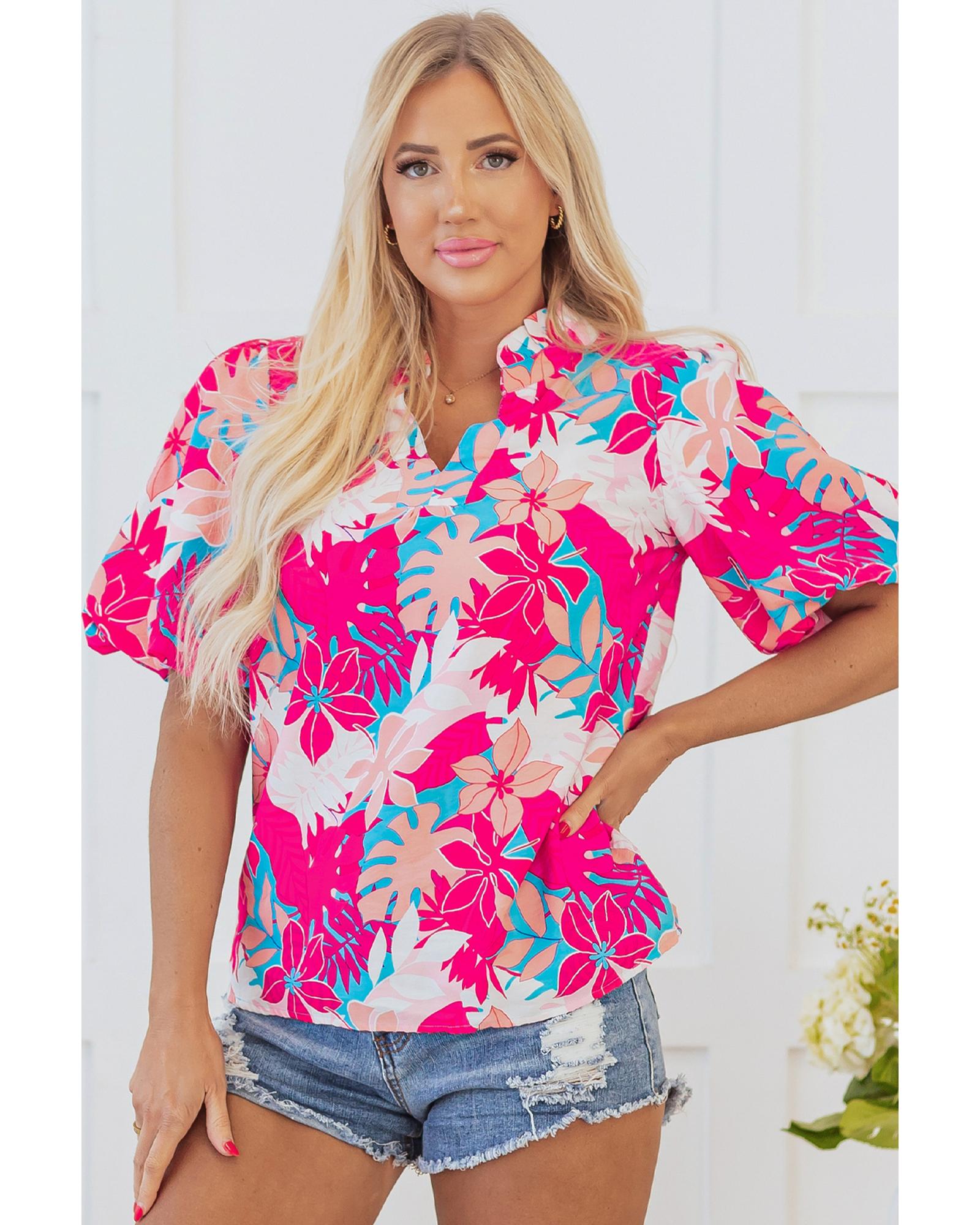 Rose Tropical Plant Printed V Neck Puff Sleeve Blouse – XL