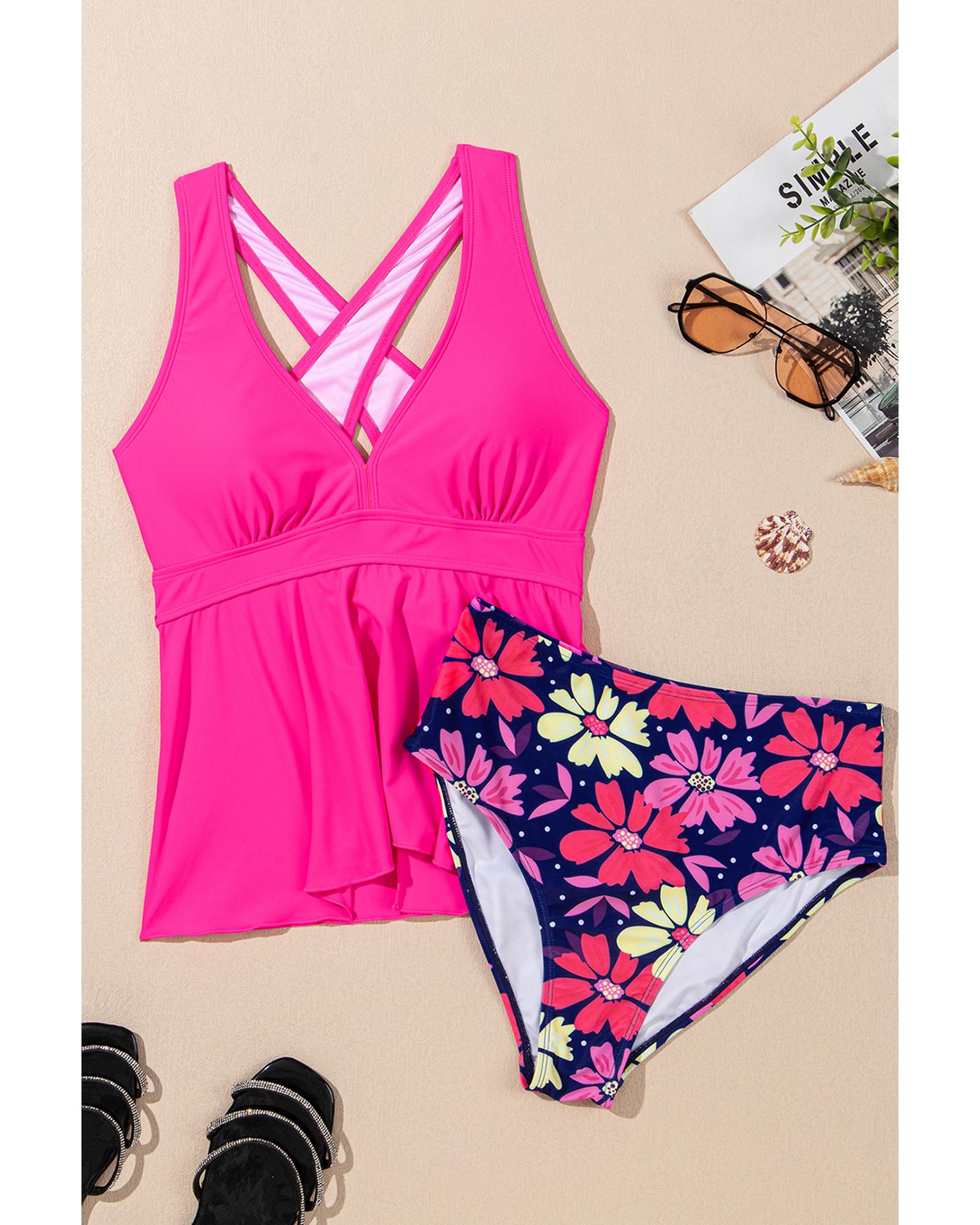 Rose V Neck Ruffled Hem Floral Bottom Tankini Set – M