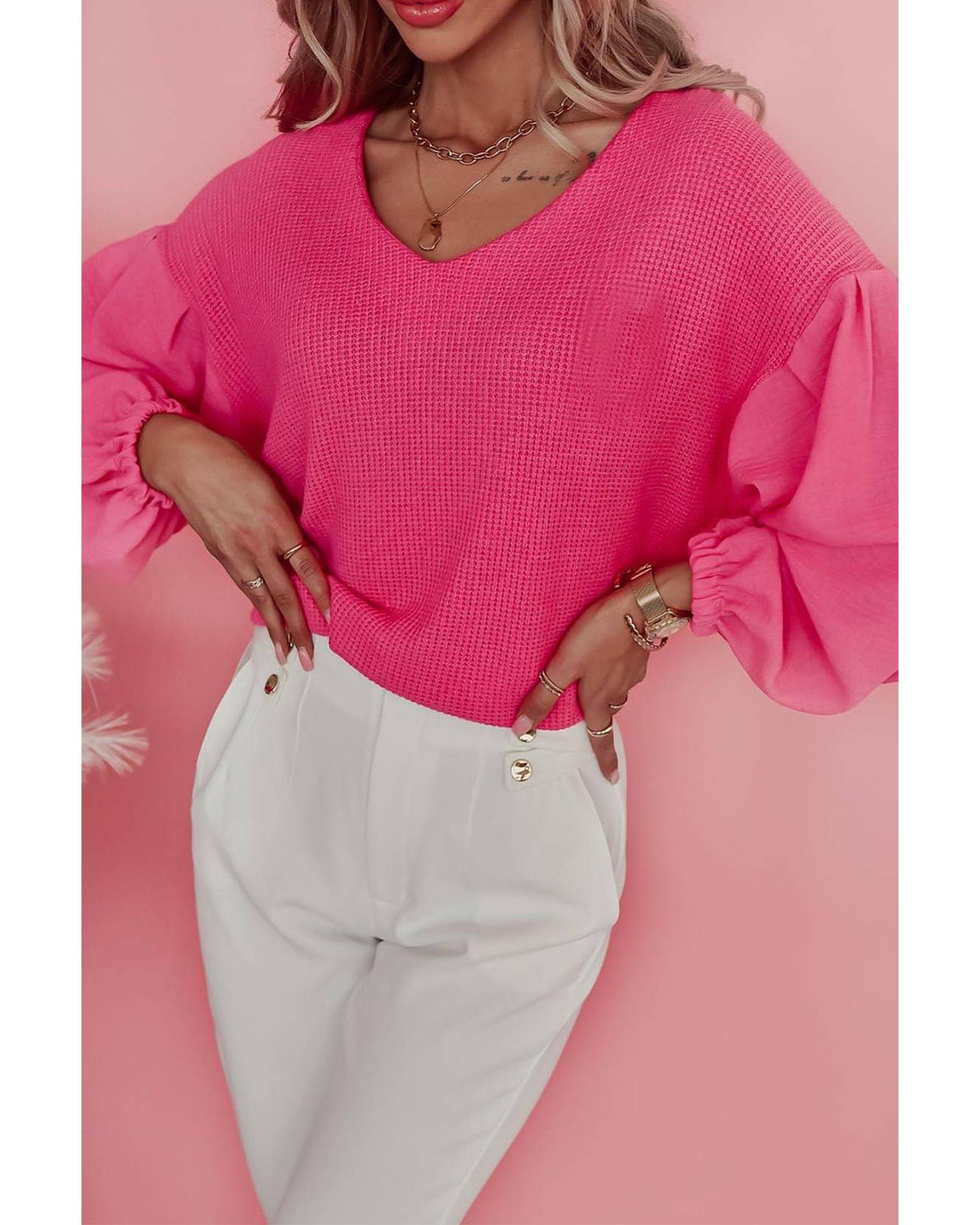 Rose Waffle Knit Balloon Sleeve Splicing V Neck Top – XL