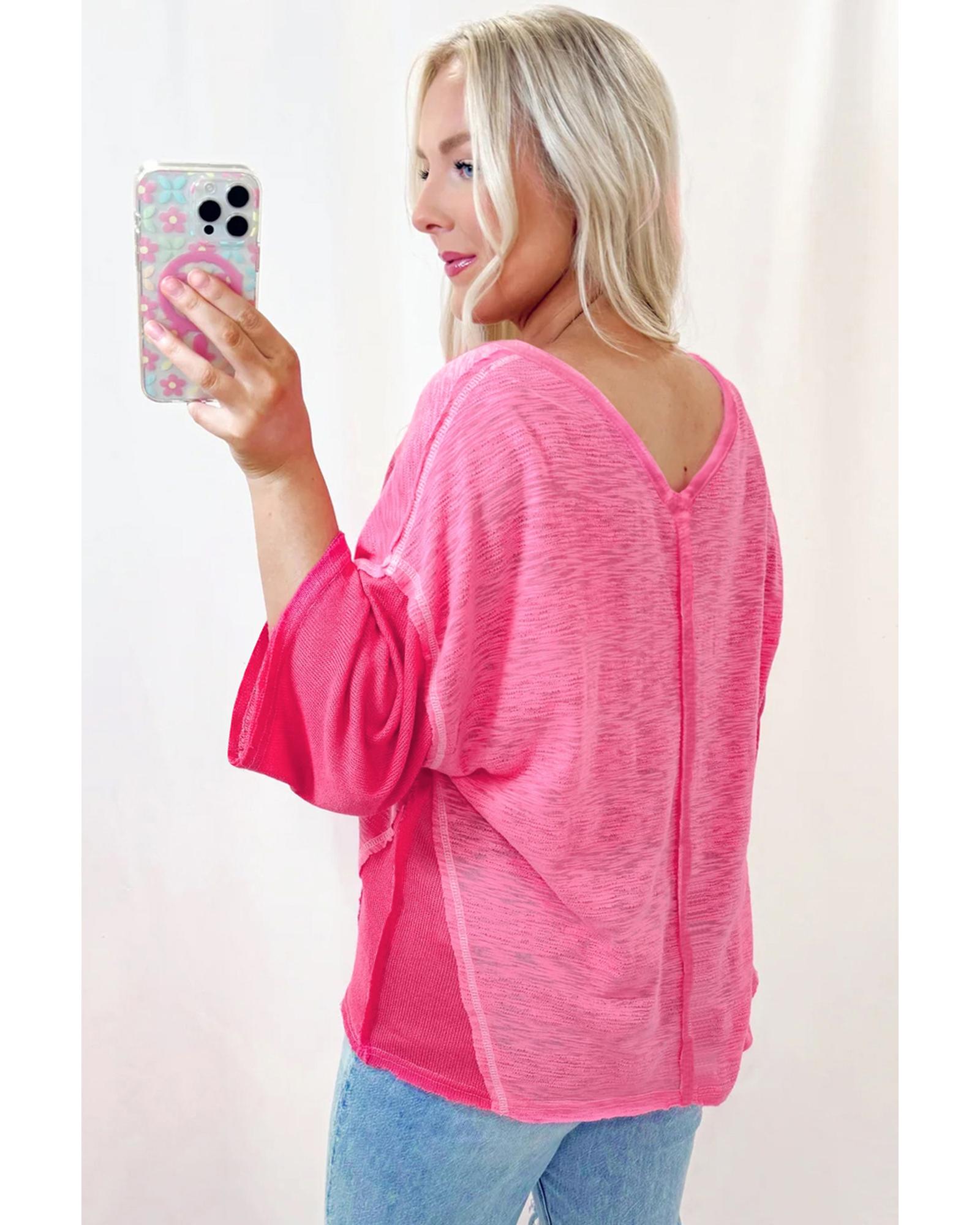 Sachet Pink Contrast Patchwork 3/4 Sleeve V Neck Loose Blouse – L