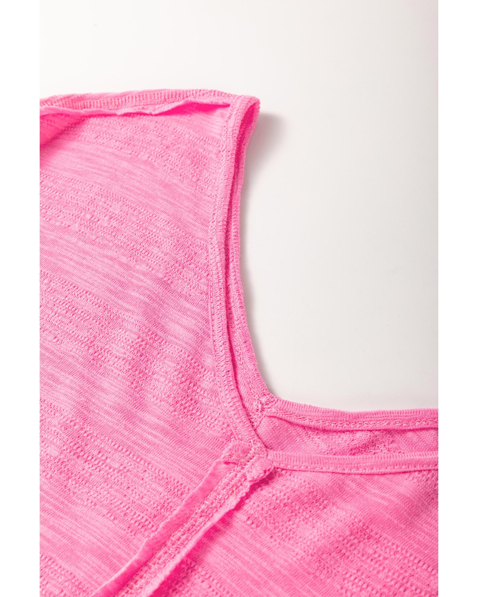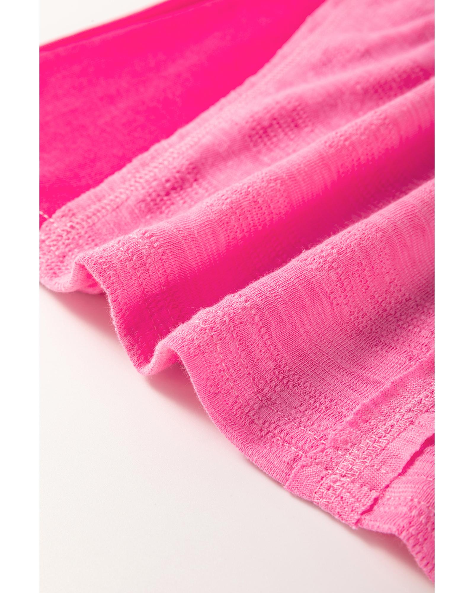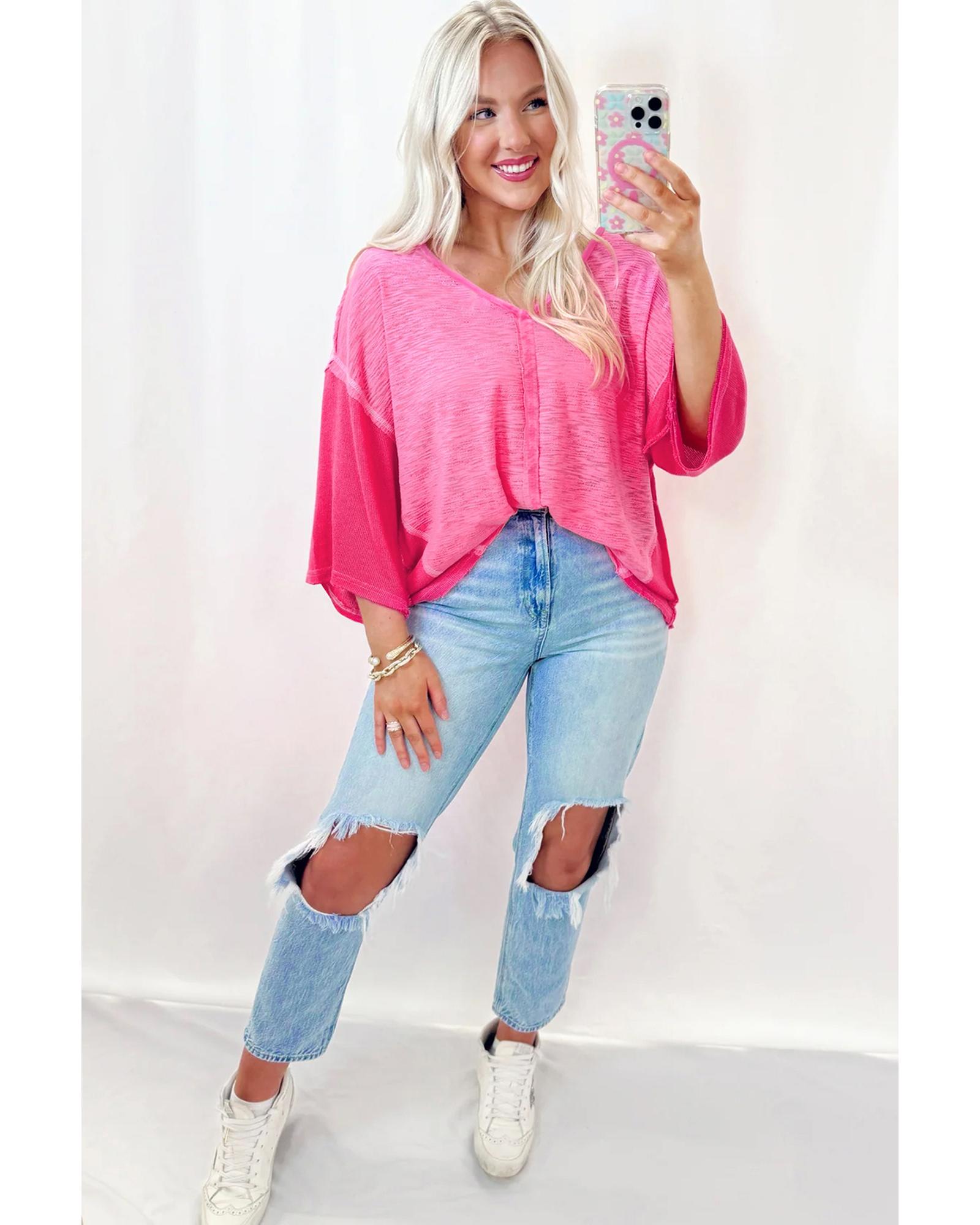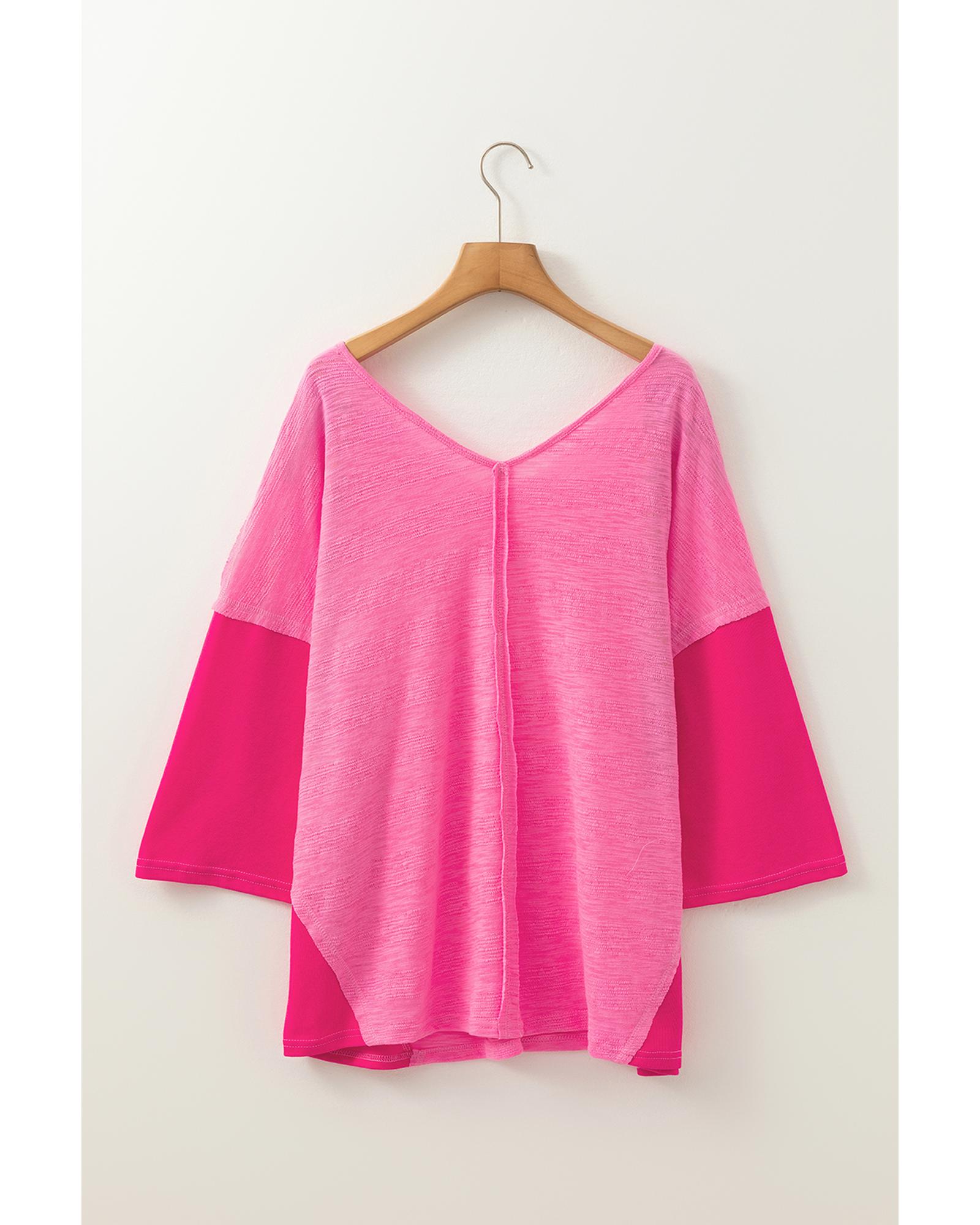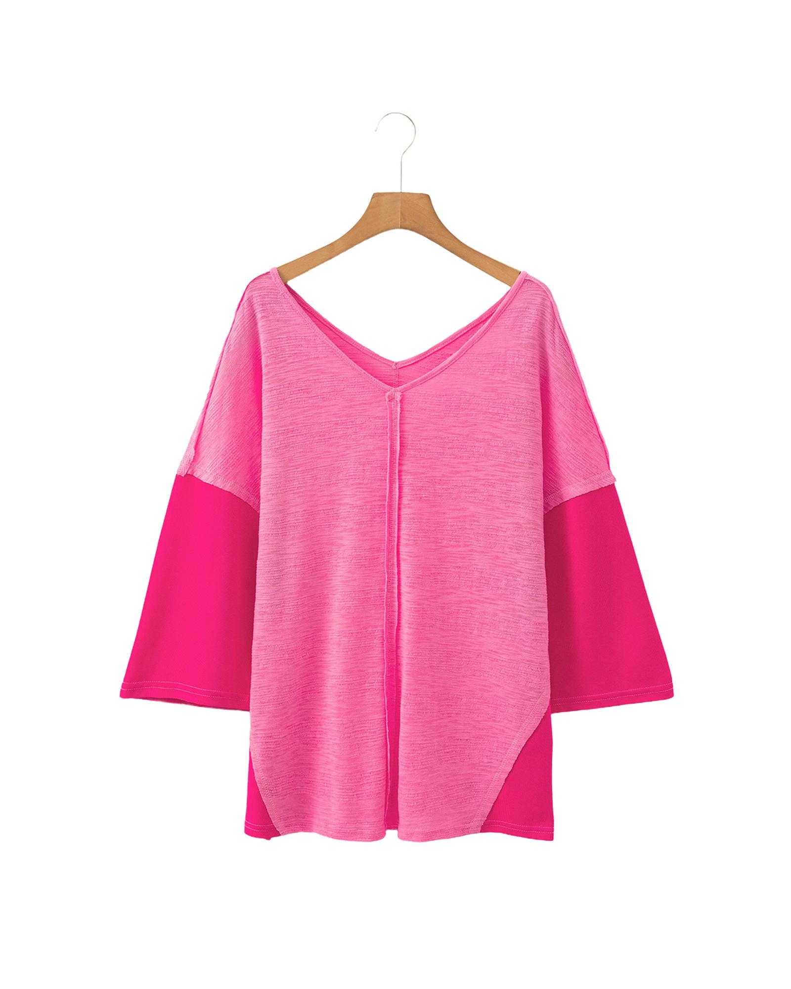 Sachet Pink Contrast Patchwork 3/4 Sleeve V Neck Loose Blouse – S