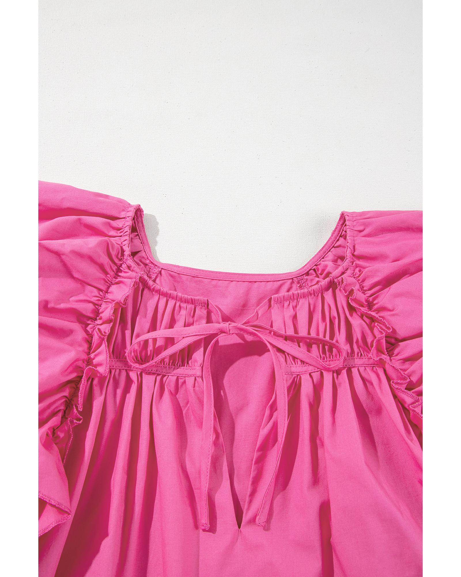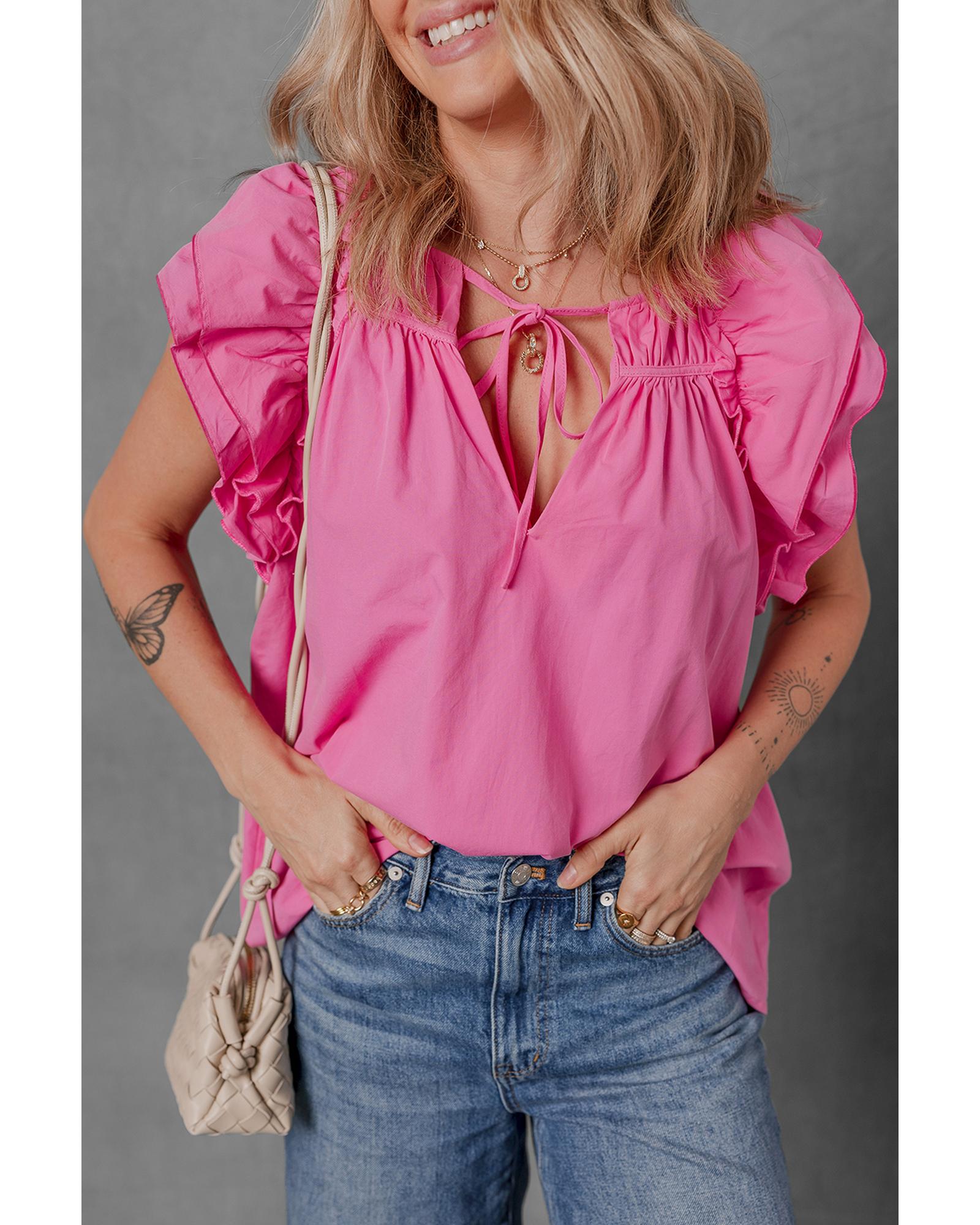 - Sachet Pink Shirred Yoke Lace up V Neck Ruffled Sleeve Blouse