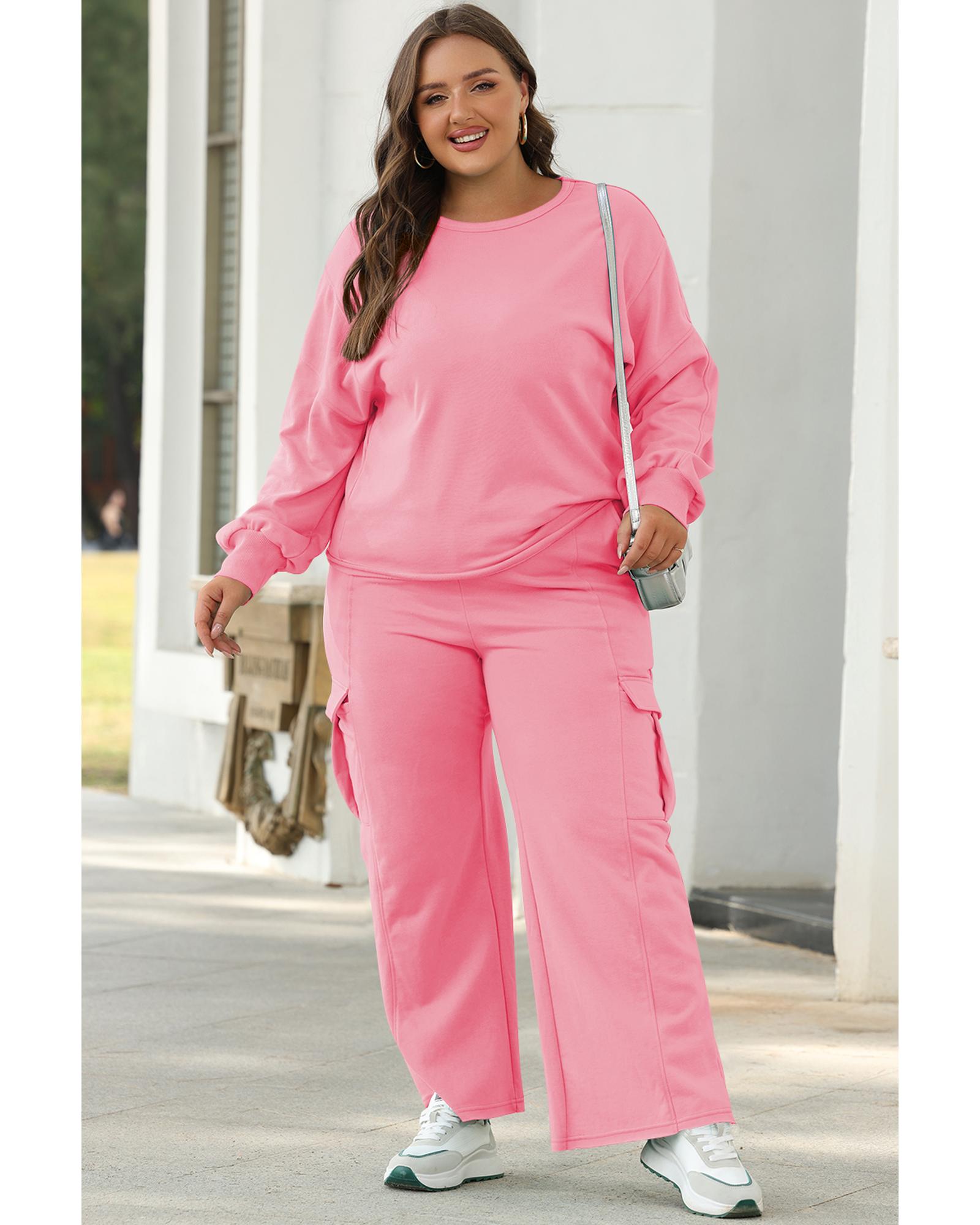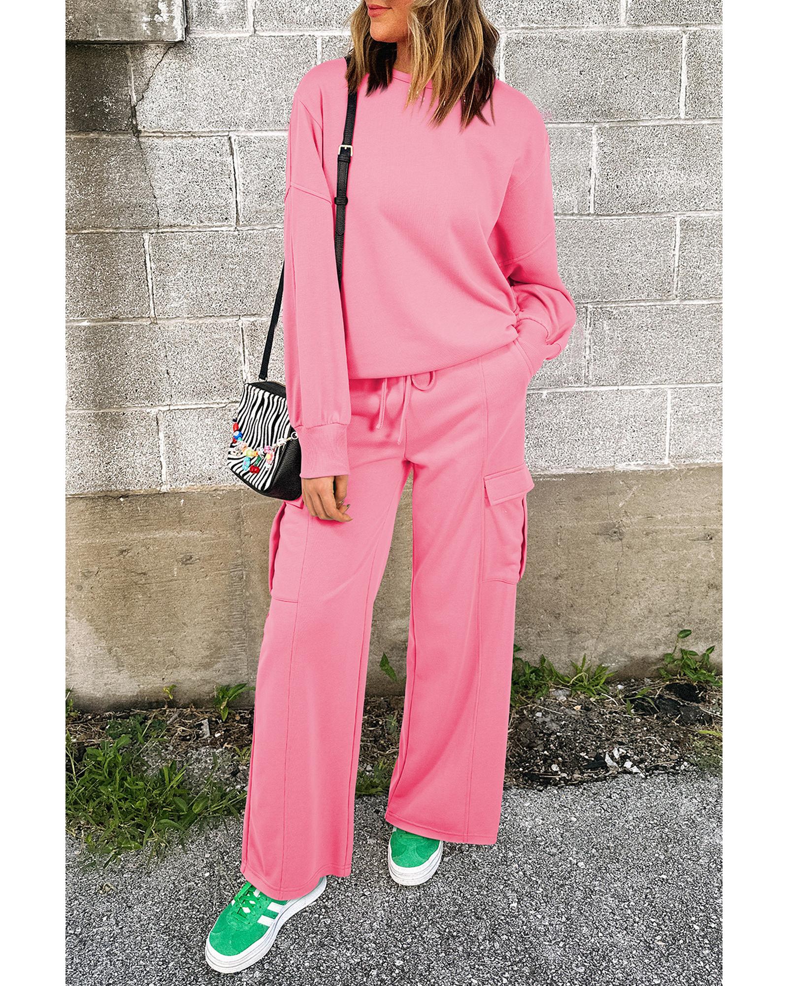 Sachet Pink Solid Color Patchwork Pullover Top and Cargo Pants Set – L