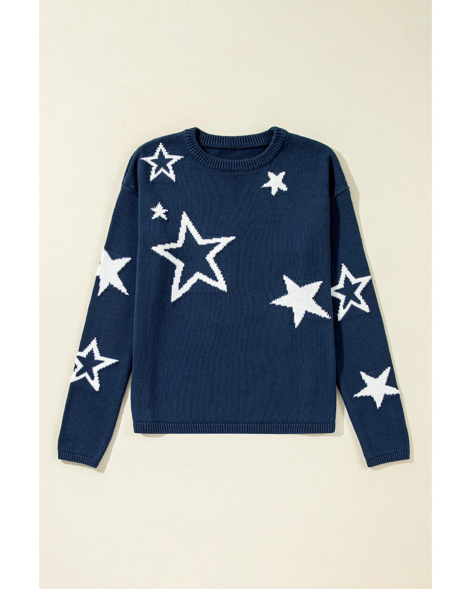 Sail Blue Star Pattern Drop Shoulder Knitted Sweater – M