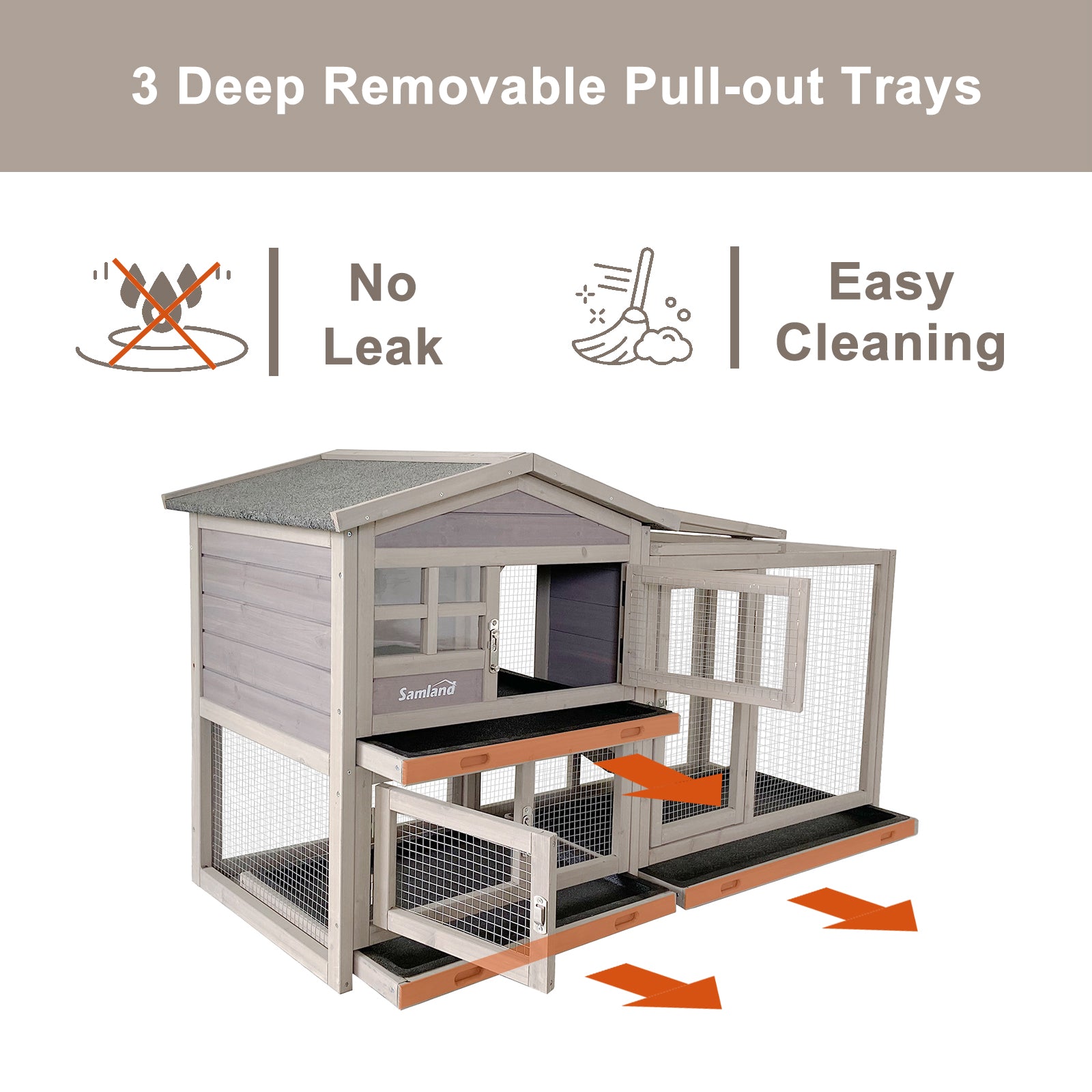 EASY CLEANING : The hutch is equipped with 3 DEEP removable pull-out trays, designed for cleaning. NO LEAK!