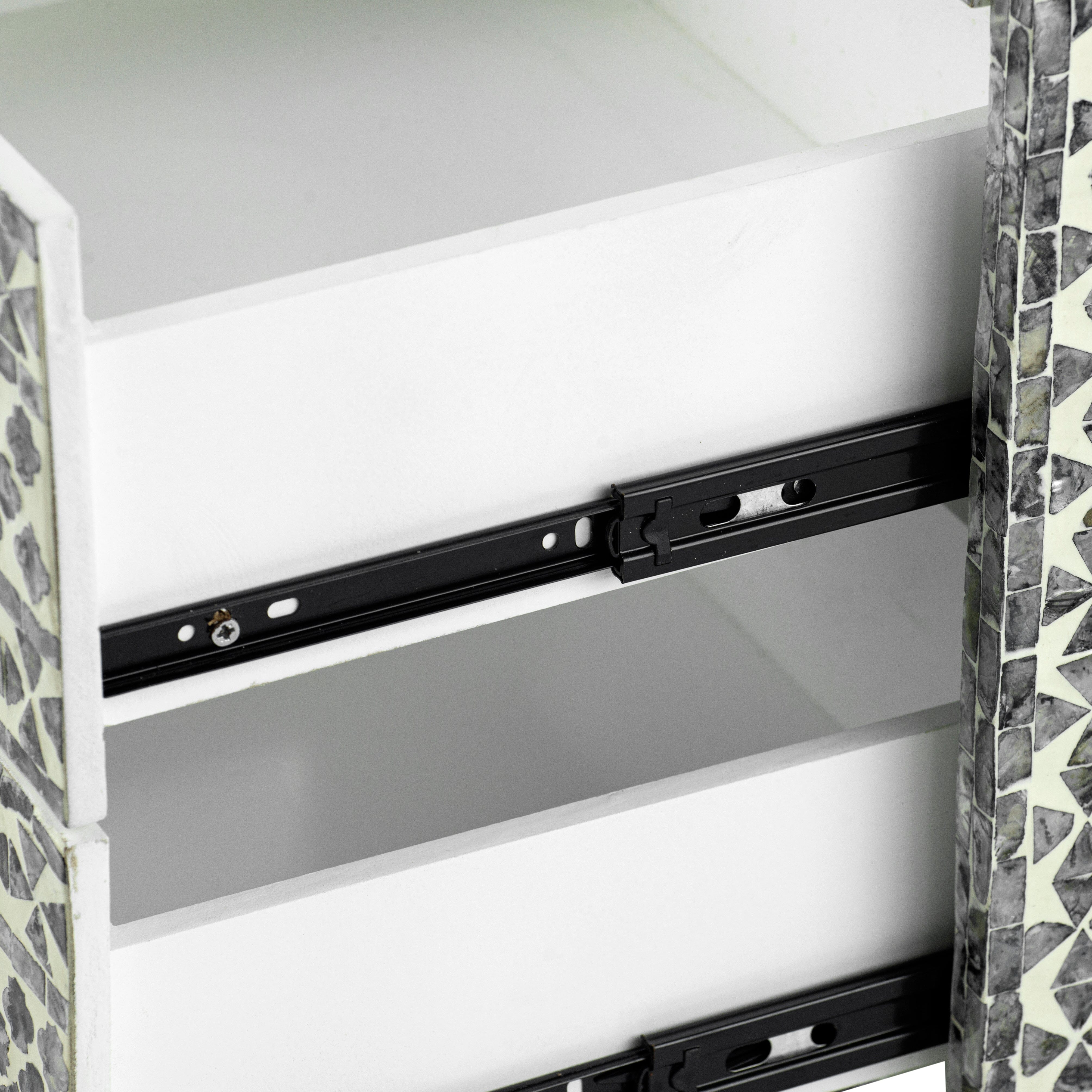 Our hand-crafted Mother of Pearl furniture is expertly crafted, imparting each piece with a unique character of its own. Such pieces may bear small markings, smudges, glue spots, and other subtle details all of which contribute to its one-of-a-kind look. Patterns may differ from those shown in its original photos. Note that these details are not faults and are instead part of the charm of such hand-crafted items. To maintain these pieces, they should not be used outdoors, nor should cleaning chemicals be used. Instead, use a lint-free cloth, and also make sure not to place these pieces near heat or sunlight, as this may cause fading.