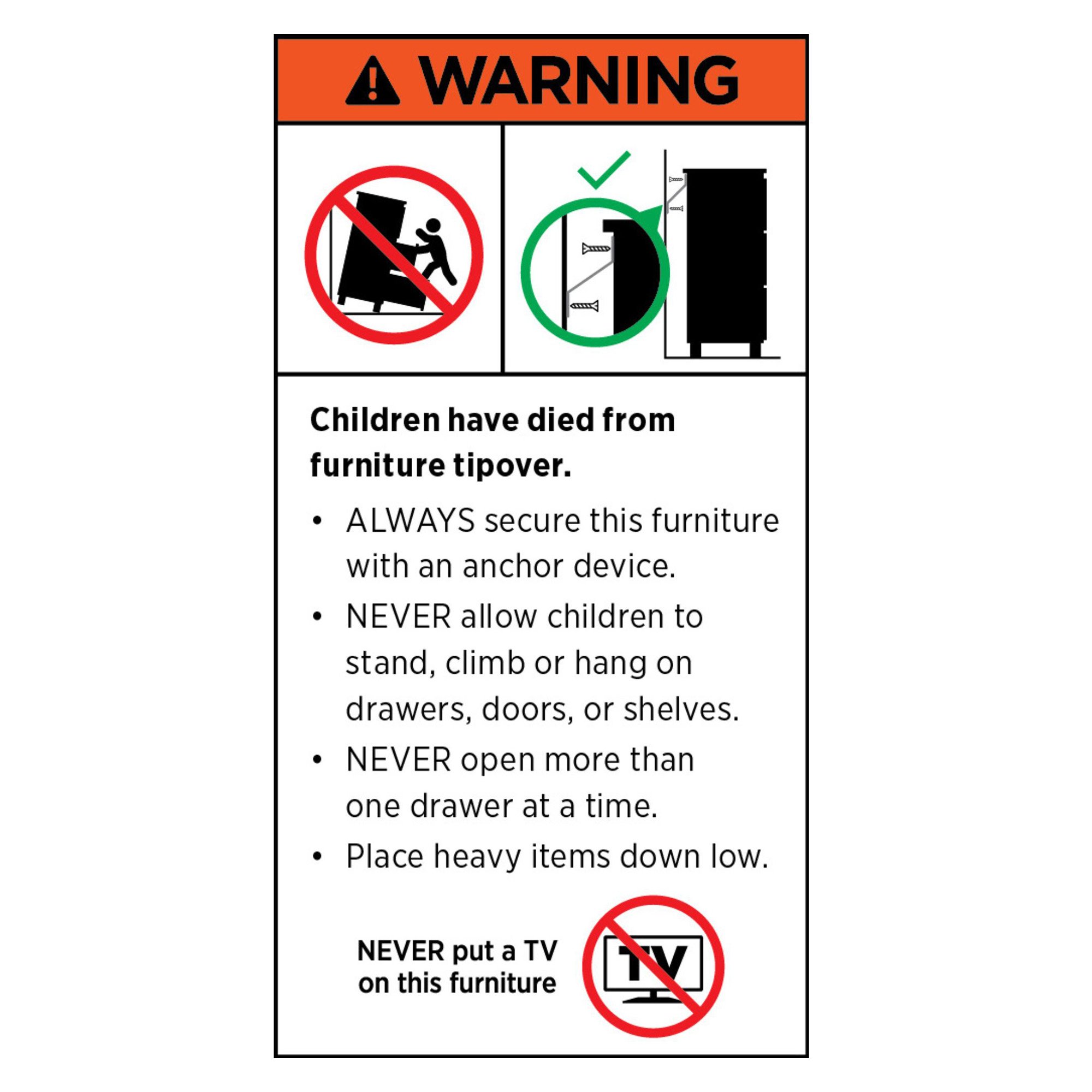 Children have died from furniture tip-over. Always secure this furniture with an anchor device. Never allow children to stand, climb, or hang on drawers, doors or shelves. Never open more than one drawer at a time. Place heavy items down low. Never put a TV on this furniture.