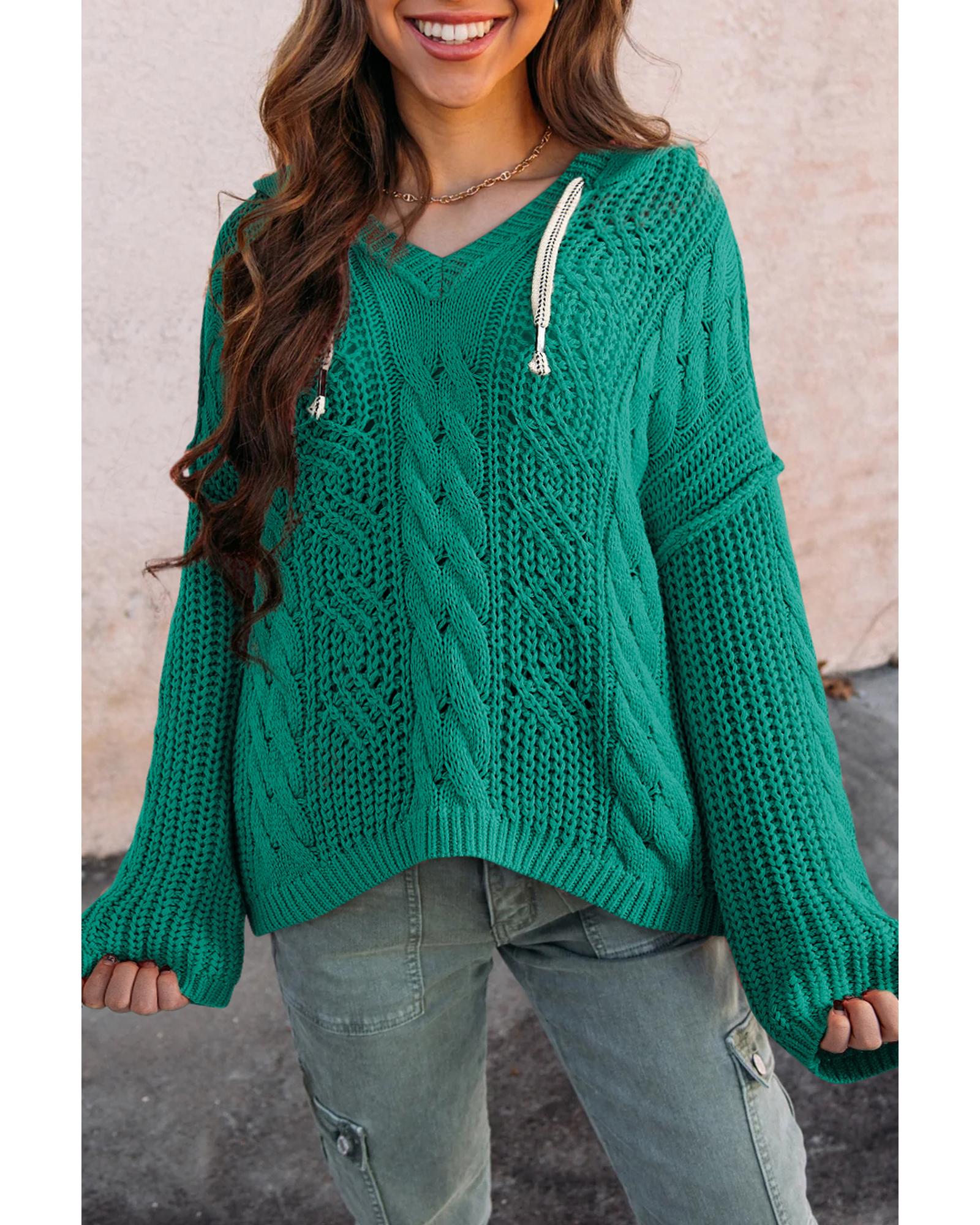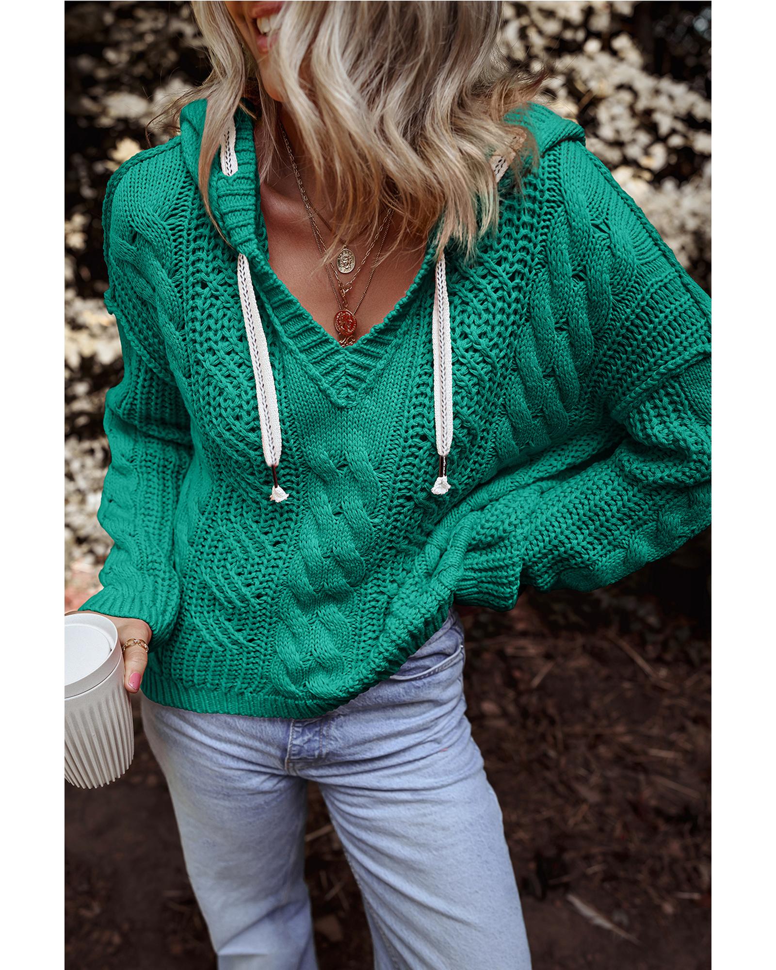 - Sea Green Cable Knit V Neck Contrast Drawstring Hooded Sweater
