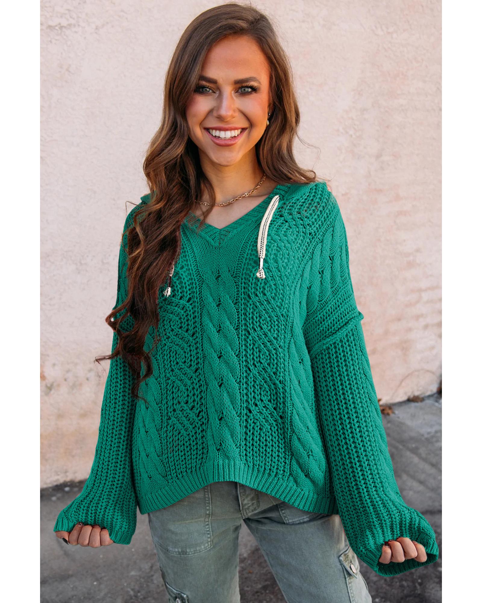 - Sea Green Cable Knit V Neck Contrast Drawstring Hooded Sweater