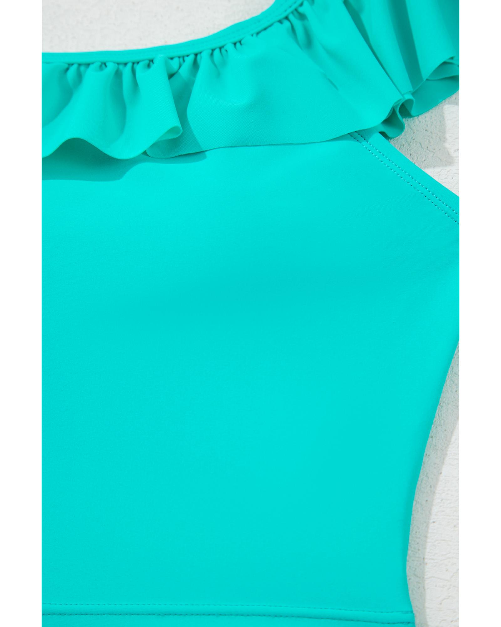 • Sea Green Solid Ruffled Square Neck Swim Top