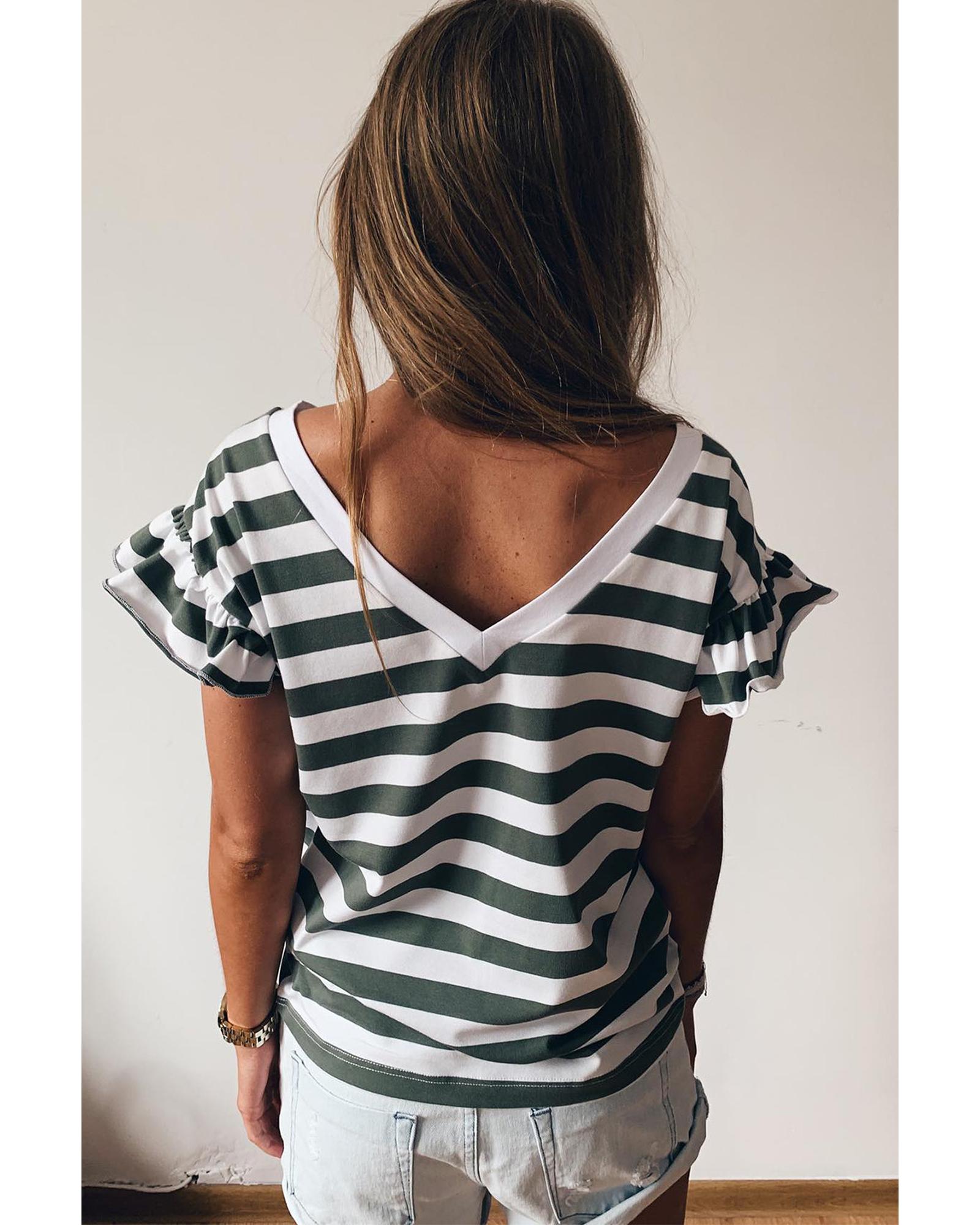 Sea Green Striped V Neck Ruffle Sleeve Top – L