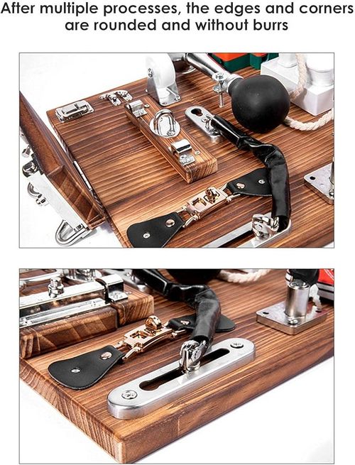?FUNCTIONAL ACTIVITY BOARD: Our learning toys are equipped with a latch lock, shape matching, and wooden beads to practice using locks that look like real latches and buckles