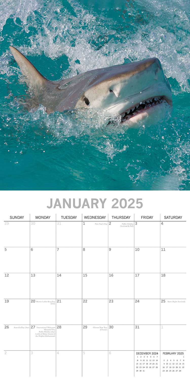 Shake off the stereotype of Jaws and feast your eyes on the beauty of this Sharks calendar for 2025. This misunderstood animal is captured under the sea in its natural habitat.This beautifully designed, brand-new calendar is both 100% plastic-free and fully recyclable. It comes shrink-wrapped in its original packaging and features: