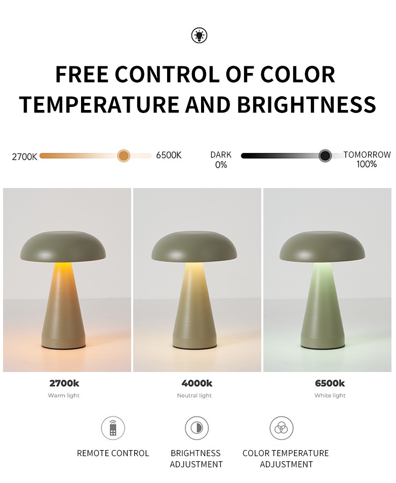 Transform your living space with this Metal Mushroom Table Lamp. Designed with a sleek, modern mushroom shape, this rechargeable ambient light is perfect for living rooms, restaurants, bars, or as a stylish bedside night light. Featuring touch control and a remote, it offers customizable color temperatures and brightness levels to suit any mood or occasion.