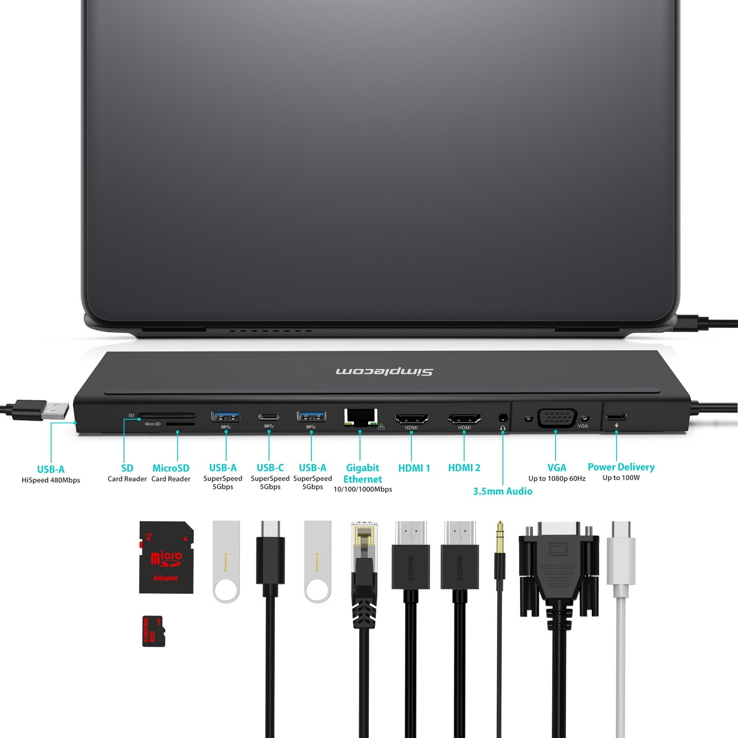 A powerful all-in-one USB-C docking station with dual HDMI, VGA outputs, 100W PD charging port, Gigabit Ethernet Port, SD/MicroSD Card reader, 3.5mm audio output and 4 port USB hub (3x SuperSpeed 5Gbps USB ports and 1x HiSpeed 480Mbps USB port)