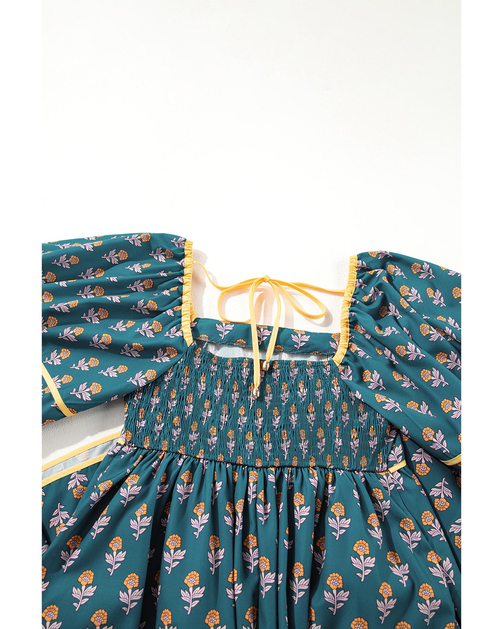 Skobeloff Floral Contrast Trim Square Neck Puff Sleeve Dress – L