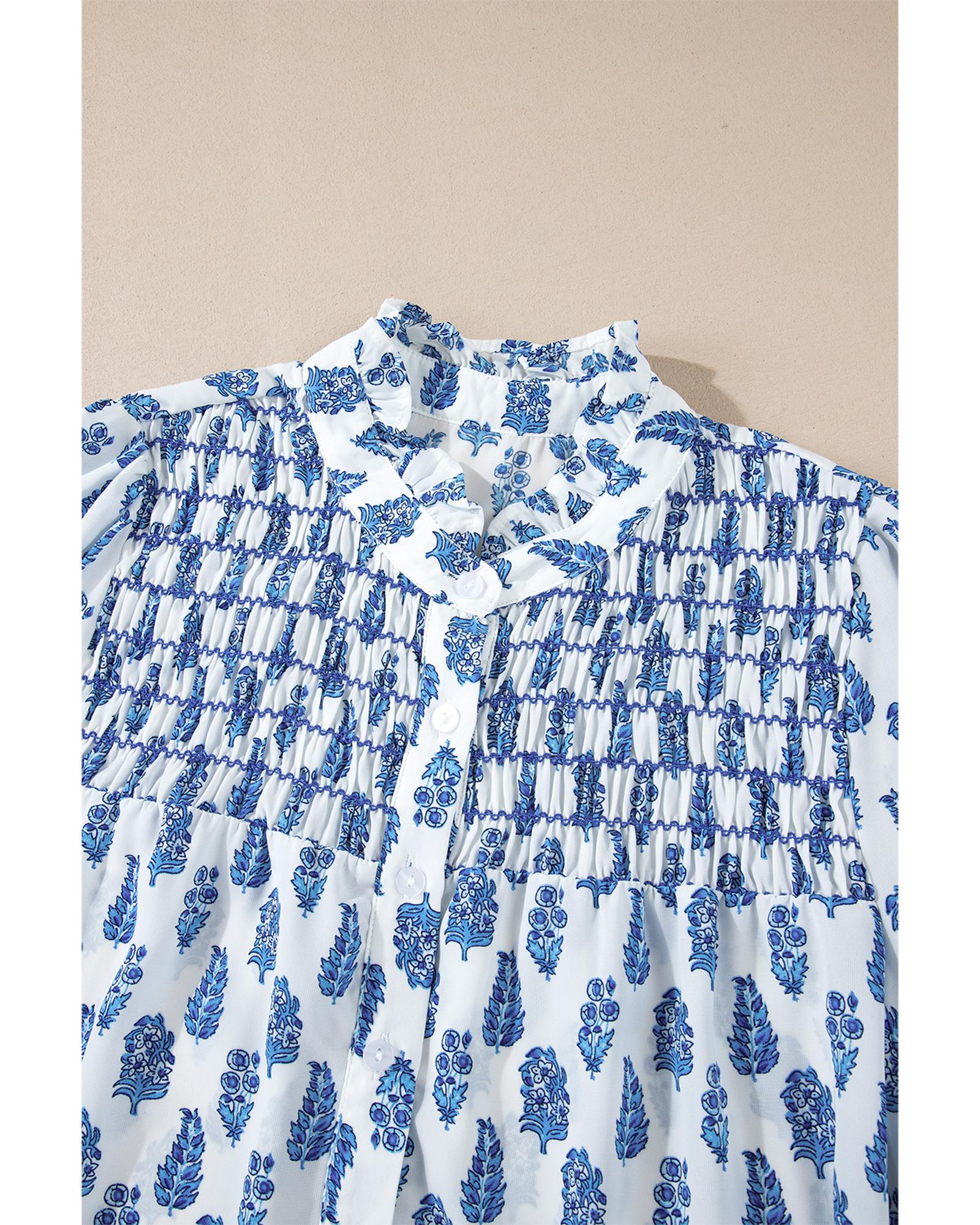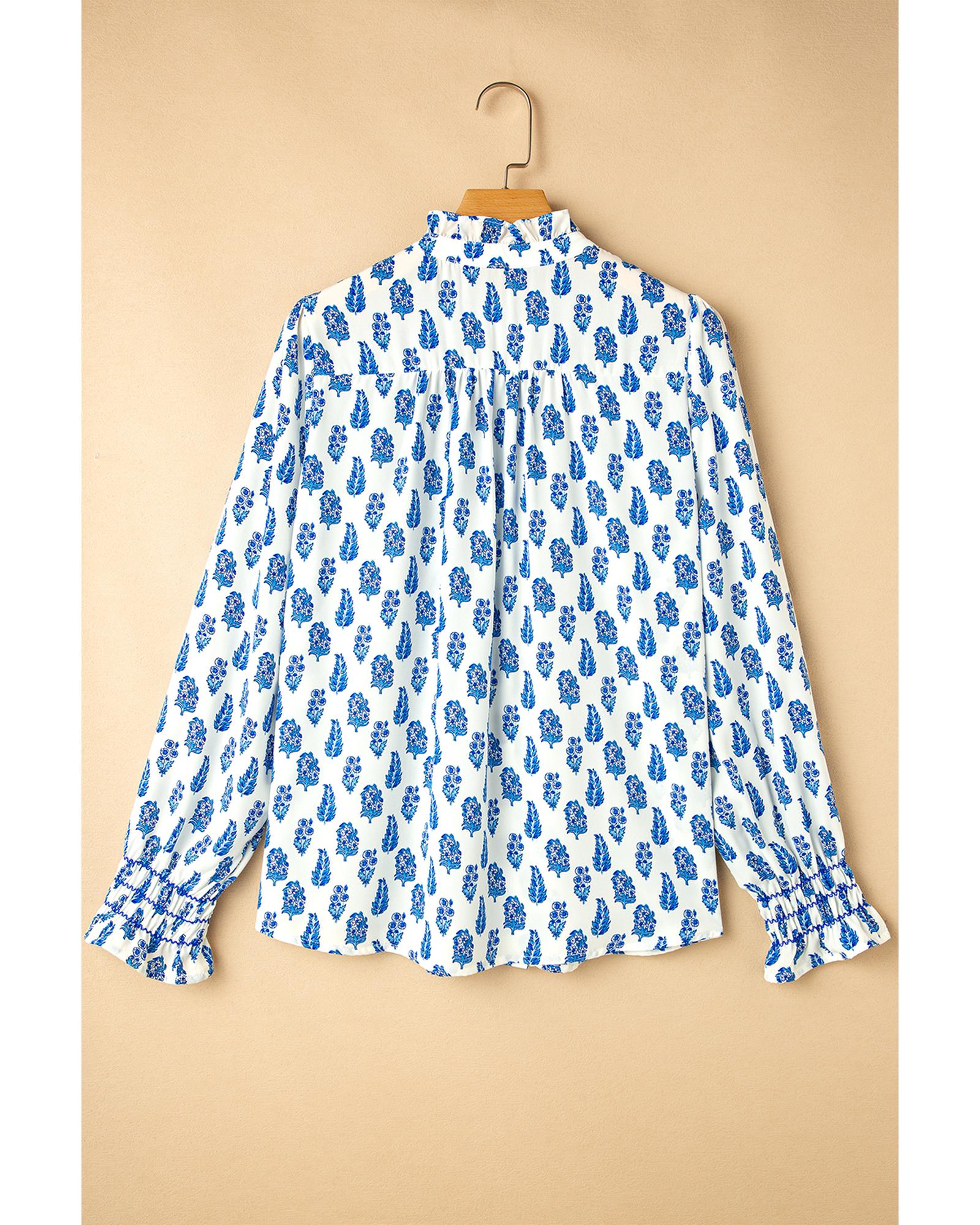 Sky Blue Boho Floral Printed Lantern Sleeve Frilled Neck Shirred Shirt – M