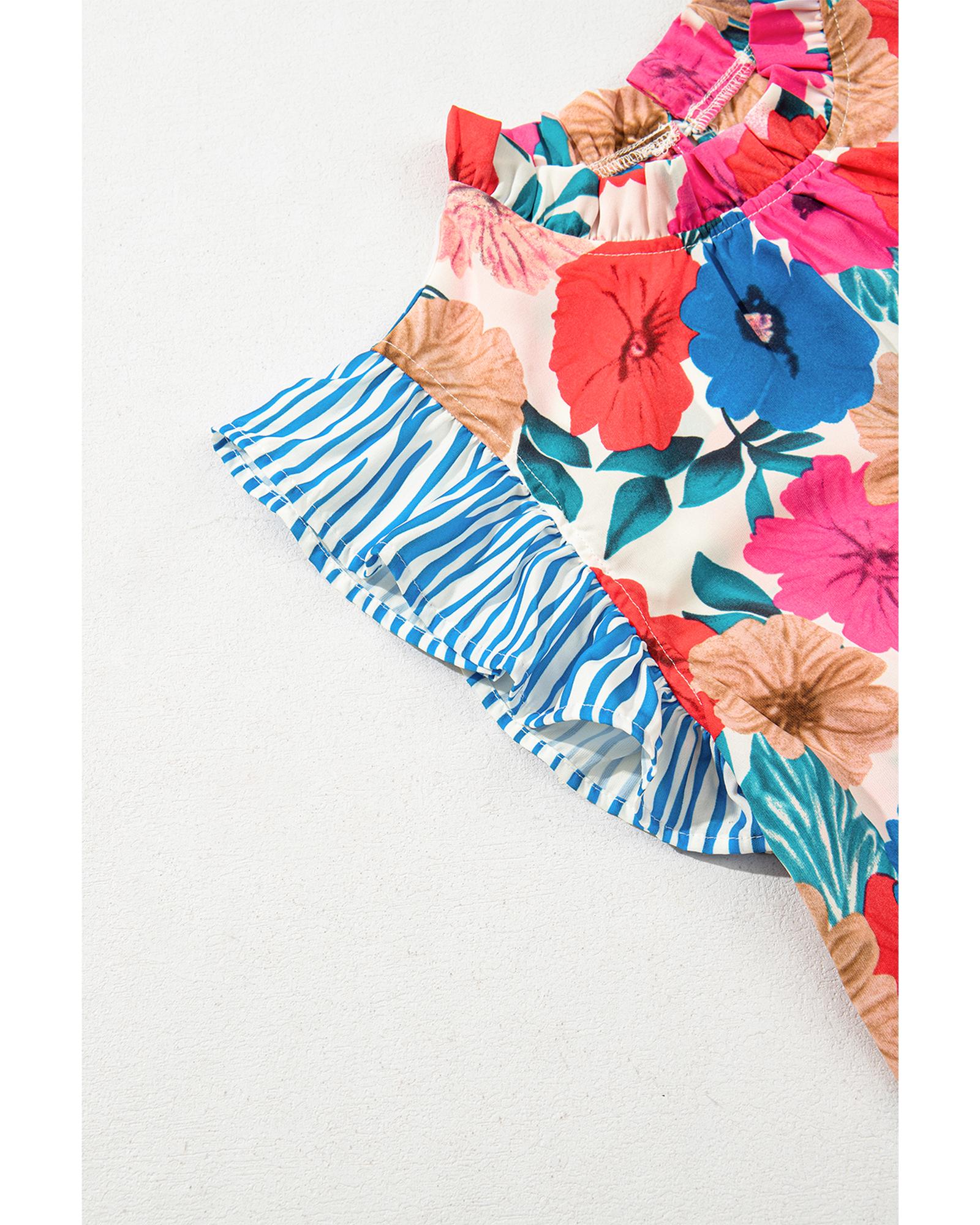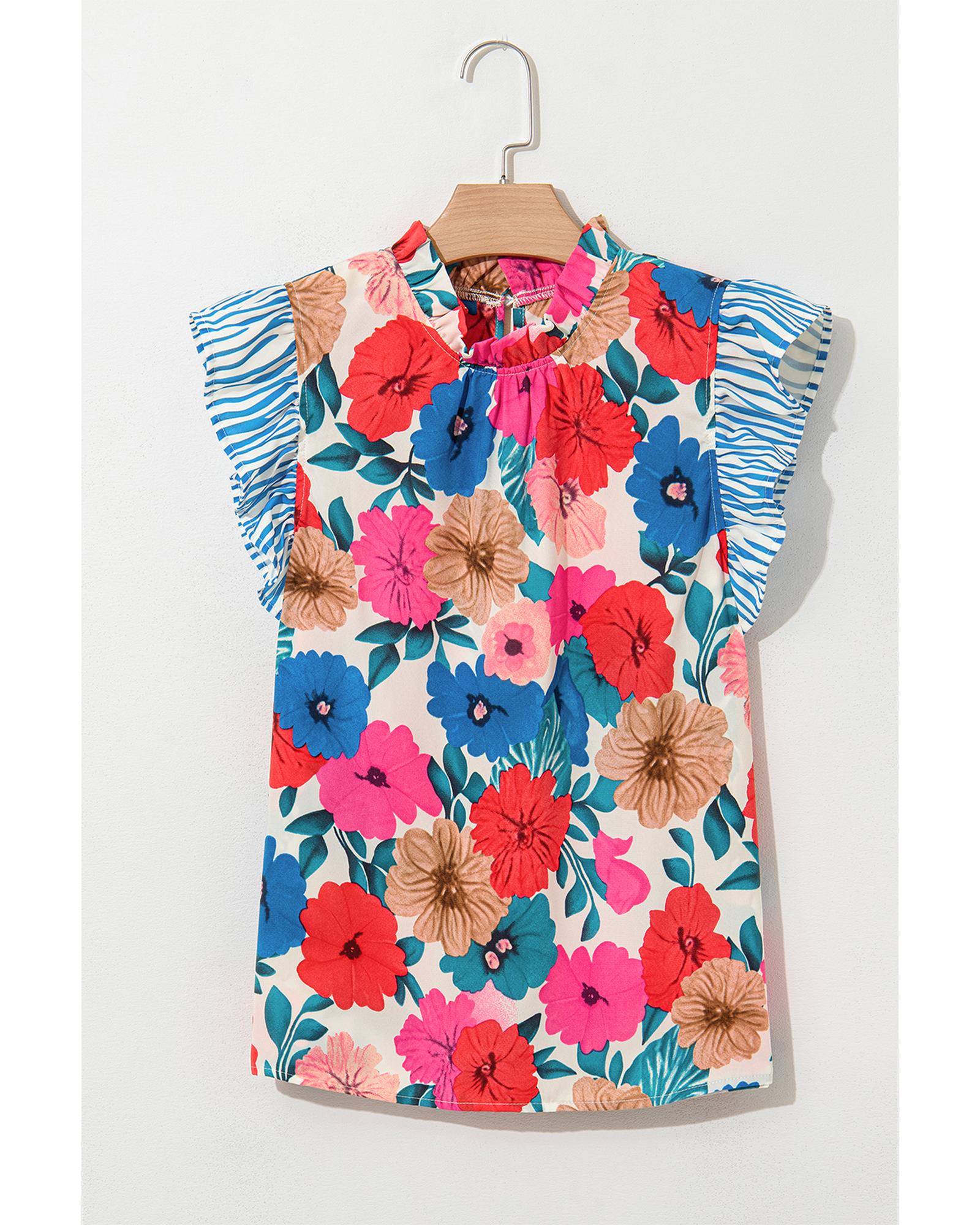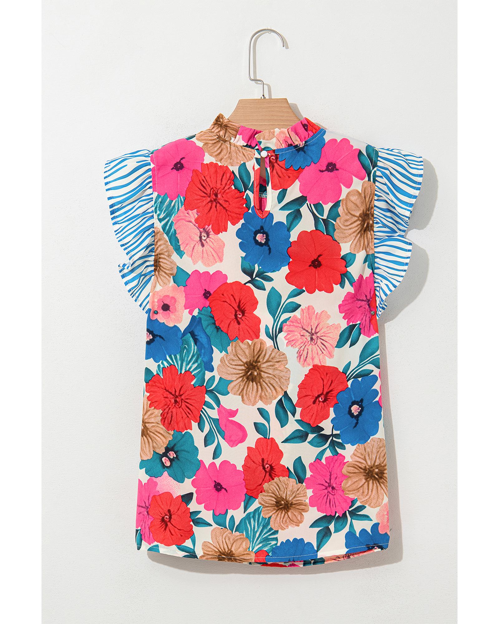 Sky Blue Floral Mock Neck Striped Flutter Sleeve Blouse – L