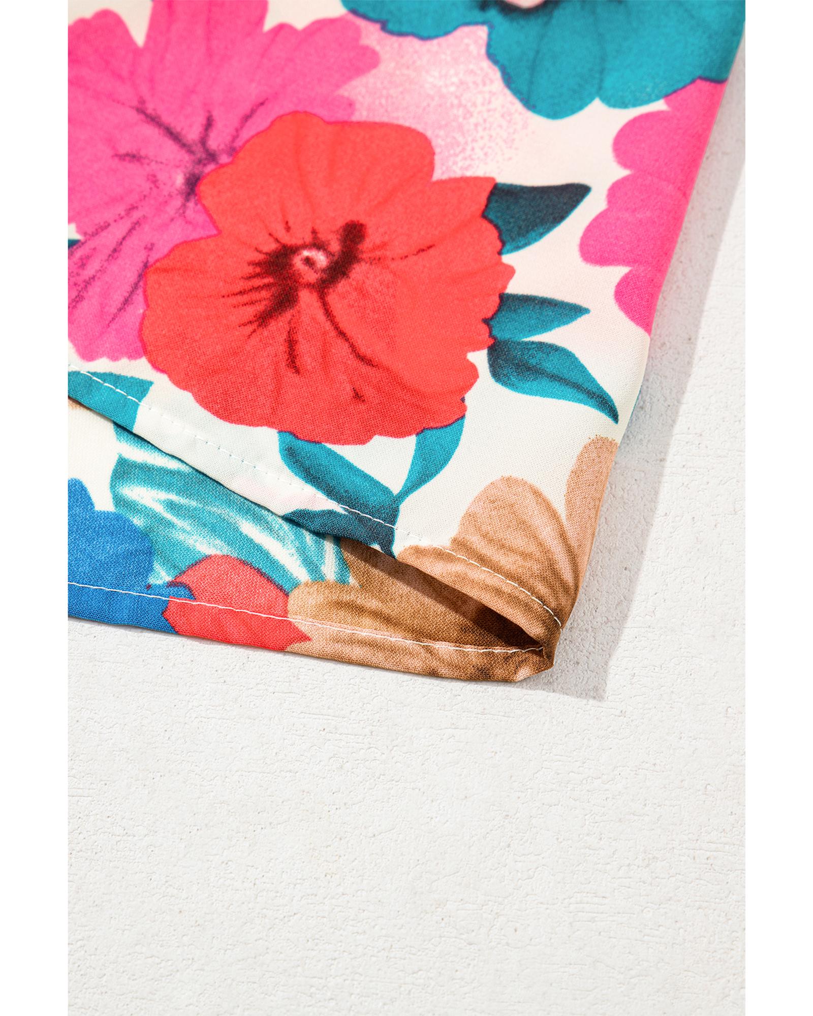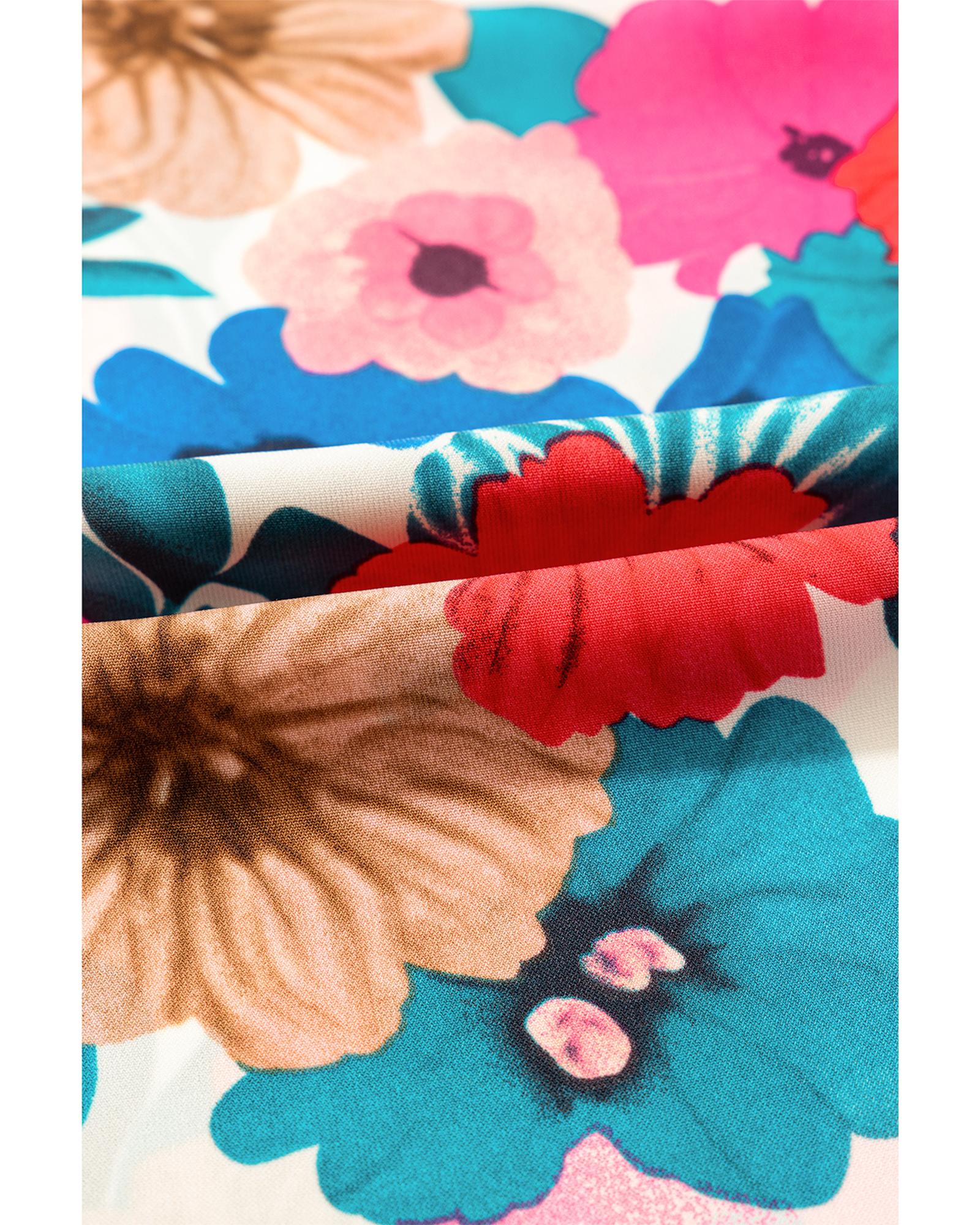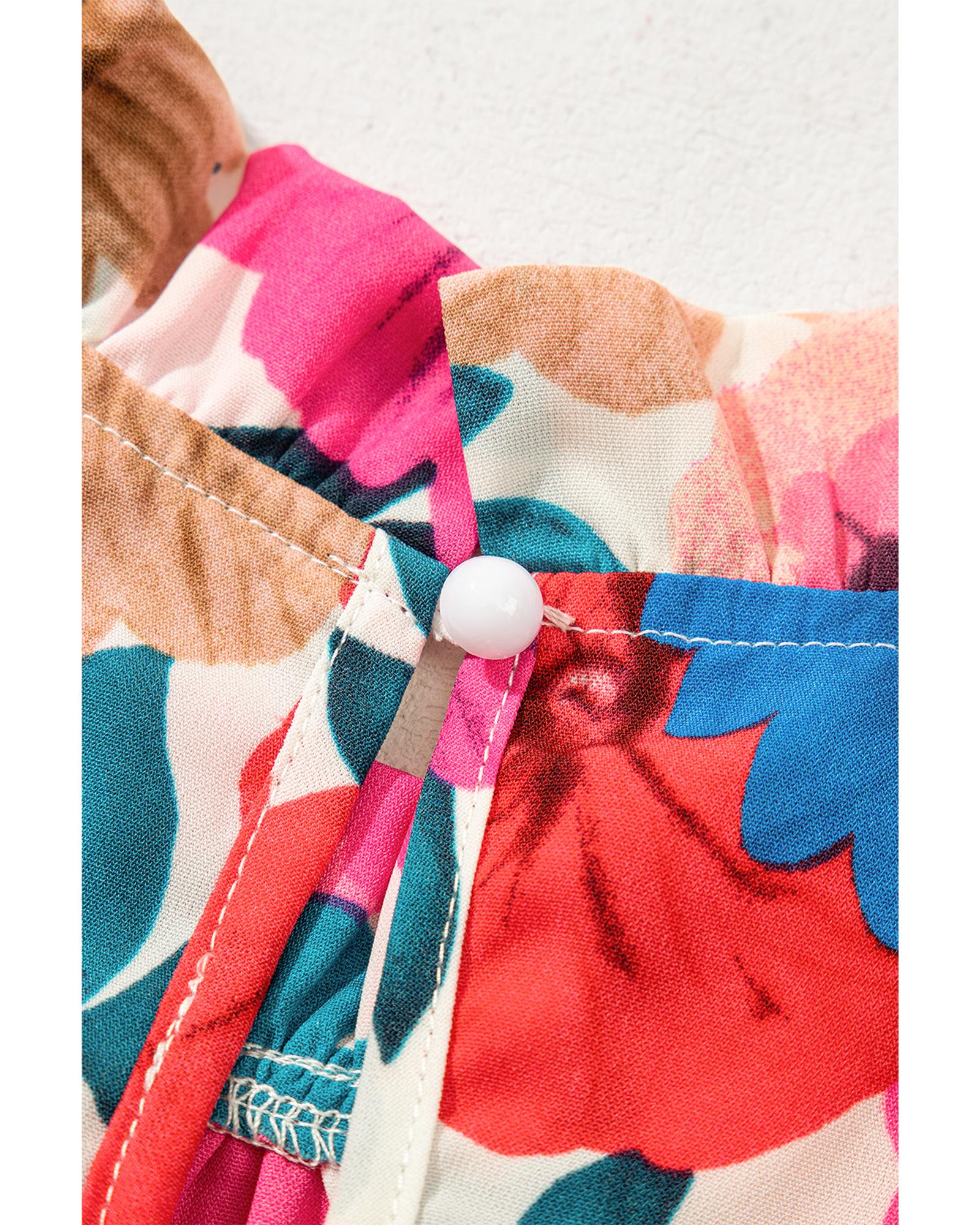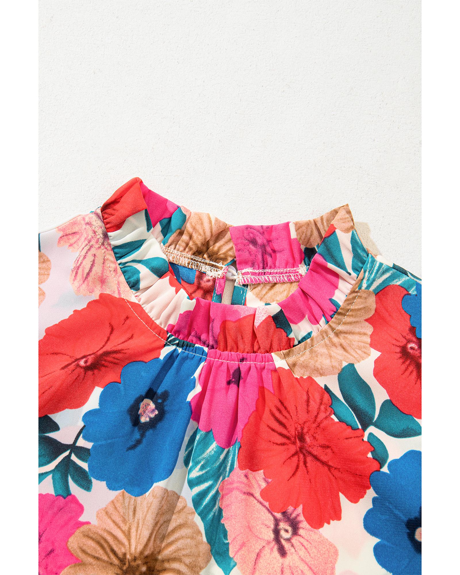 Sky Blue Floral Mock Neck Striped Flutter Sleeve Blouse – L