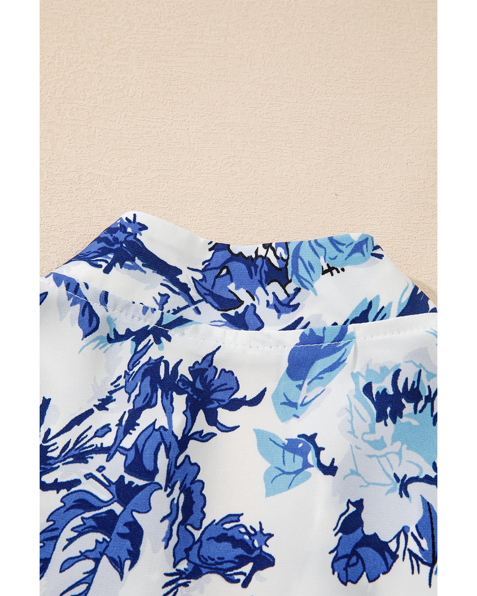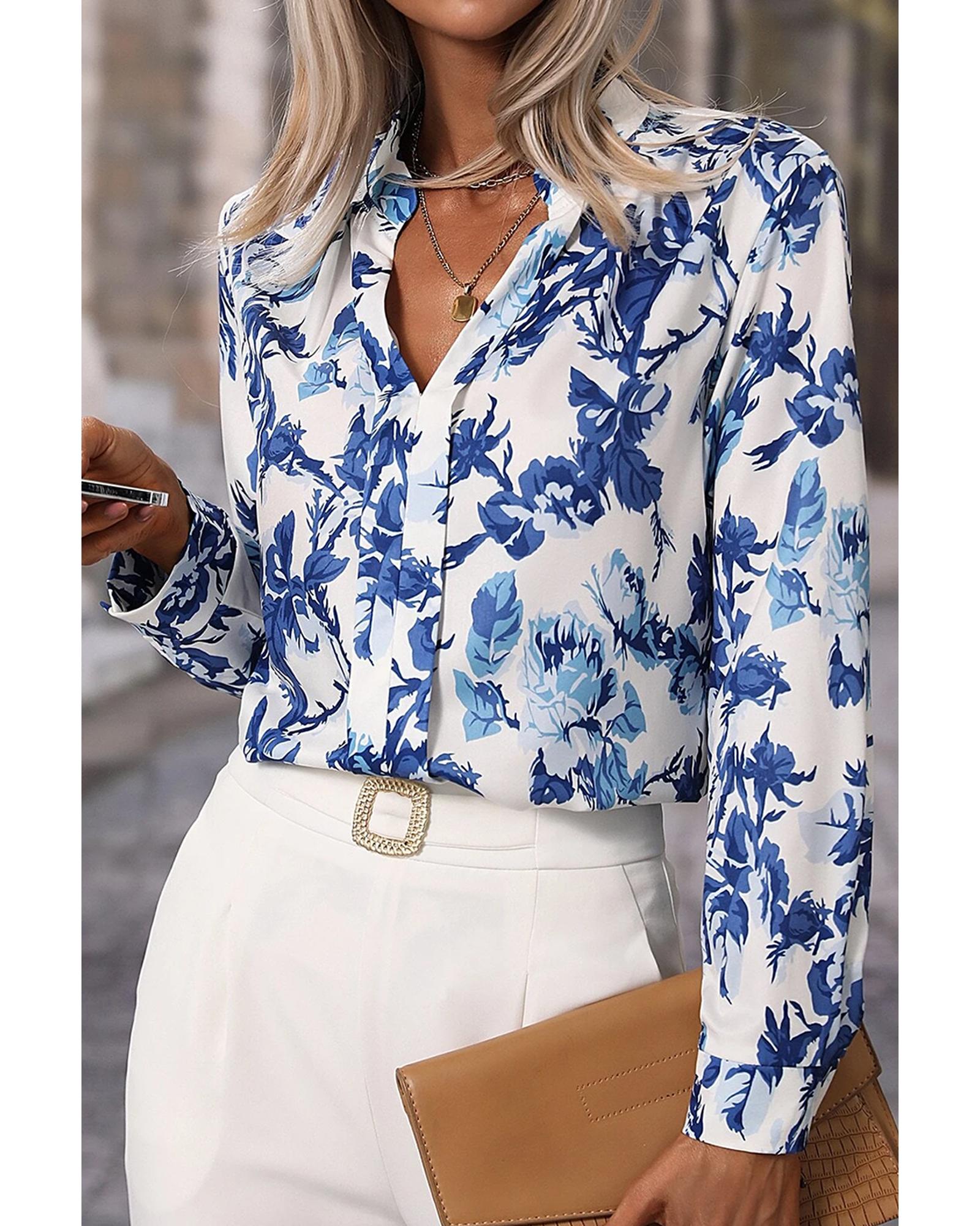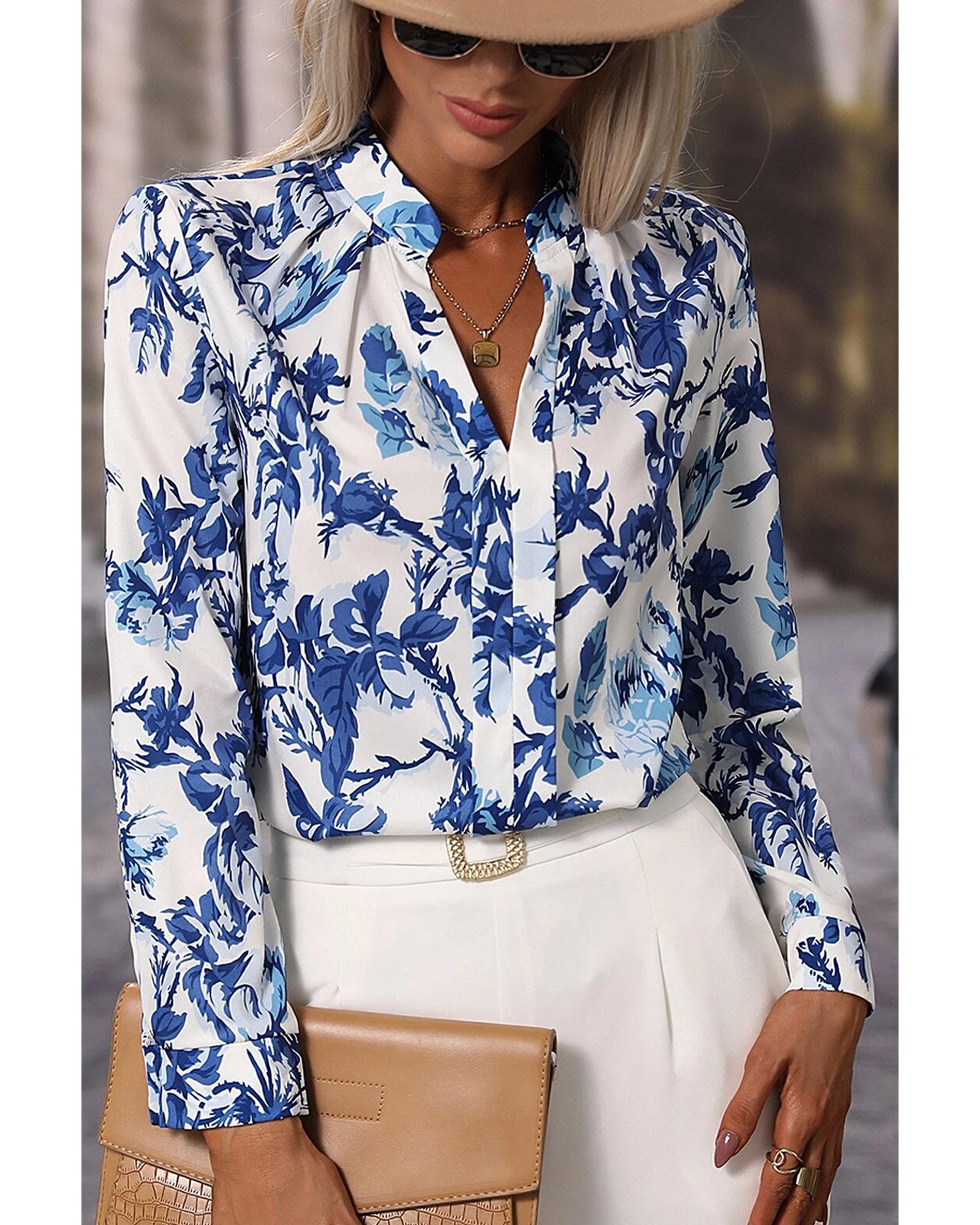 Sky Blue Floral Print Notched Neck Elegant Blouse – S