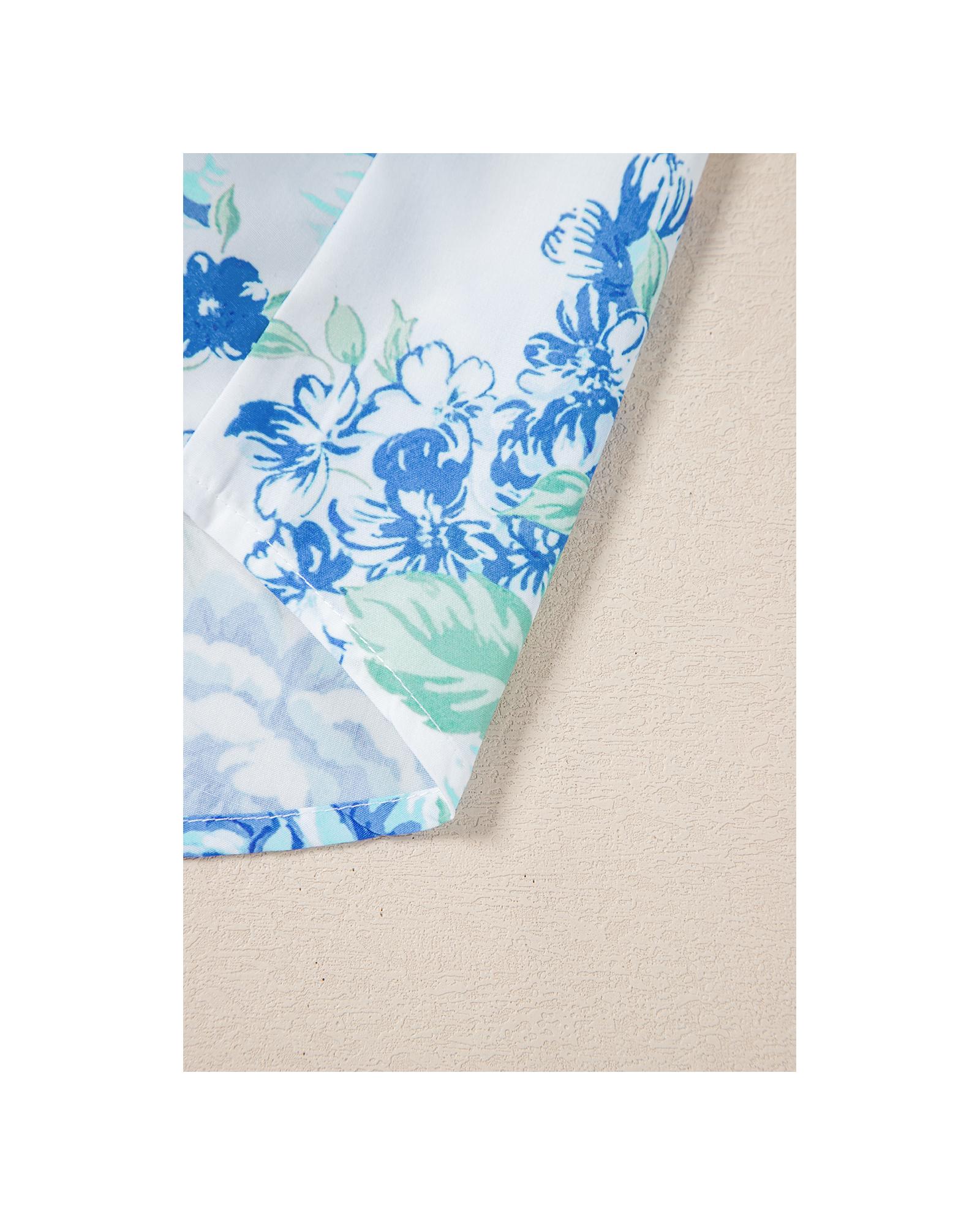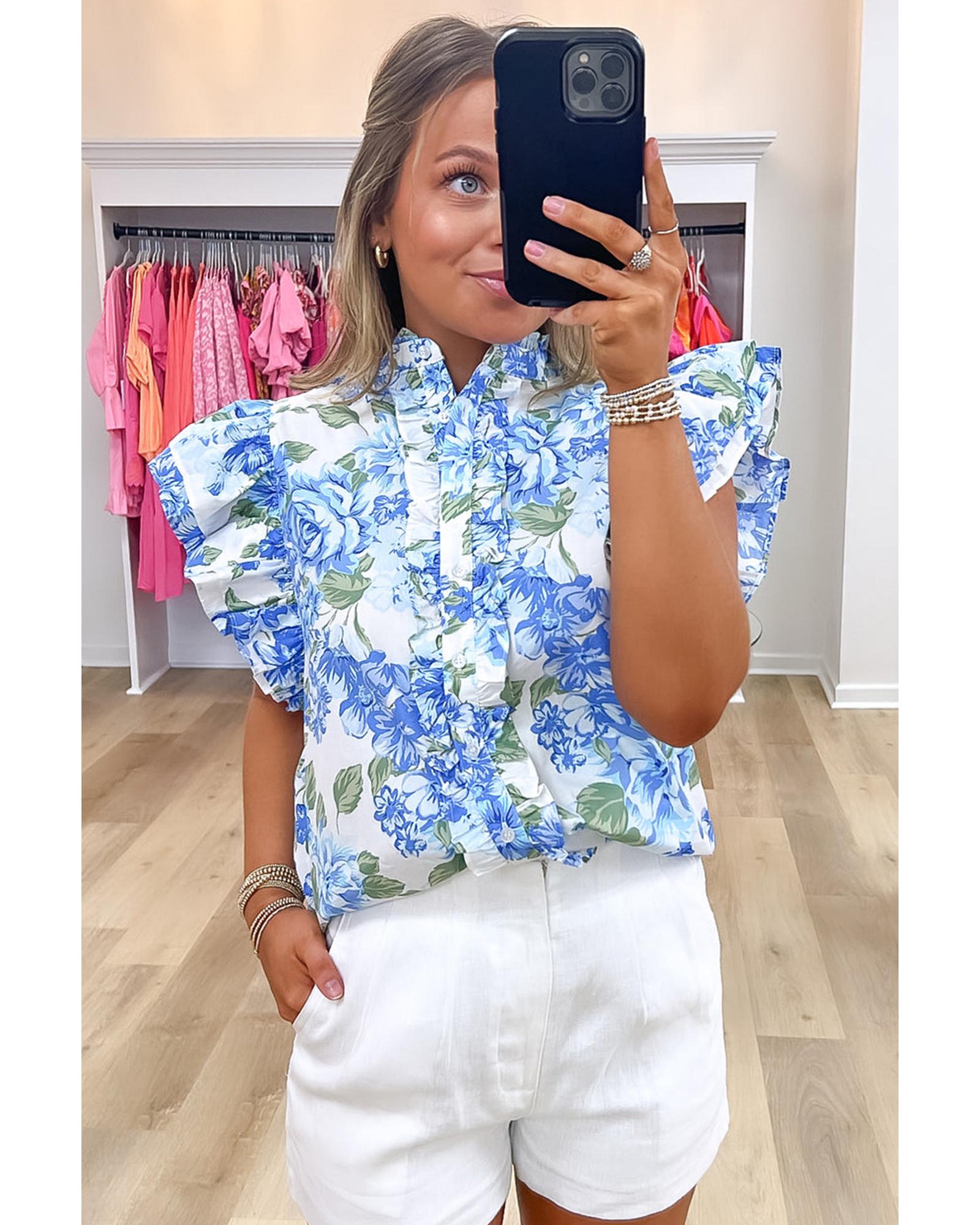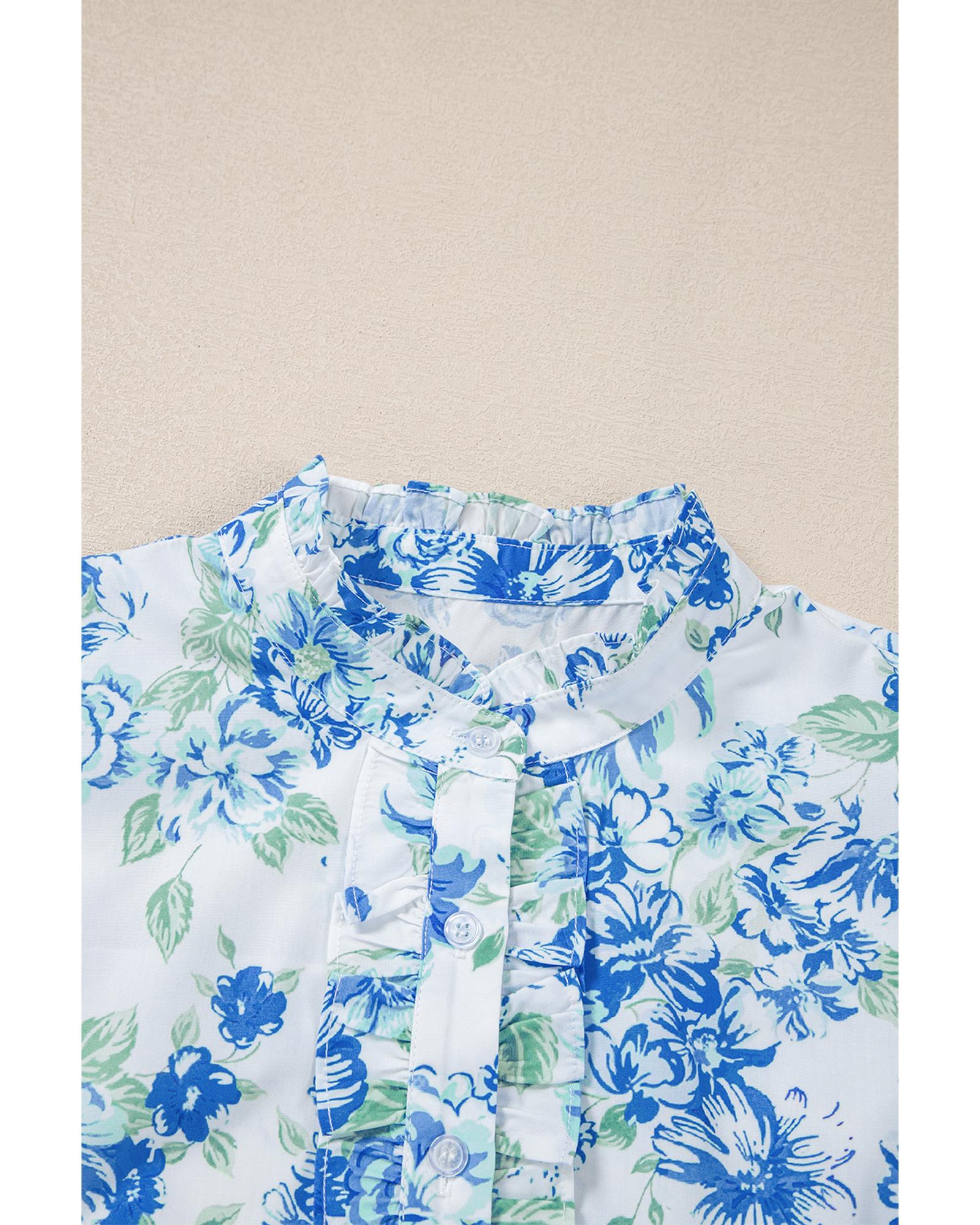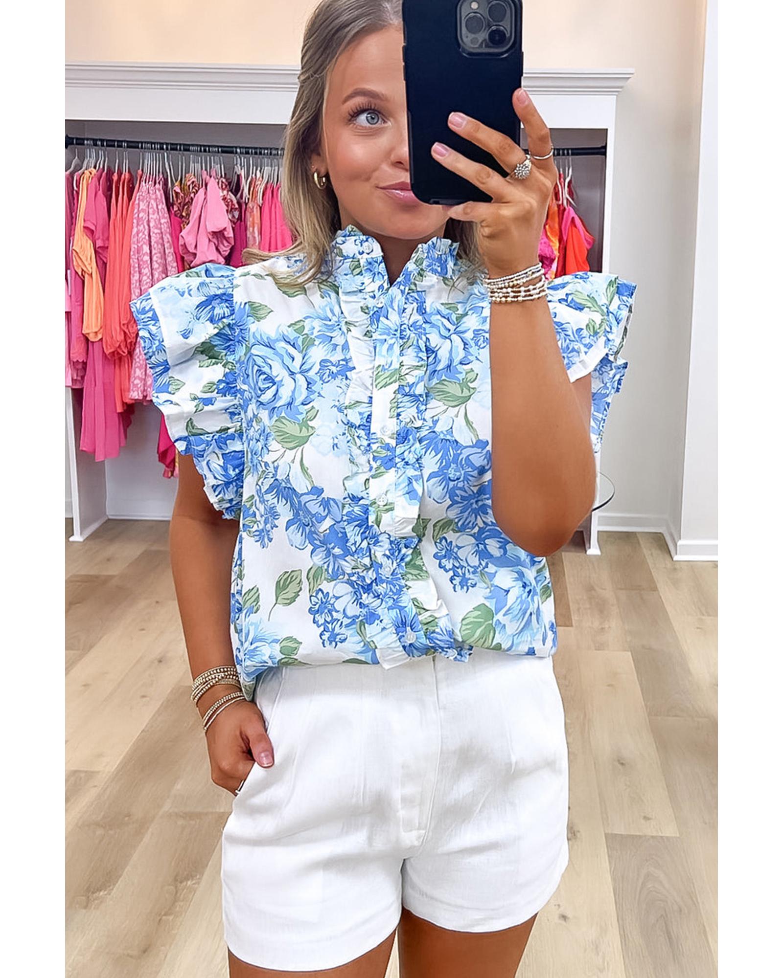 Sky Blue Floral Print Ruffle Sleeve Frilly Button Up Shirt – XL