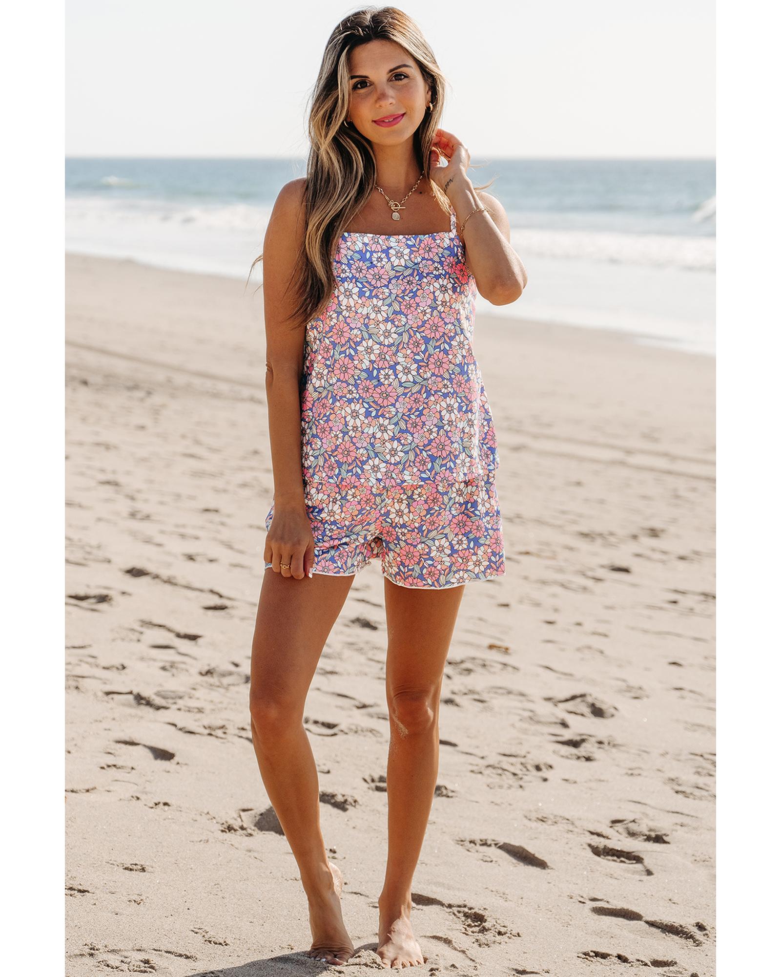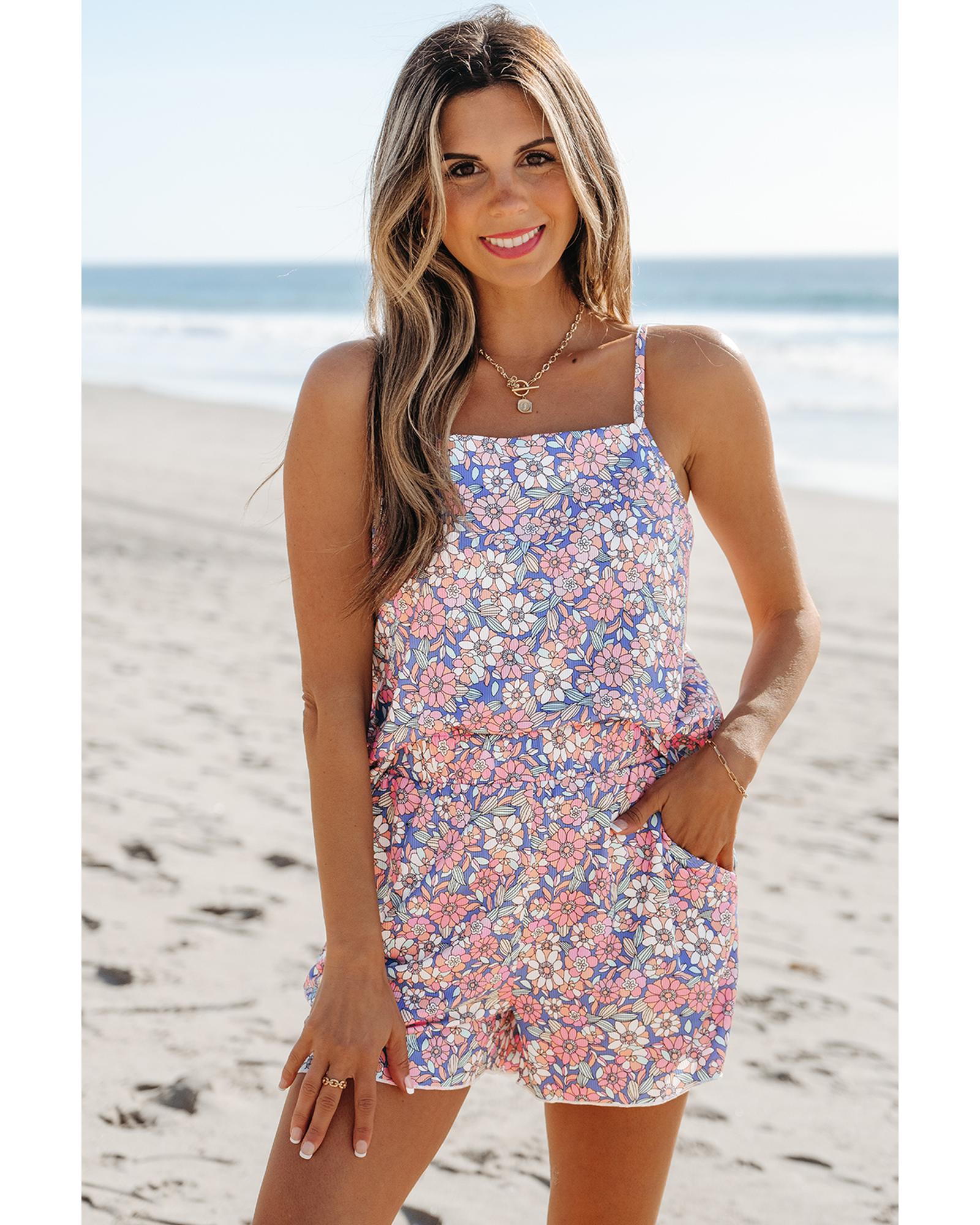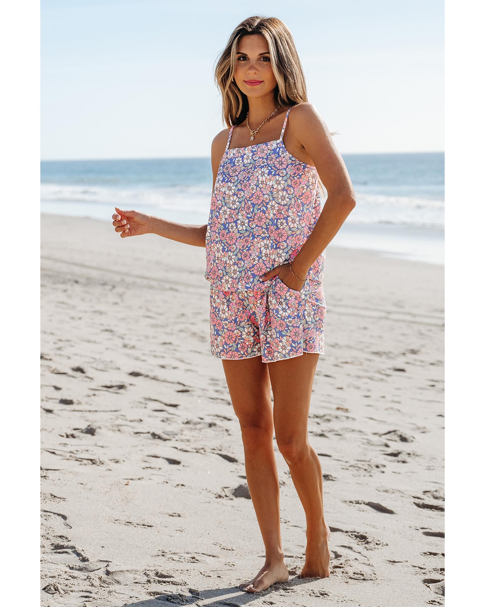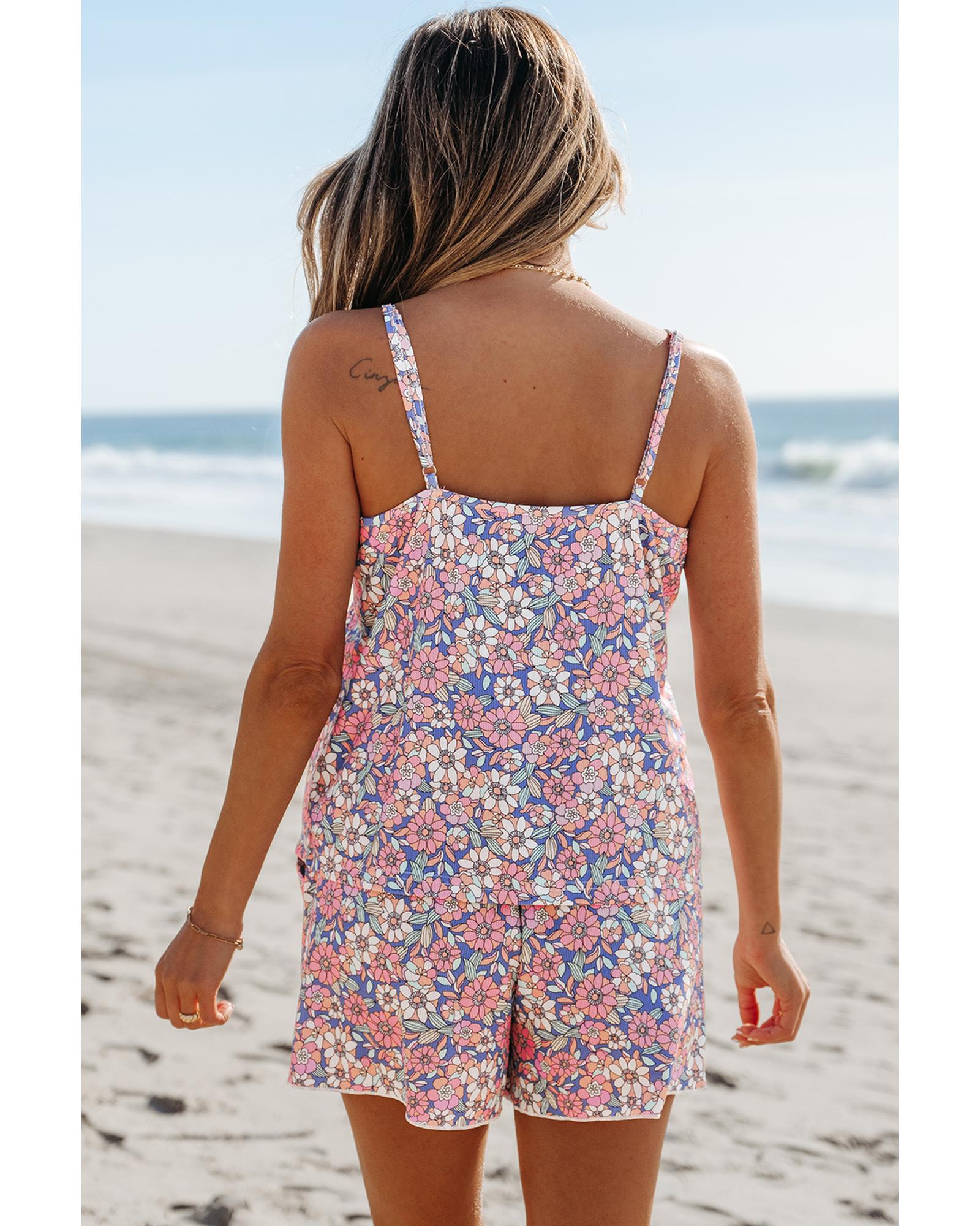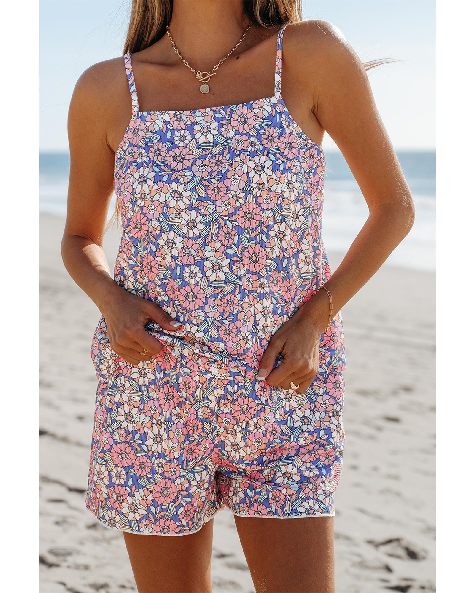 - Sky Blue Floral Print Spaghetti Straps Tank Top and Shorts Set