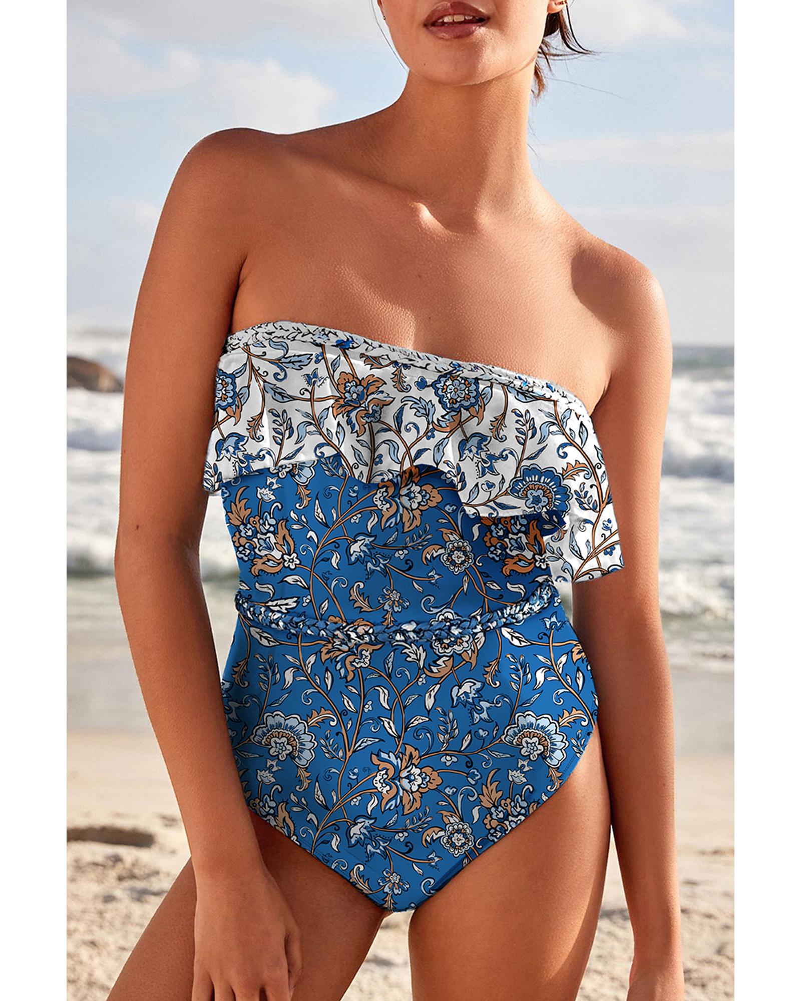 Sky Blue Floral Printed Ruffle Removable Strap One Piece Swimsuit – XL