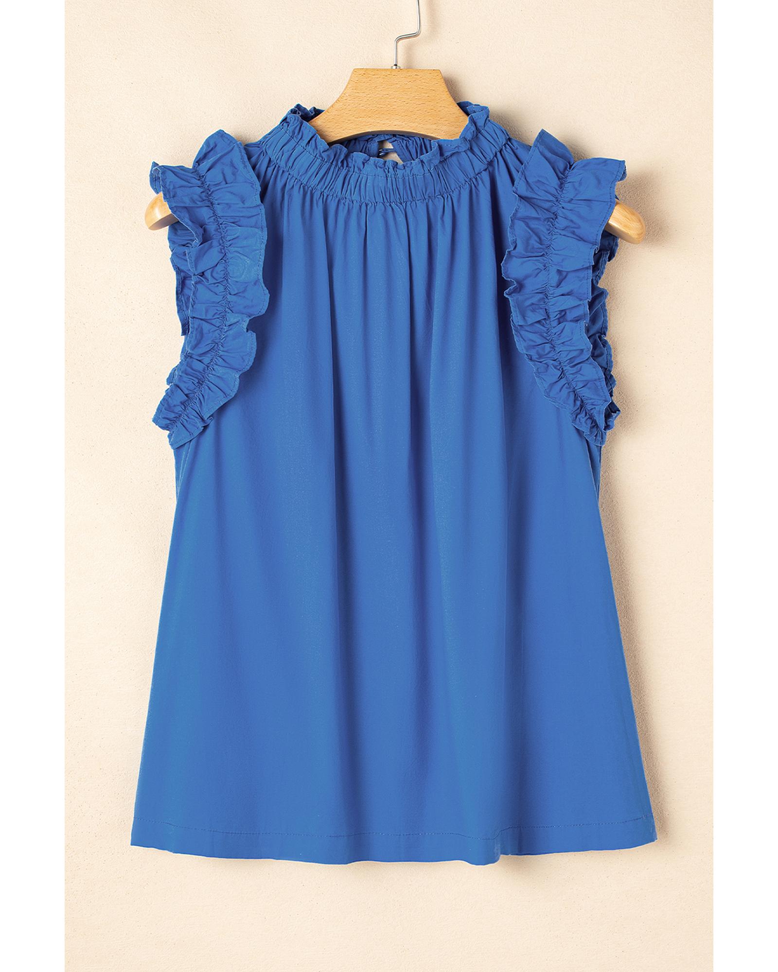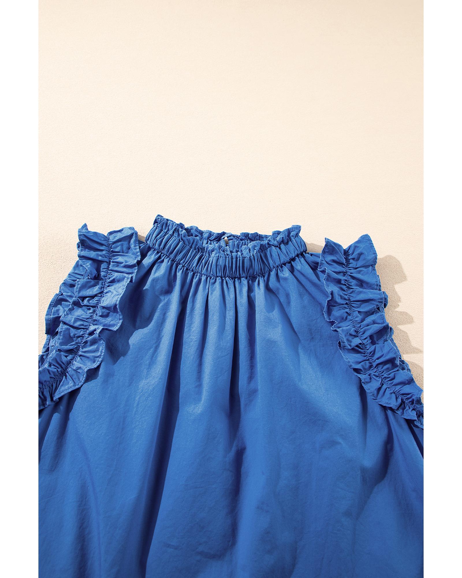 Sky Blue Frilled Neck Ruffled Armholes Buttoned Back Tank Top – M