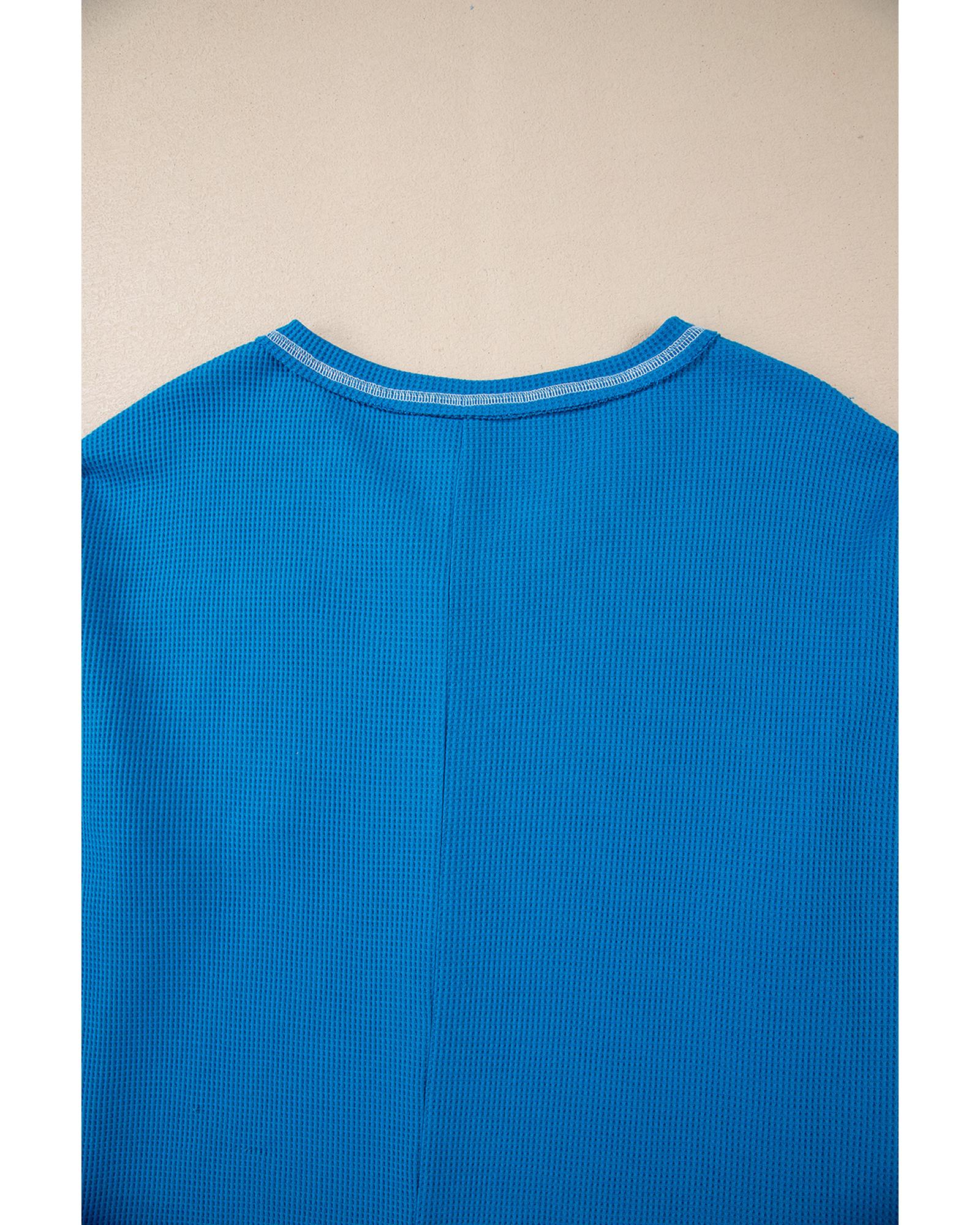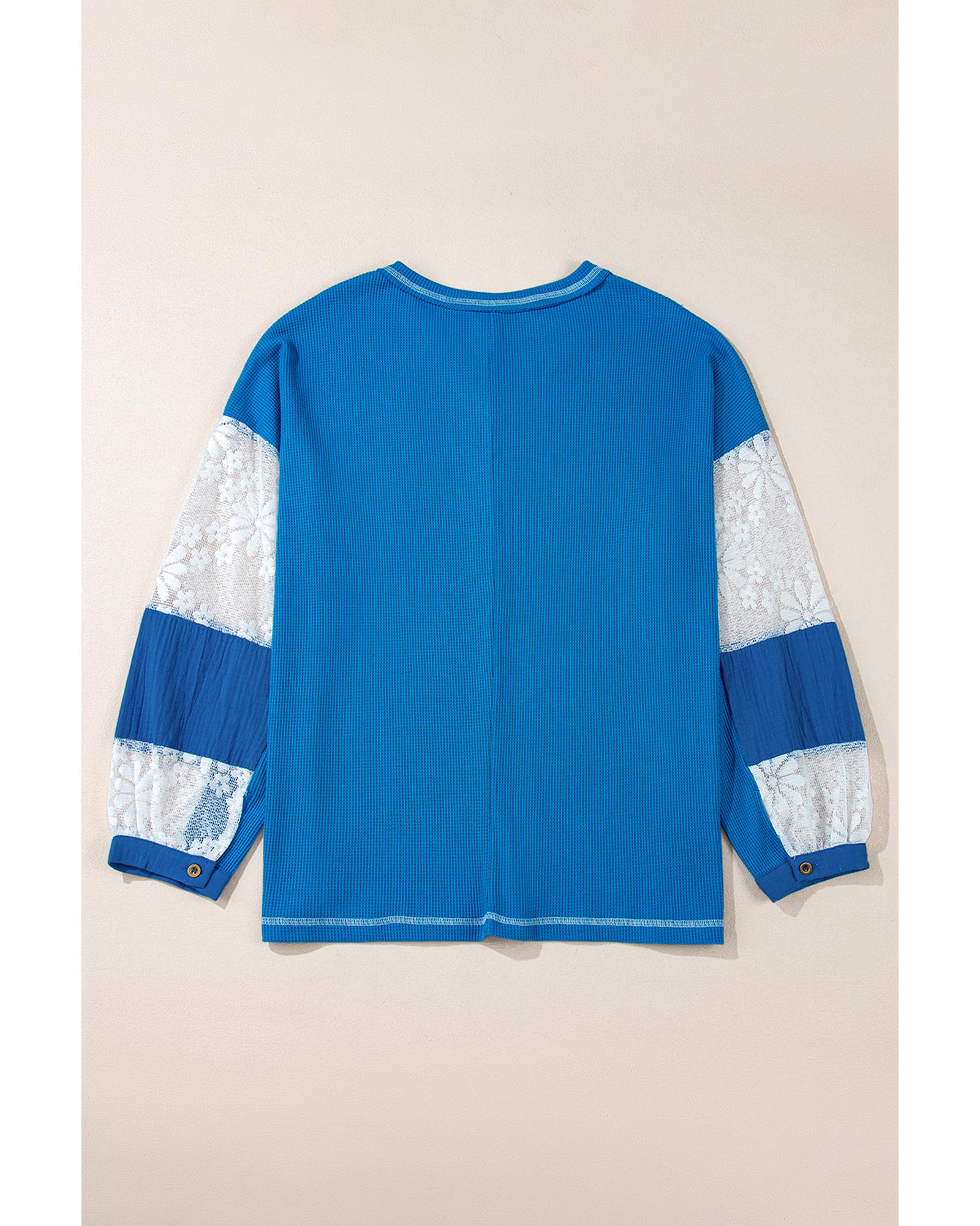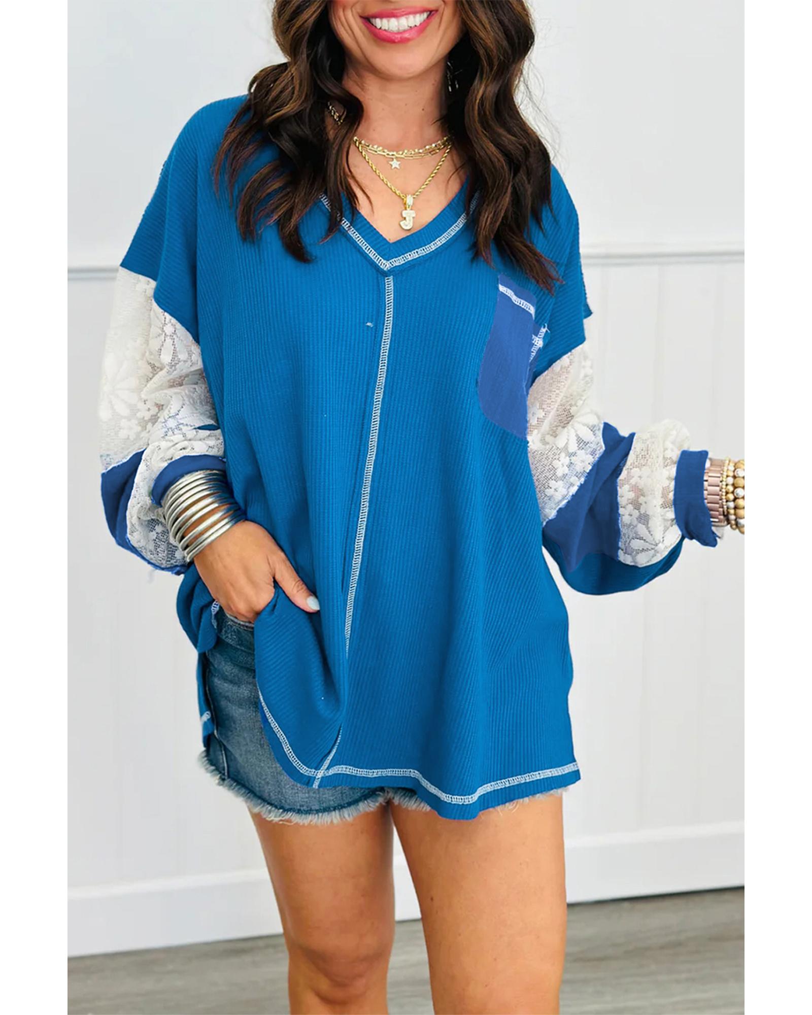 Sky Blue Lace Floral Patchwork Sleeve Stitching V Neck Rib Knit Blouse – M