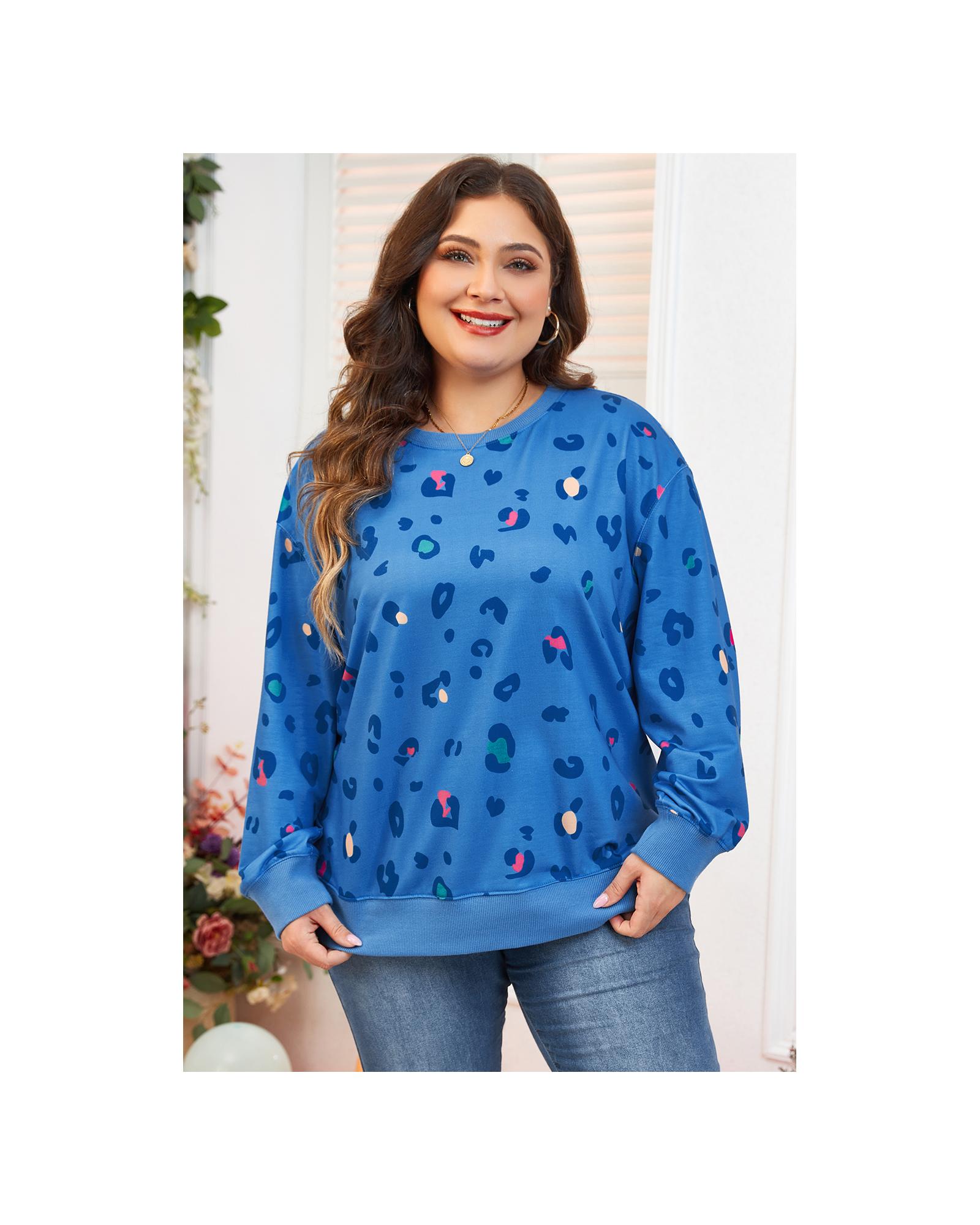 - Sky Blue Leopard Ribbed Edge Drop Shoulder Pullover Sweatshirt for women