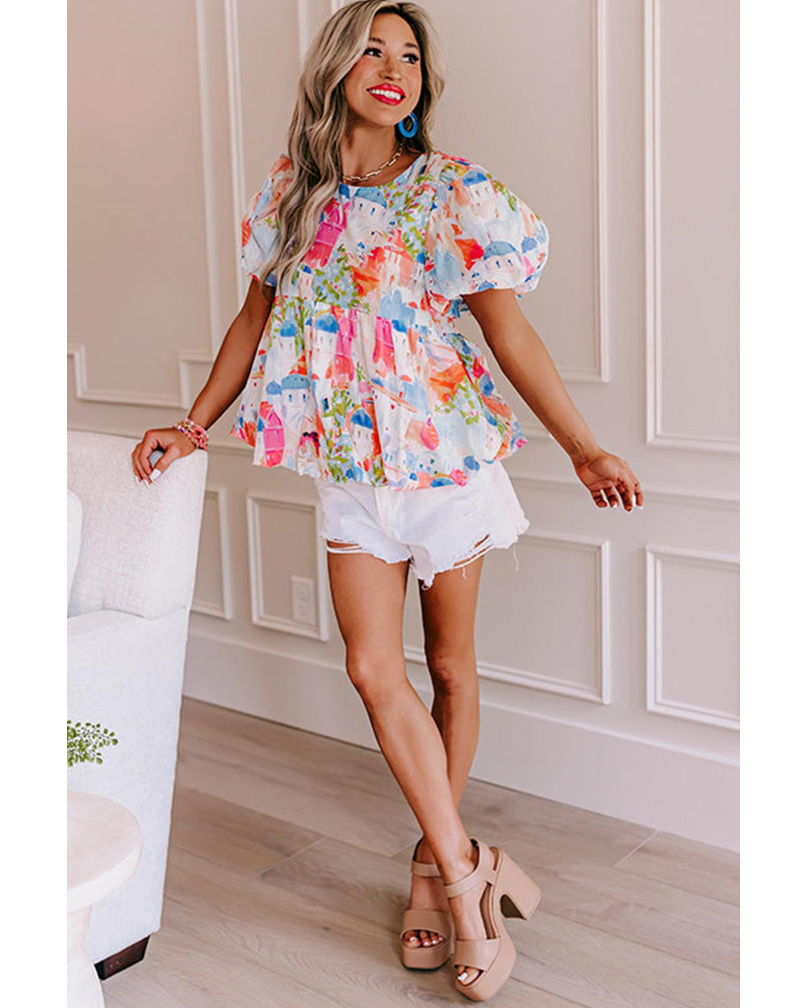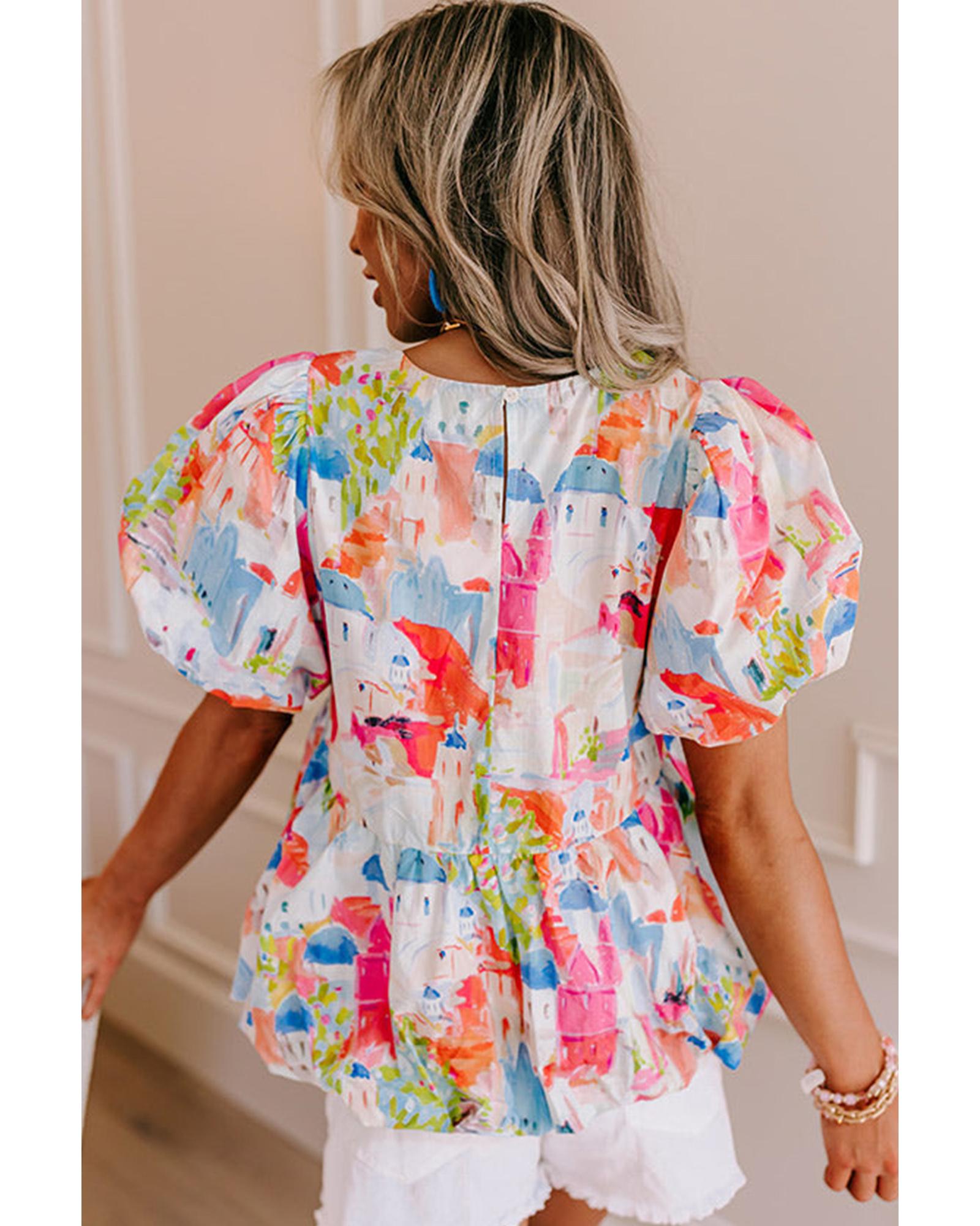 Purple Floral Print Puff Short Sleeve Crew Neck Blouse - L
