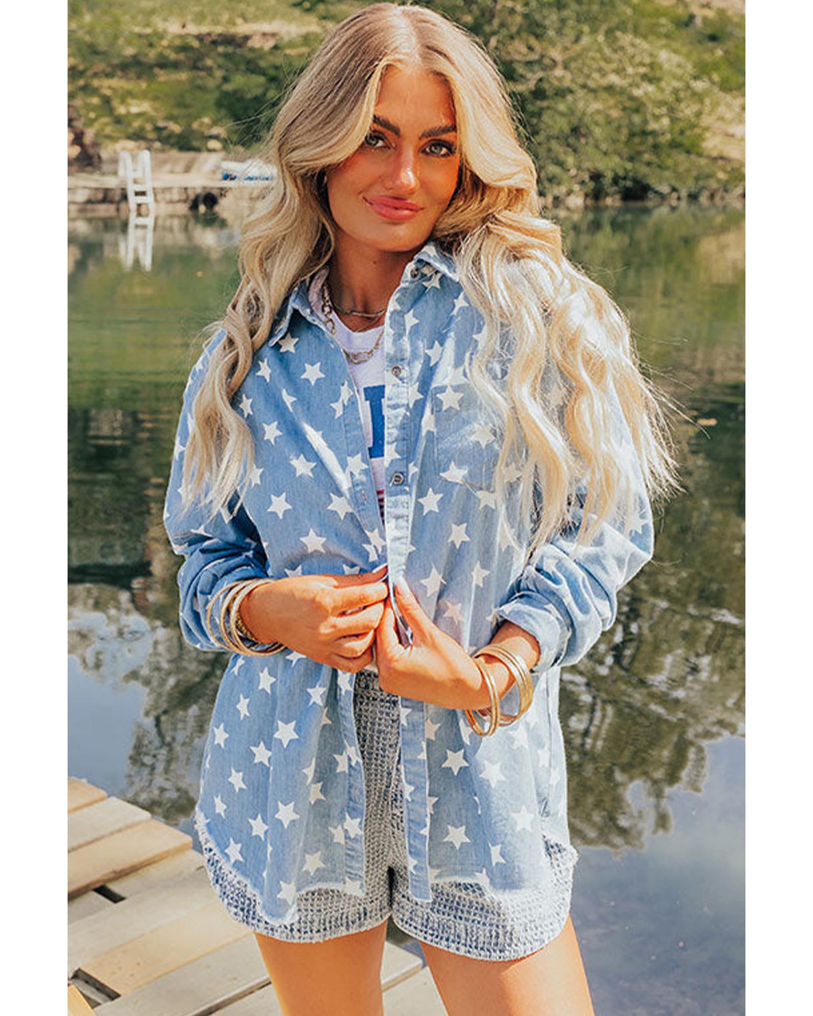 Sky Blue Star Print Light Wash Raw Hem Denim Jacket - L