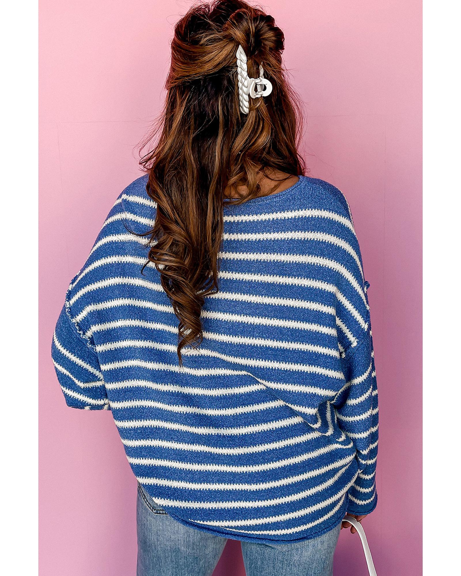 Sky Blue Stripe Drop Shoulder O Neck Plus Size Sweater – 1X