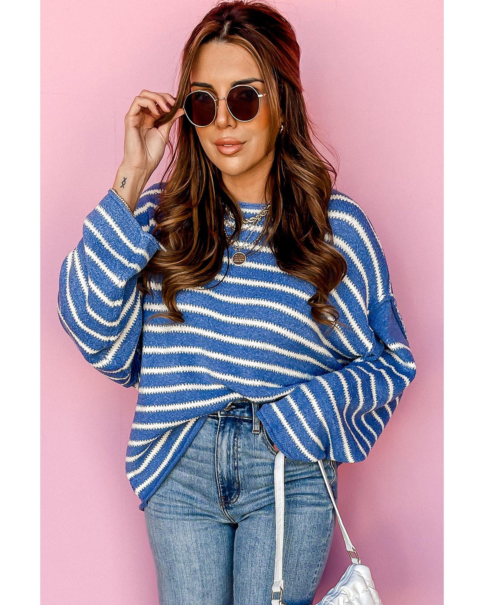 Sky Blue Stripe Drop Shoulder O Neck Plus Size Sweater – 3X