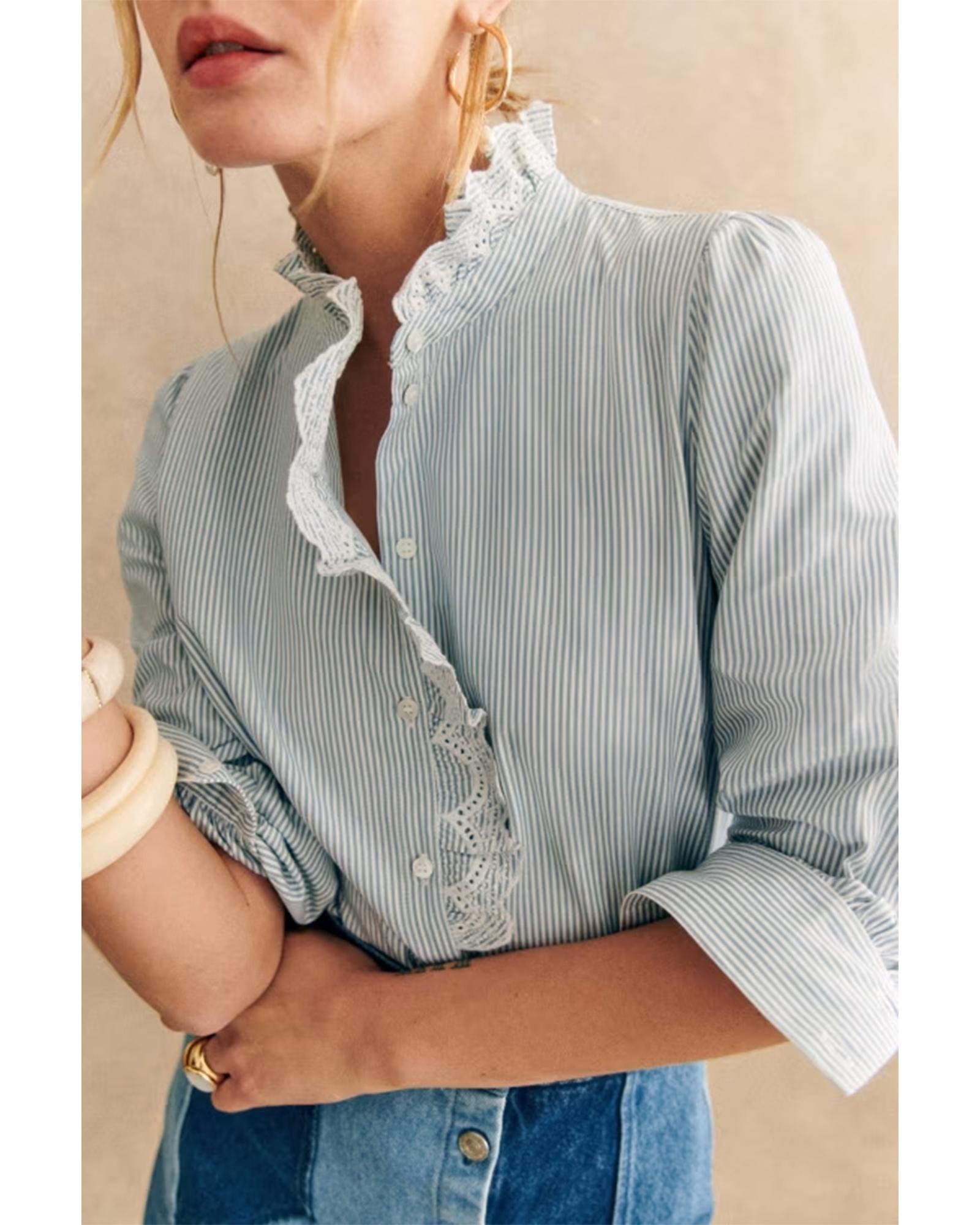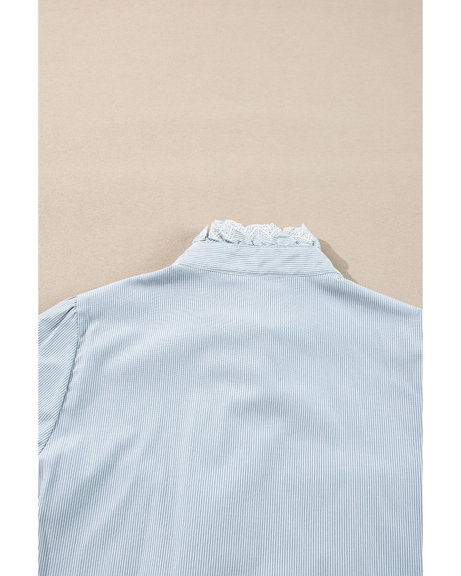 Sky Blue Stripe Frilled Trim Button Up Long Sleeve Shirt – XL