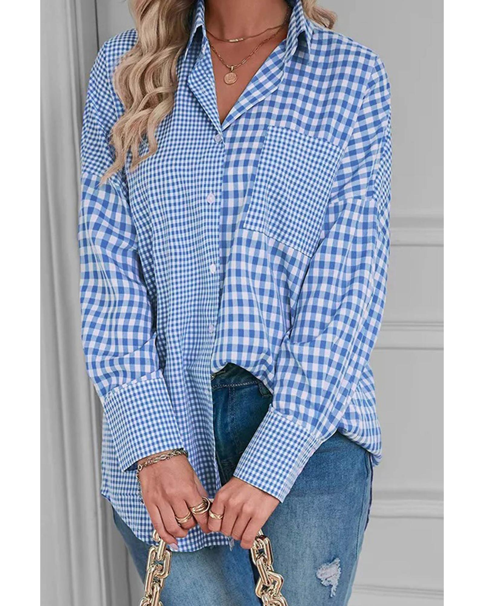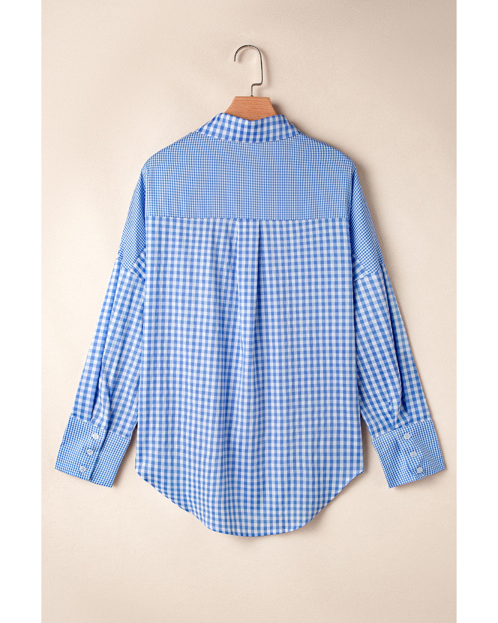 Sky Blue Stripe Plaid Patchwork Button up Long Sleeve Shirt – L