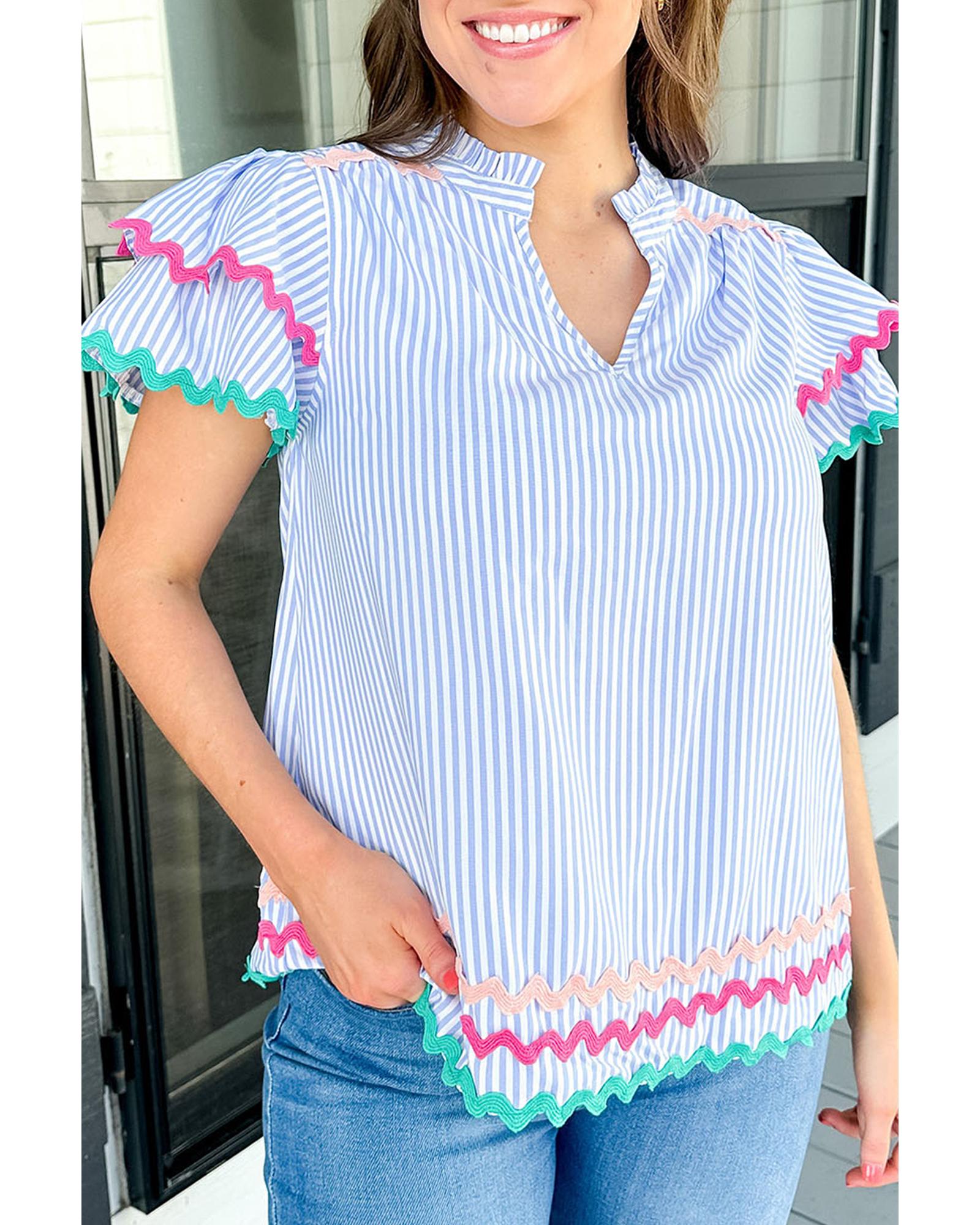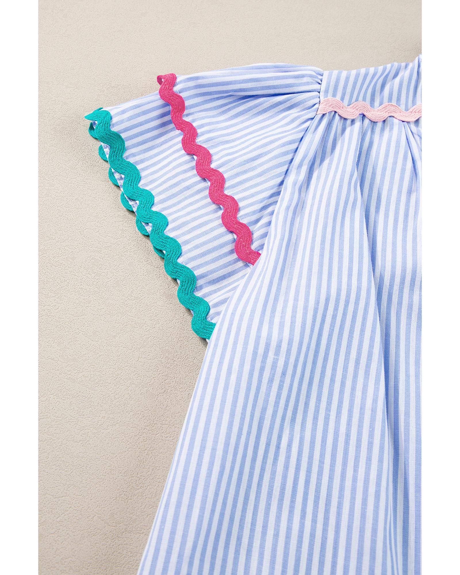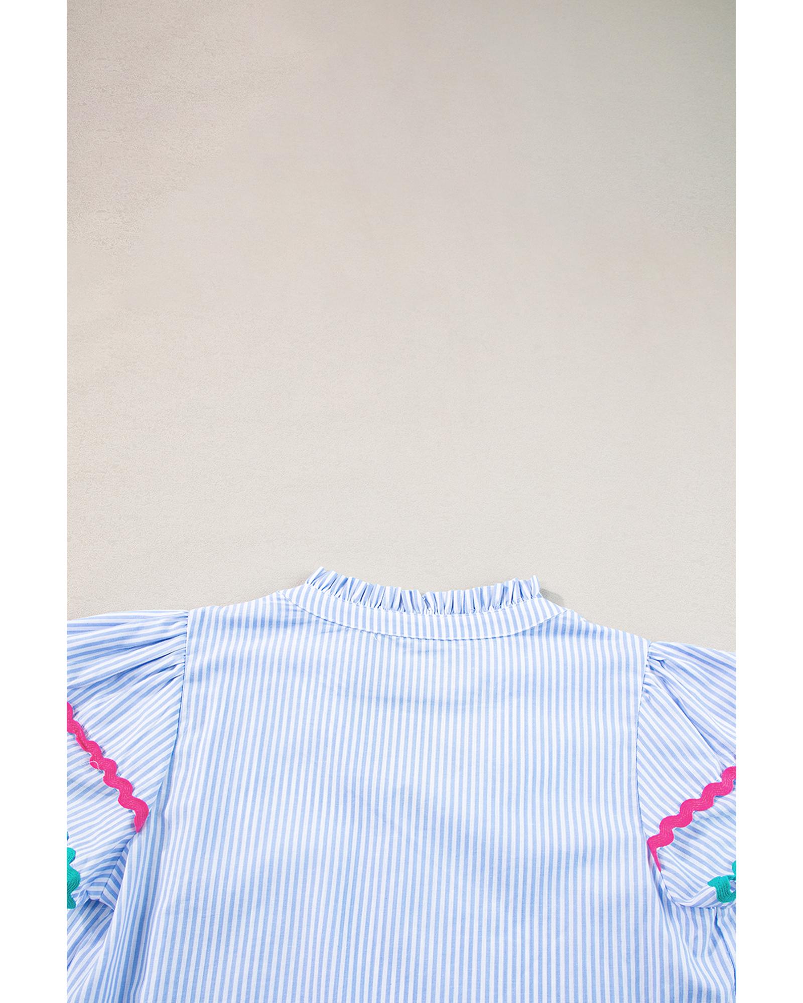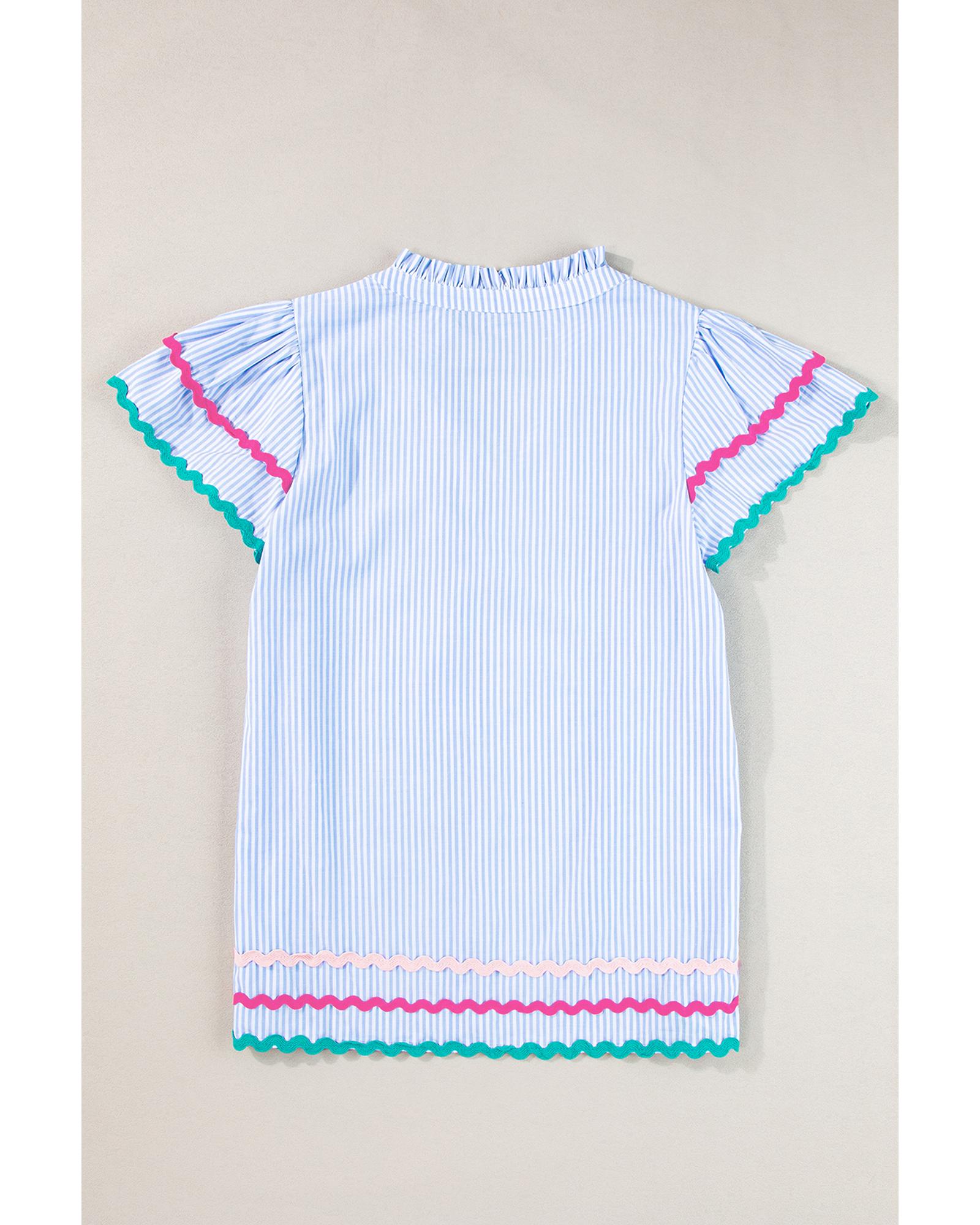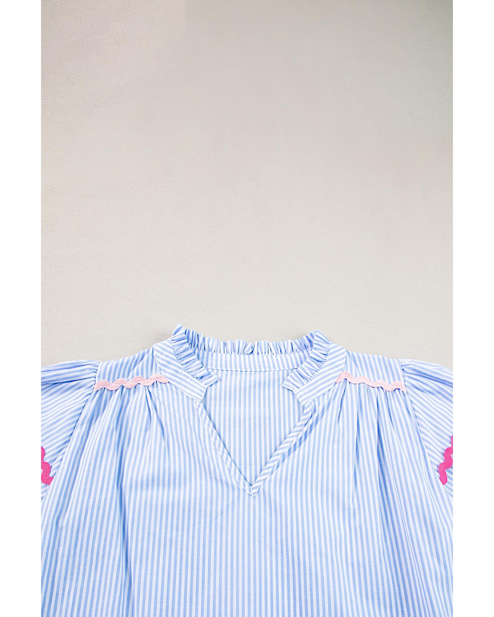 Sky Blue Stripe Ricrac Trim Split Neck Striped Ruffled Sleeve Blouse - L