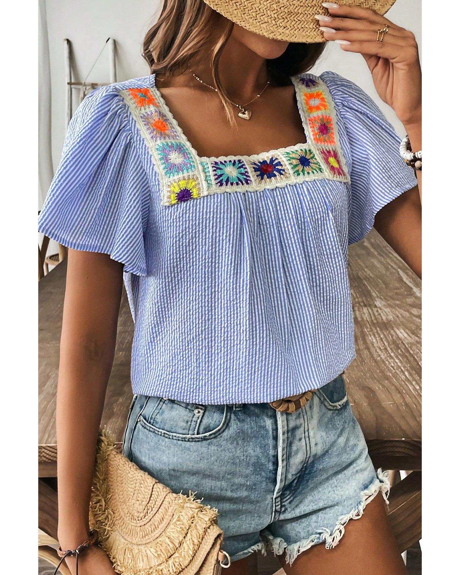 Sky Blue Stripe Textured Ruffle Short Sleeve Boho Detail Square Neck Blouse – M