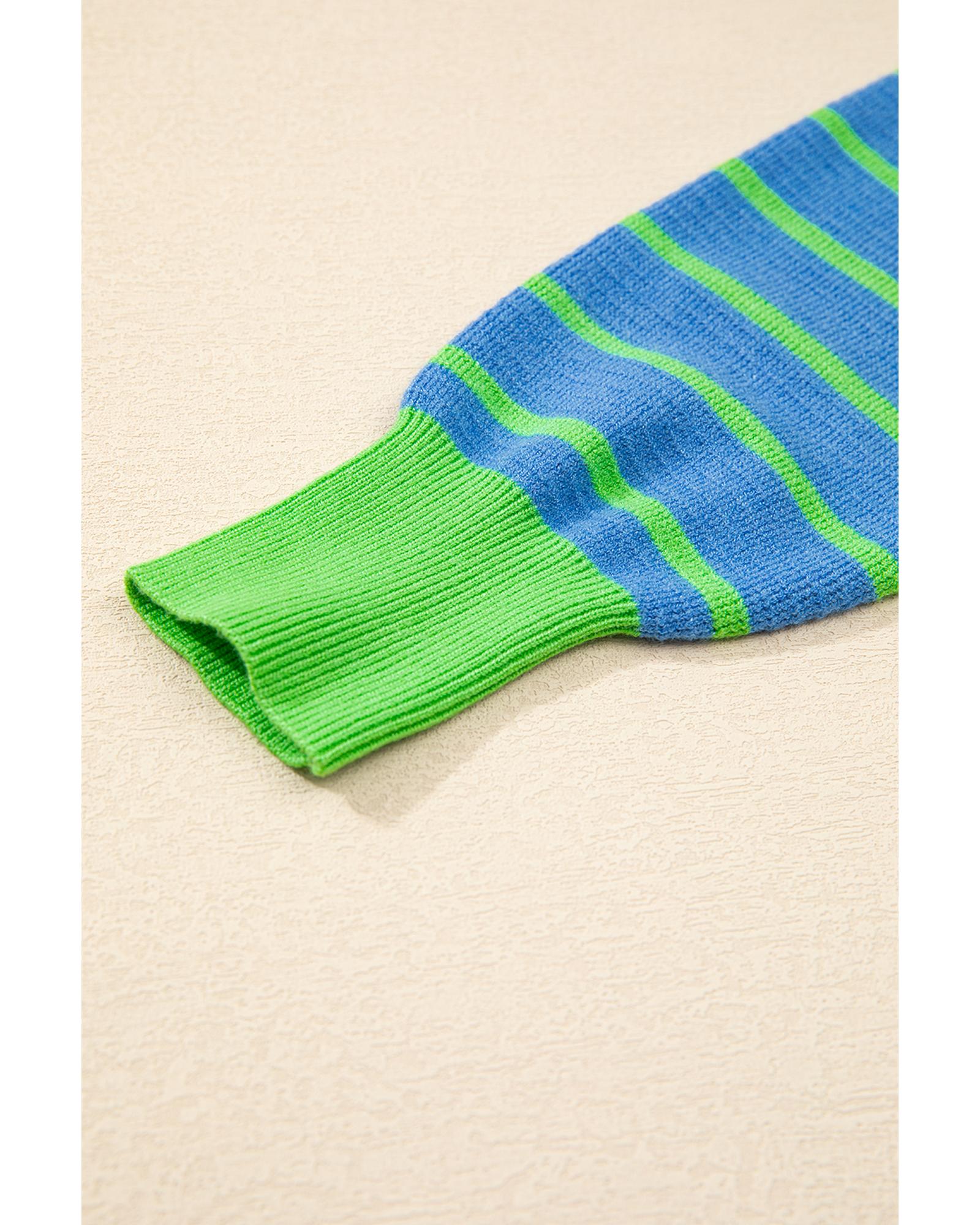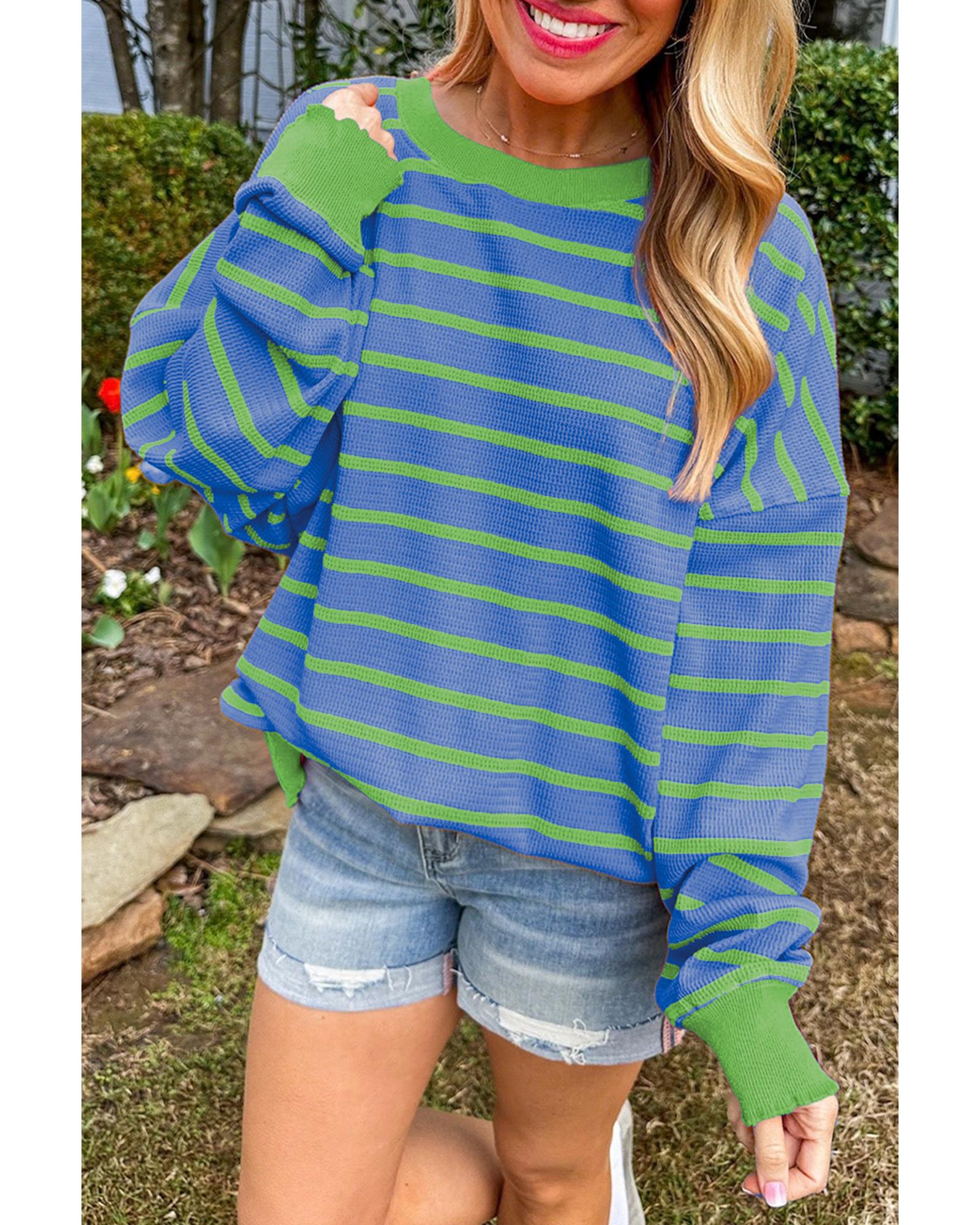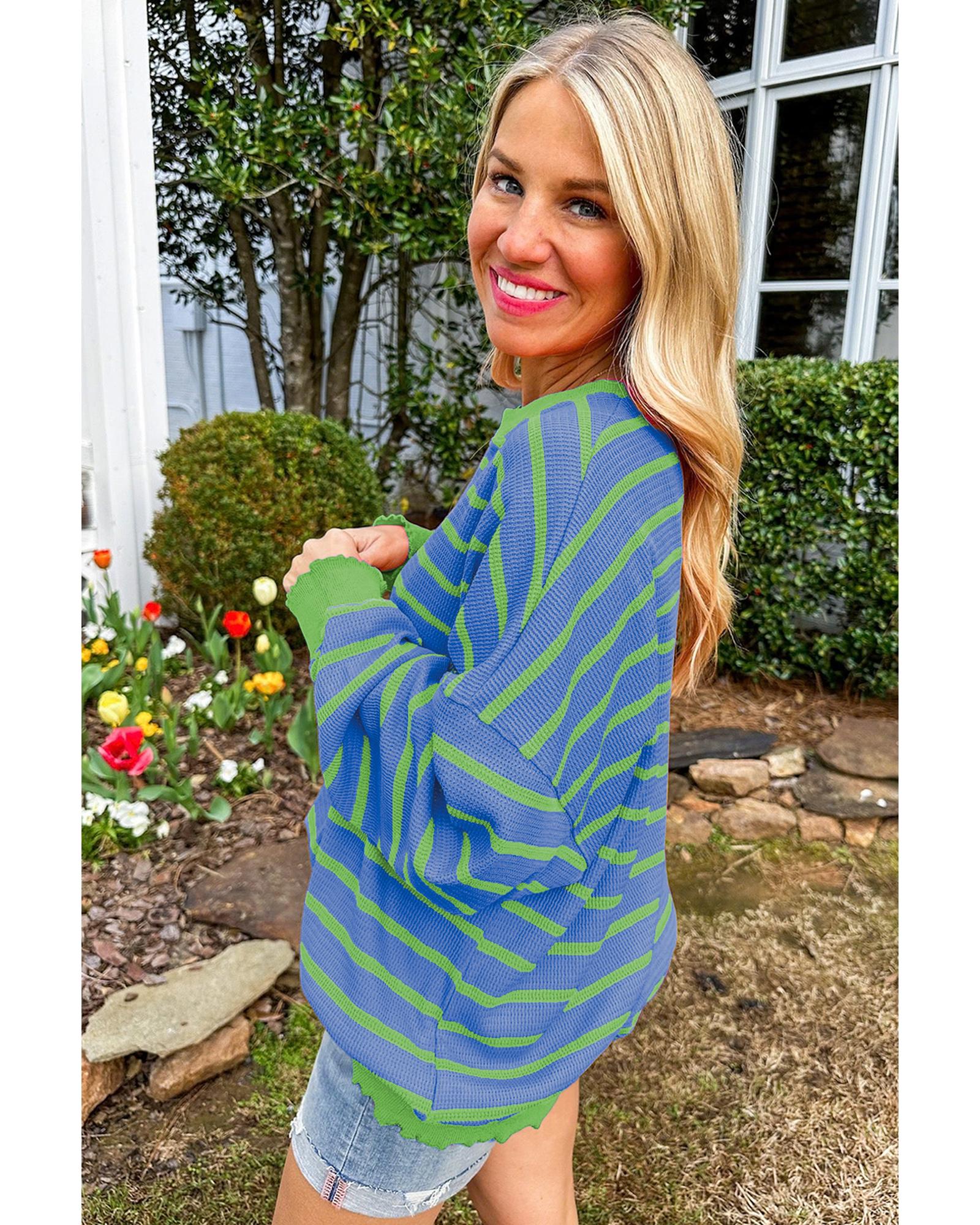 Sky Blue Stripe Trimmed Round Neck Drop Shoulder Loose Sweater – XL