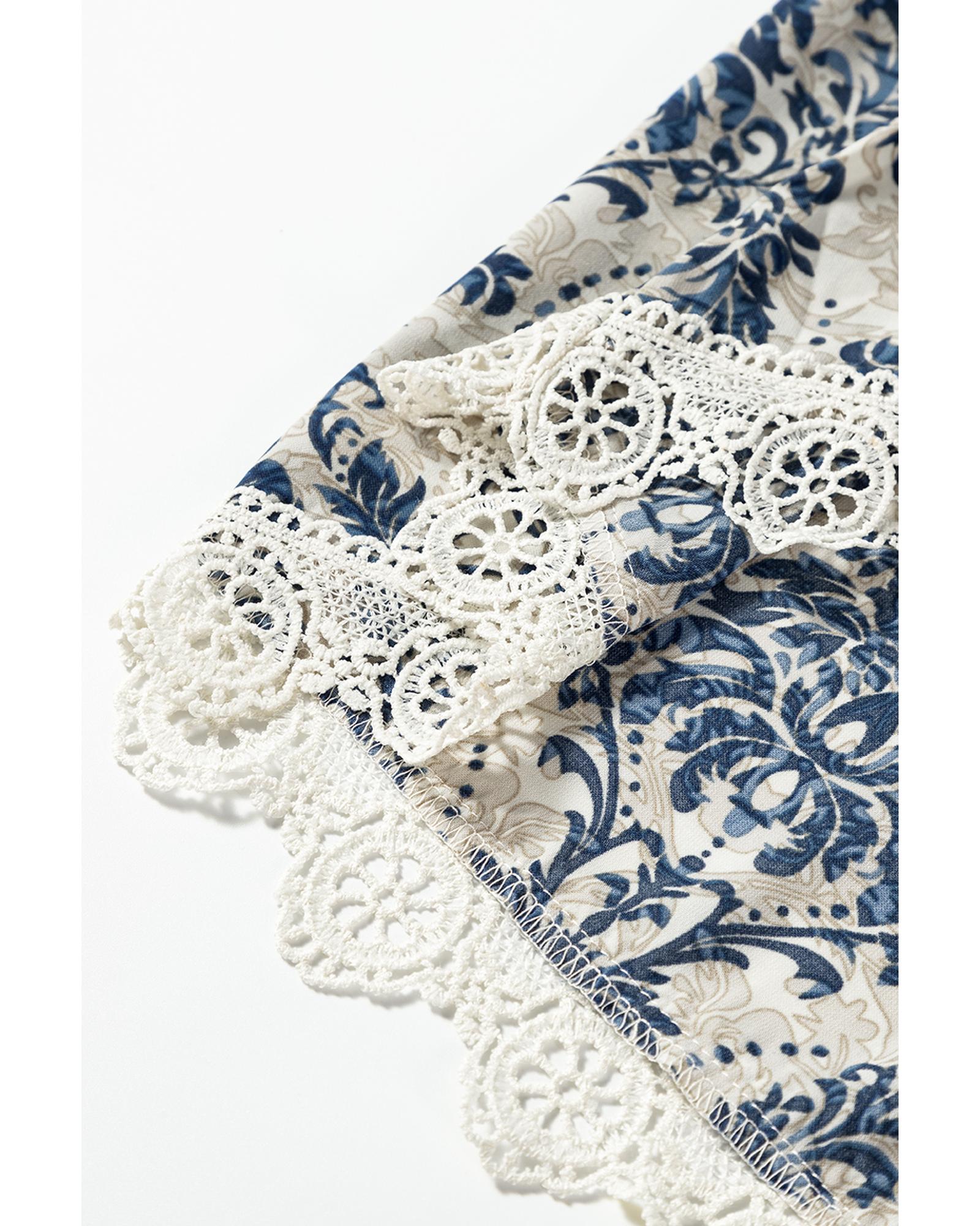 Sky Blue Vintage Printed Lace Trim V Neck 3/4 Sleeve Loose Dress - L